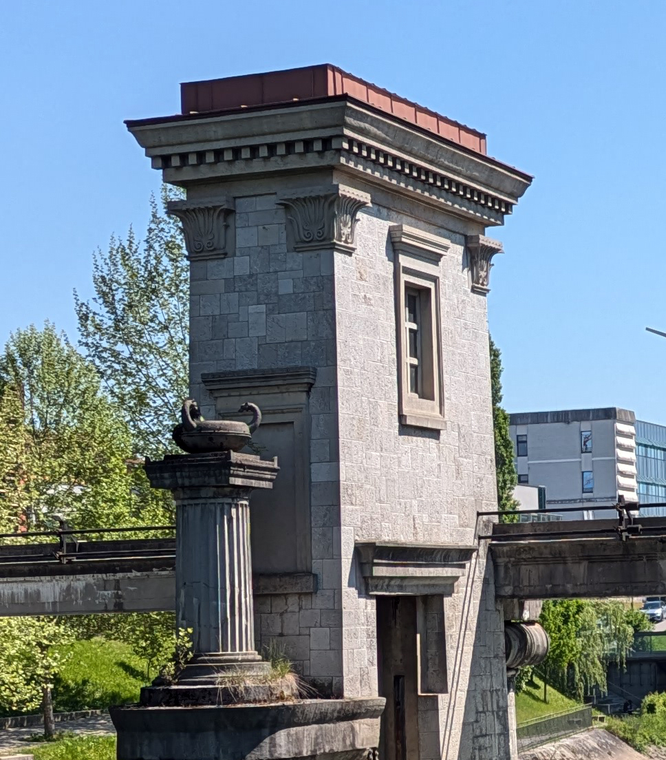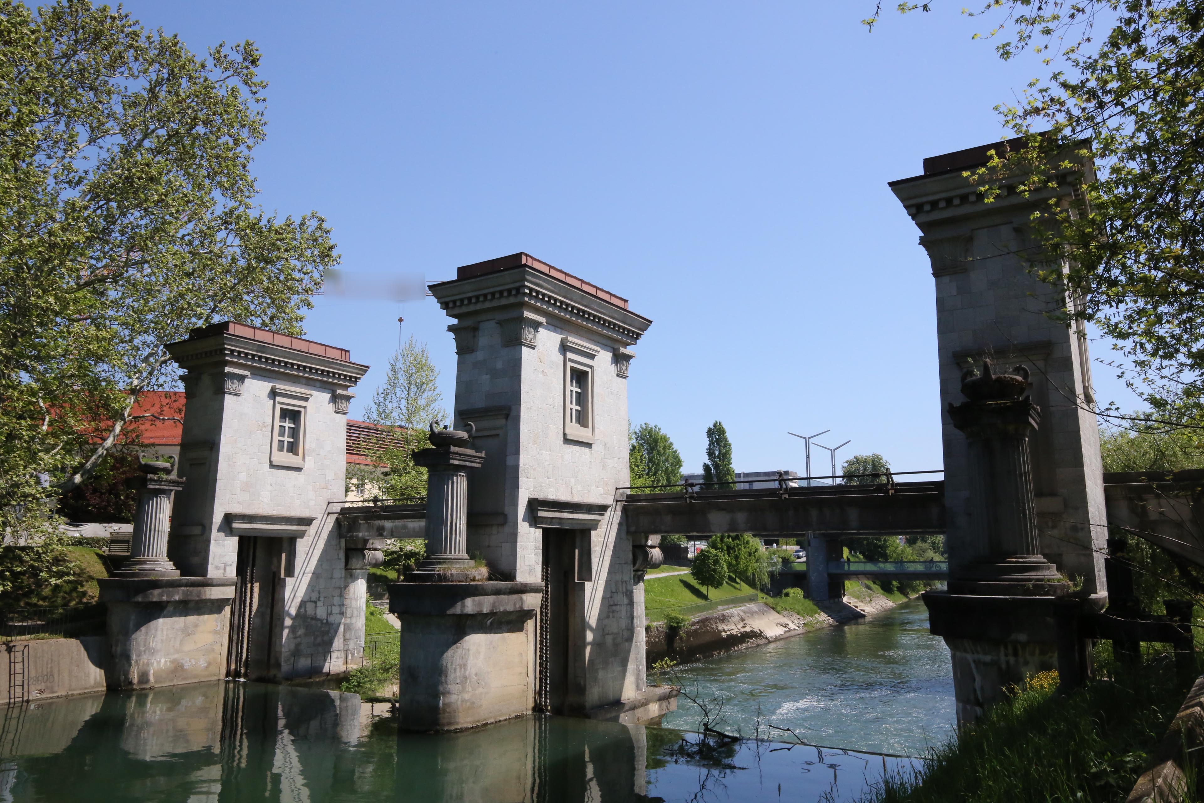 「Poljaneポリャネ堤防にある記念的な水門は、都市中心部における中央水軸の終端を示す構造物であり、リュブリャニツァ川が旧市街の集積地を離れ始める地点、ポリャネ橋の近くに位置している。この水門は、都市中心のプレシェーレン記念碑から約1キロの距離にあり、川の両岸を約24メートルにわたって横断している。三つの塔を備えた水上家屋として構想されたこの水門は、市街中心部を流れる川の水位と流量を調節する。 一つの支柱は川の中央に、他の二つは堤防上に直接設置されている。・・・塔の四隅には、巨大で輪郭の際立った・・・柱頭があり、それらは高さを増しながら平坦な屋根へとつながっている。・・・角柱の上に短いドーリア式の柱が立ち、柱頭には神話的グリフィンの頭部で装飾されたエトルリア風の人工石製花瓶が載せられている。・・・本来は純粋に機能的な構造物であるにもかかわらず、プレチニクはそこに美的かつ象徴的な装飾を施すことで、構造物の目的から意識を逸らし、空間に詩的な次元を与えている。⑱」