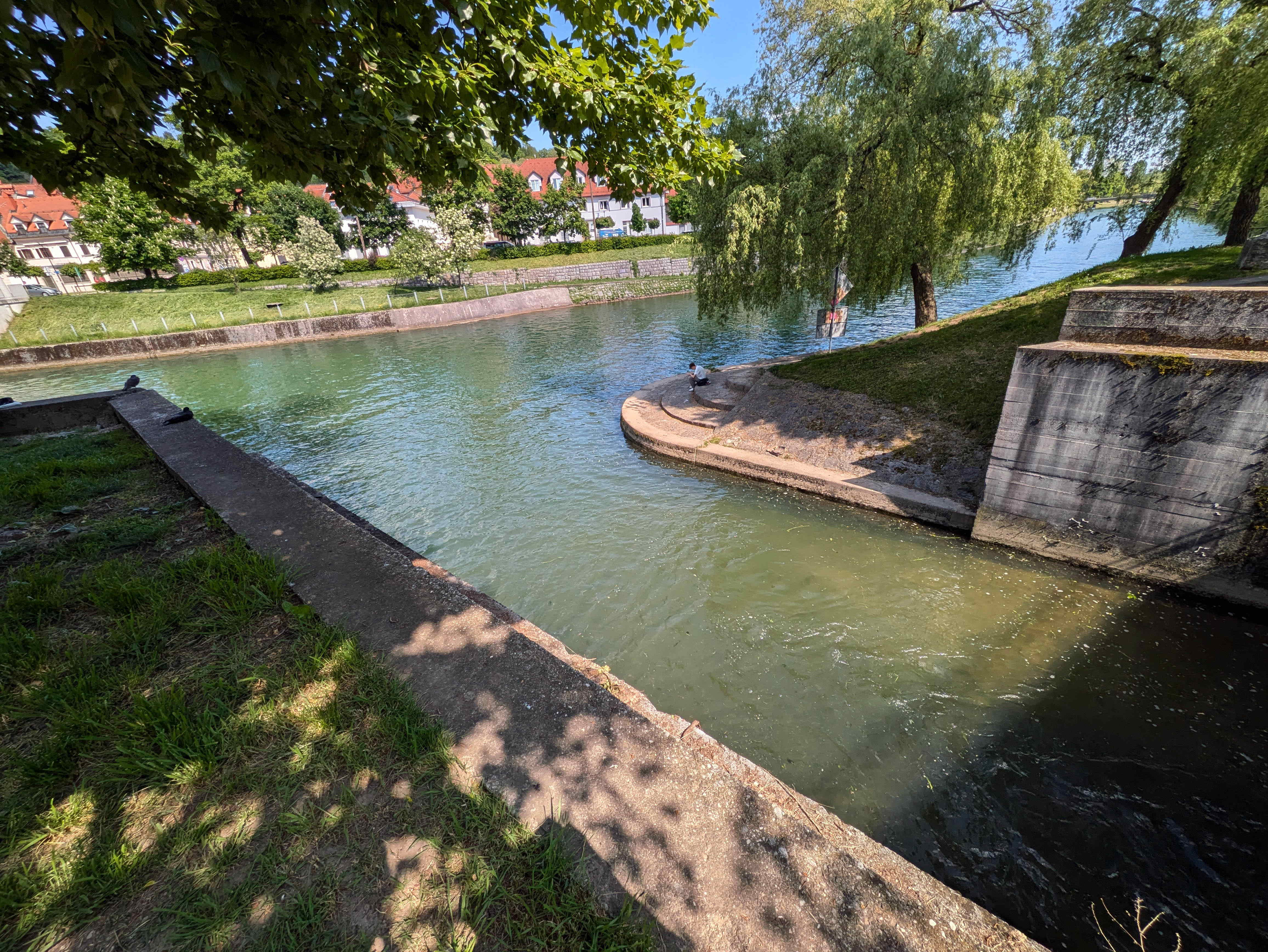 「トルノヴォ堤防は、リュブリャナ市トルノヴォ地区のリュブリャニツァ川沿いに位置しており、町の中心にあるプレシェーレン記念碑から1キロ少々離れた地点に終点を持つ。堤防は、プルレ橋からグラダシュチツァ川がリュブリャニツァ川に合流する地点まで、約400メートルの湾曲した構成で延びている。この堤防は、リュブリャニツァ川に沿って蛇行する・・・細長い空間として設計されており、川面から街路レベルへと緩やかに上昇している。川沿いには石段が一定のリズムで並び、その上には柳の並木に沿った砂地の歩道が続き、さらにその上にはトルノヴスカ通りに向かって上昇する芝生の堤が設けられ、最上部は高さ1メートルの生垣で締めくくられている。・・・プレチニクは柳を10メートル間隔で植栽し、堤防全体にわたって並木を形成した。⑭」
