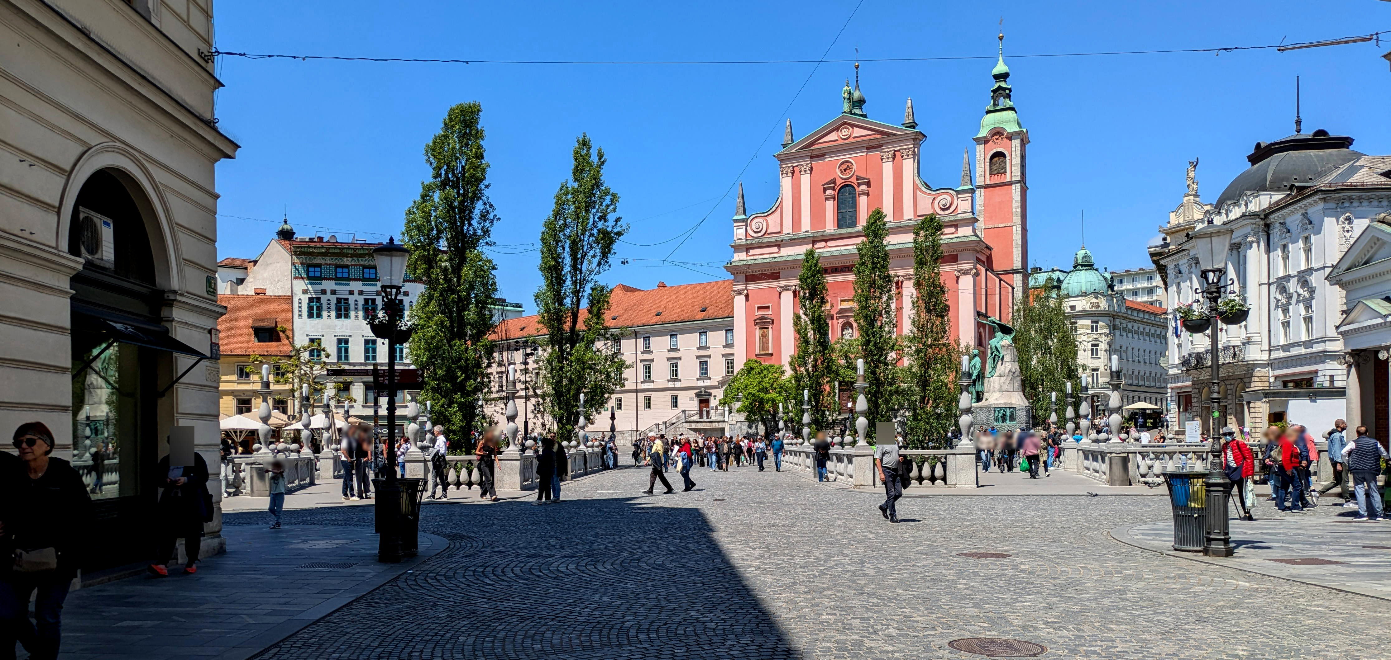 ピンクのフランシスコ教会の前のプレシェレン広場から三本橋を渡って見たところ