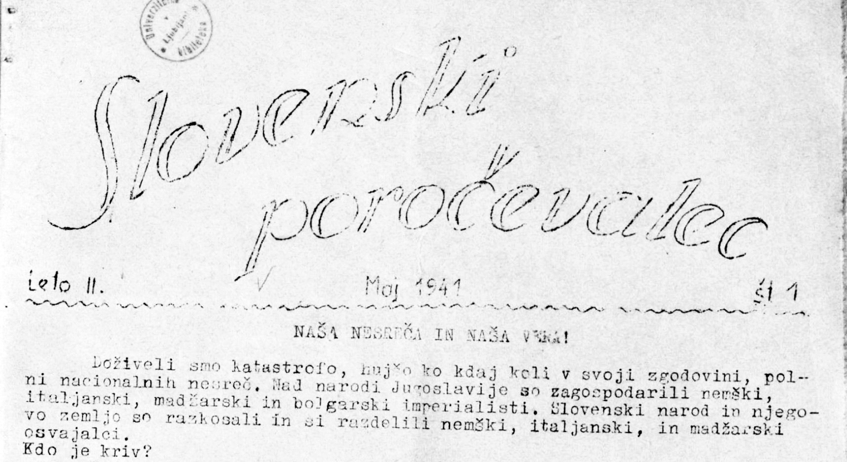 本画像は、1941年発行の『Slovenski poročevalec』第1号(1941年5月)および第2号(1941年6月8日)の紙面から、見出し部分を抜粋・比較したものです。 著作権保護期間はすでに満了しており、スロヴェニア国立電子図書館(dLib.si)にて公的に公開されている資料を教育目的で使用しています。 視認性向上のため、紙面の黄ばみを除去し白背景に補正しています。原資料出典:dLib.si – Slovenski poročevalec, št. 1–2, maj–junij 1941(https://www.dlib.si)