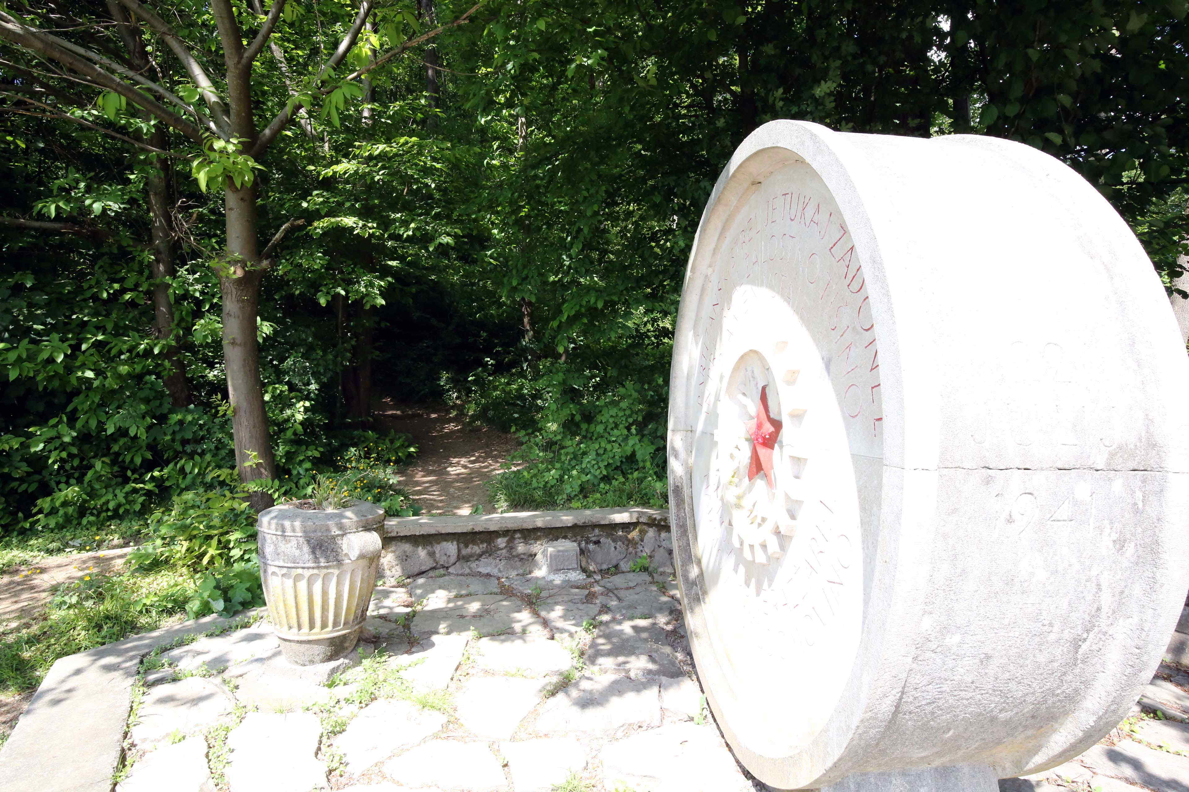 記念碑には、パルチザンのシンボルの赤い星とその各尖頭の間に炎のようなものが吹き出すデザインがなされ、周りに「ここでのパルチザンの発砲は 轟き渡り、悲しみの静寂を引き裂いた