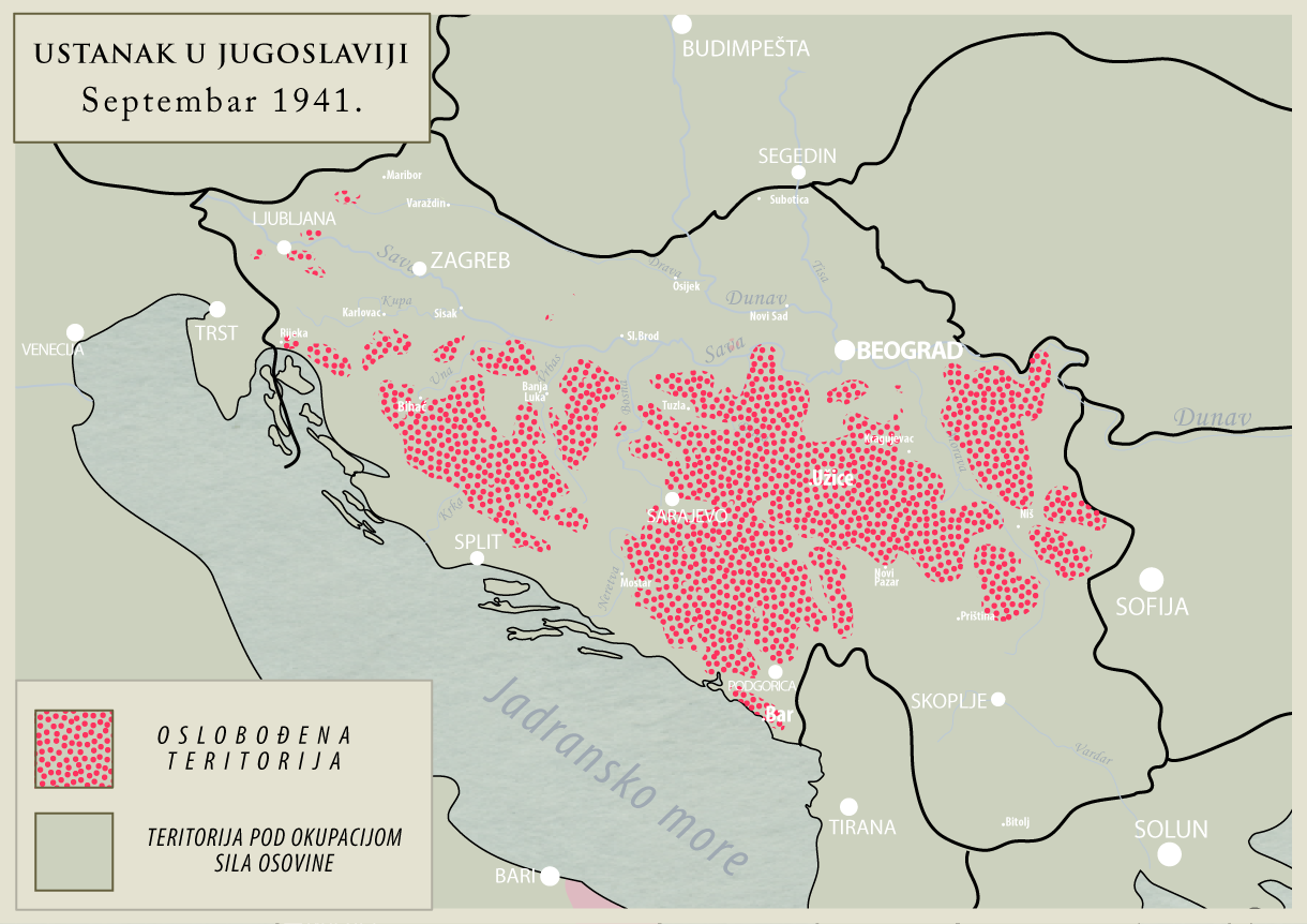 赤い点で示されているoslobojena teritorijaとは「解放された領域」で、パルチザンが占領軍から奪還し、実効支配していた地域のこと。Užiceの地名もある。