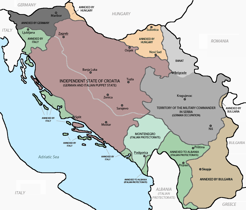 ユーゴスラビアは、ドイツ、イタリア、ハンガリー、ブルガリアの分割占領となり、またセルビアの中央政府と対立していたクロアチアは、枢軸国の思惑から、「クロアチア独立国」という傀儡国家として「独立」を認められた。「クロアチア独立国」はドイツとの協定違反の形で国境沿いの5ゕ村約20km2を占領した。それぞれの占領地は「本国に併合する形をとった。⑤」