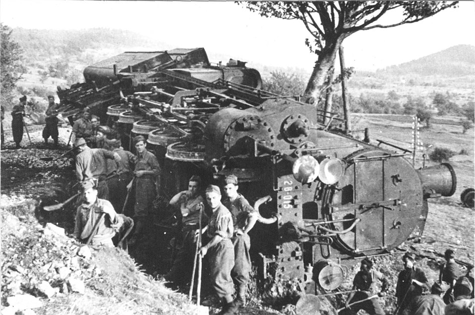 1941年10月4日、スロベニア・パルチザンによるリュブリャナ–トリエステ間鉄道線での破壊工作。兵士たちは対応しているイタリア兵だと思われる。出典:『Diverzija na pruzi Ljubljana–Trst 1941』 所蔵:ユーゴスラビア歴史博物館(Inv.br. 16596) ライセンス:Public Domain(著作権消滅) 教育目的で使用しています。