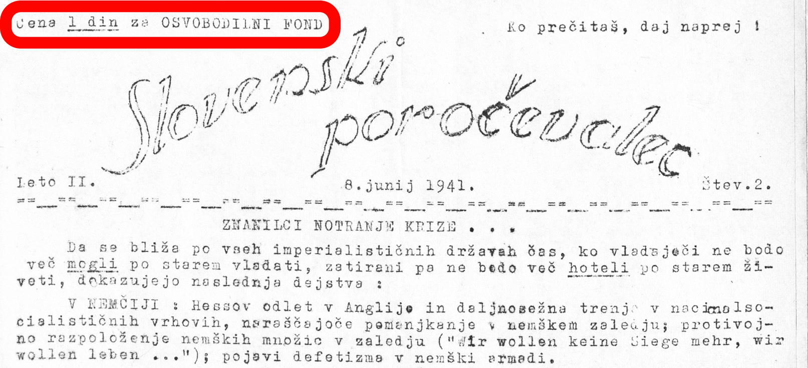 反帝国主義戦線の機関紙『Slovenski poročevalec(スロヴェニア報道者)』第1号(左)、第2号(右)。私が赤線で囲ったところに「Cena 1 din za OSVOBODILNI FOND(解放基金のための価格:1ディナール)」とある。