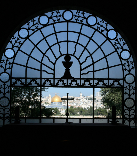 右は、「主の泣かれた教会」の西の窓。真ん中にイエスを示す杯のデザイン。人間がイエスという杯から飲んで(イエスが命をささげるということ)救われることを示している。今は神殿はなく、イスラム教の聖地「岩のドーム」の金色がまぶしく見える。