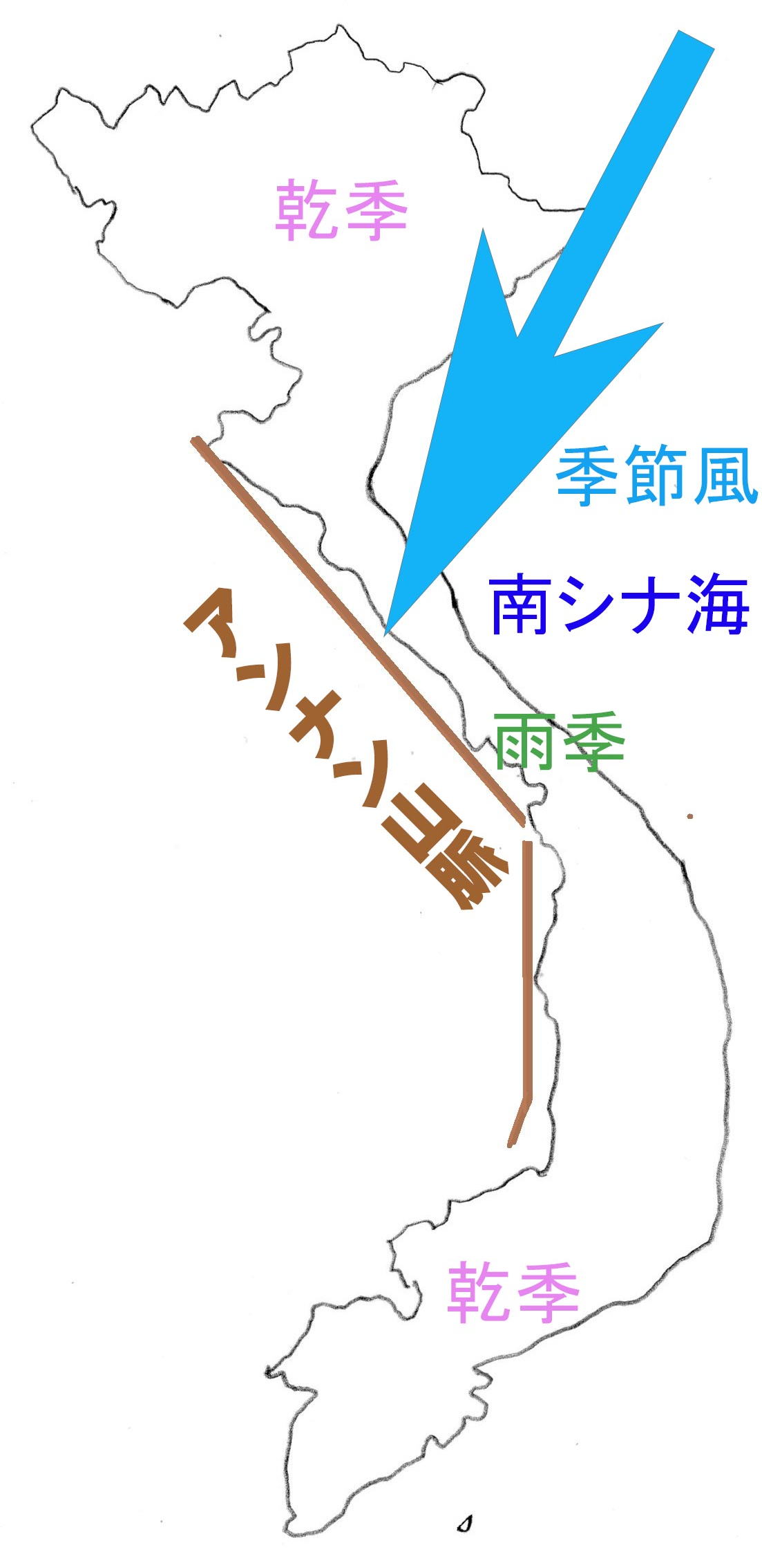 すなわち、「11月から4月にかけては、中国の内陸から冷たいかわいた北東風がベトナム北部にふきこみます。ところが中部に向かう風は、南シナ海の上を通るので多くの水分を吸い込み、・・・山脈にぶつかって風上の中部沿岸に雨を降らせ、この地方を雨季にします。そして、山脈の風下にあたる南部では乾季になるのです。・・・一方、5月から10月までは、高温で湿った南西風が、インド洋からシャム湾を通って・・・山脈の手前のベトナム南部にふきつけ、雨を降らせます。この風はさらに、南シナ海やトンキン湾で再び水分を吸収し、・・・南南東の風となってベトナム北部にふきこみ、・・・蒸し暑い雨季にします。」(『目で見る世界の国々164 2東南アジア』TBSブリタニカ p.29)![]()