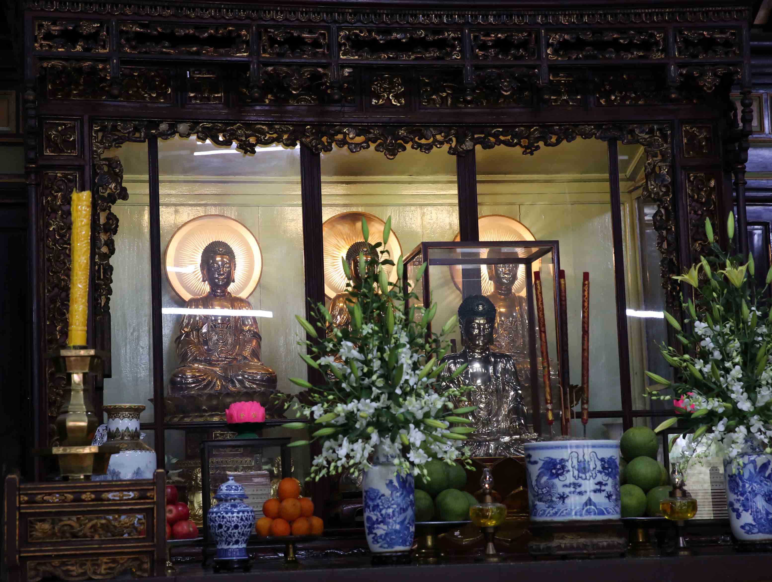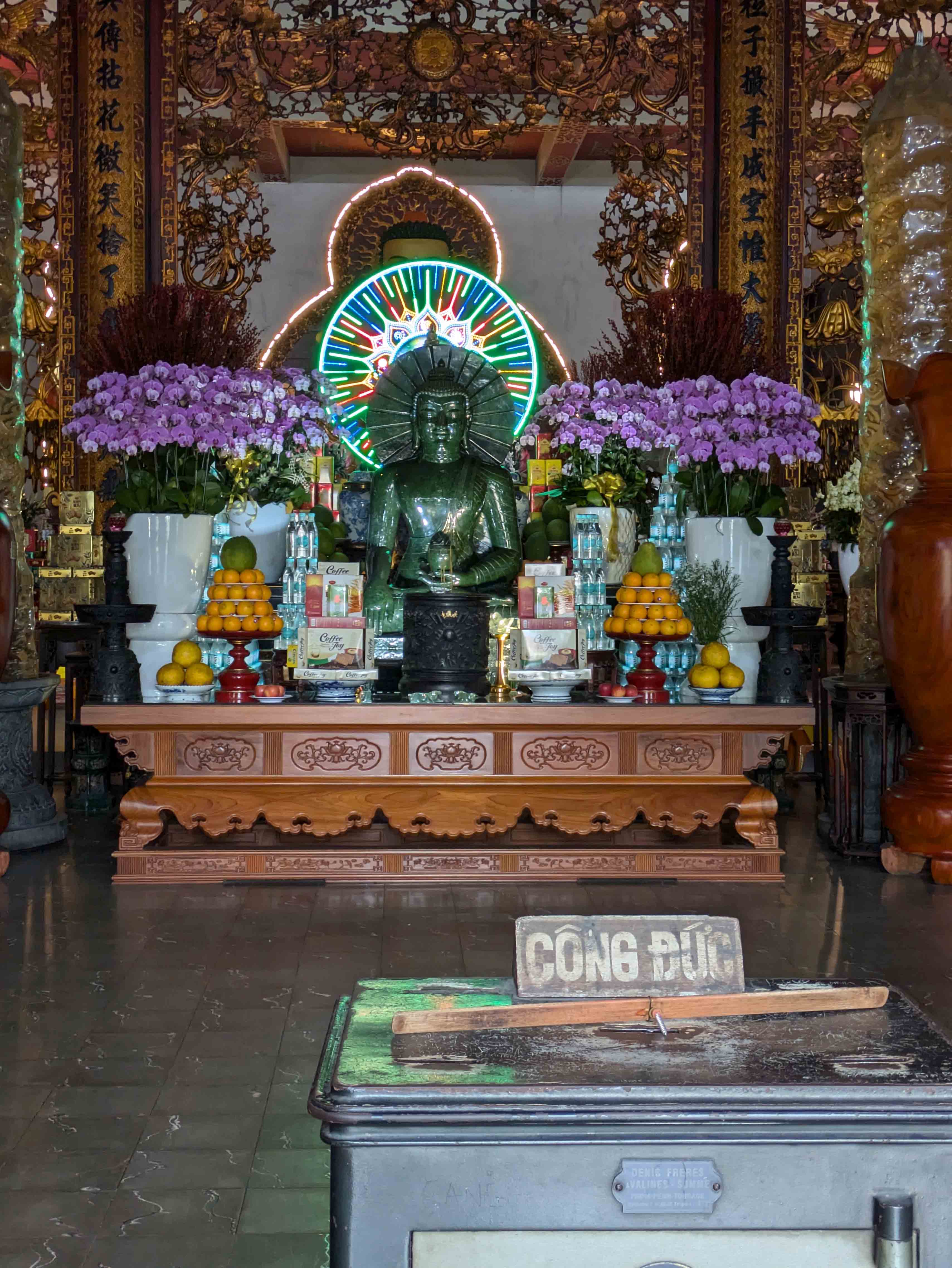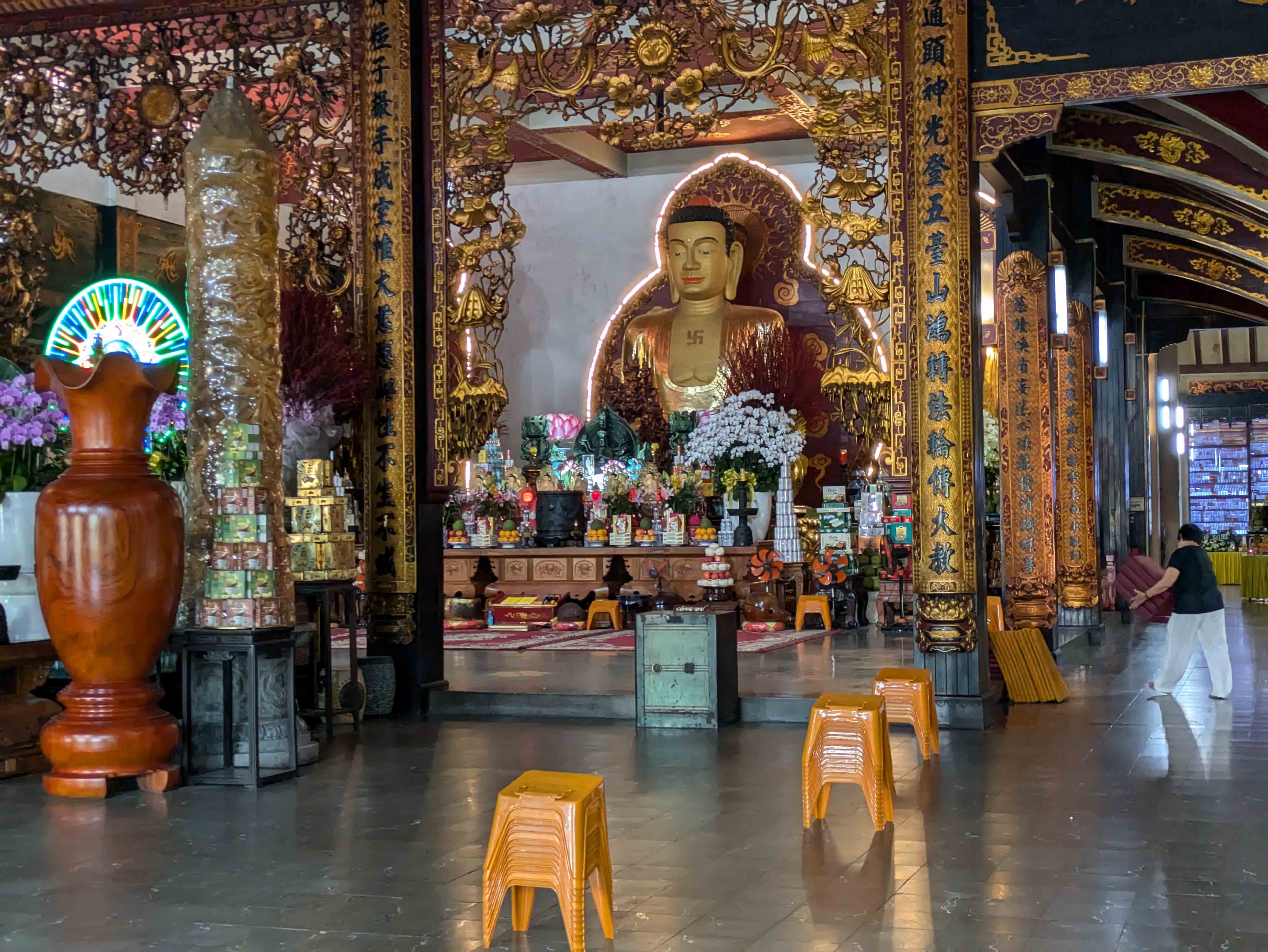 フエのテイエンムエン寺。居合わせた僧の方にお訊きしたら、三体は同一の仏で、過去、現在、未来で救済を行う仏だとのこと。