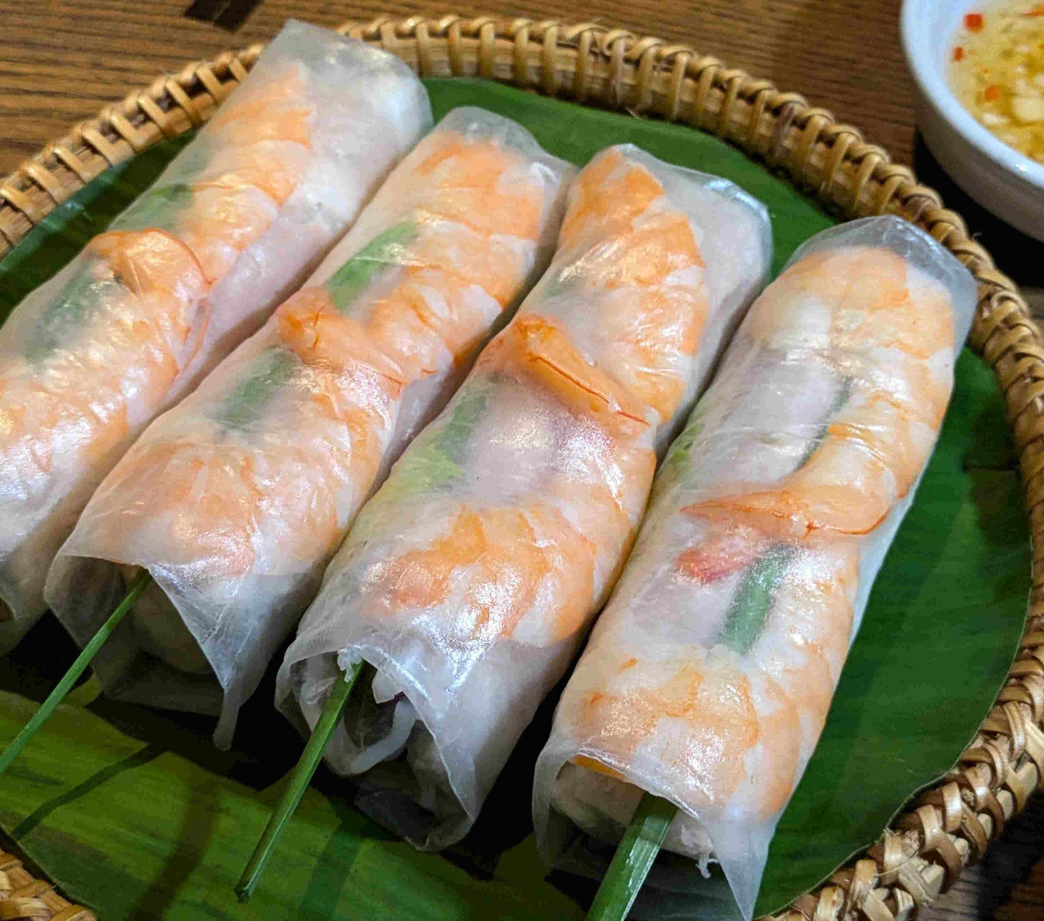 左が海老を揚げたものなど。中が揚げ春巻き。豚ひき肉、もやしなど野菜入り。右が本場の生春巻き海老入り。