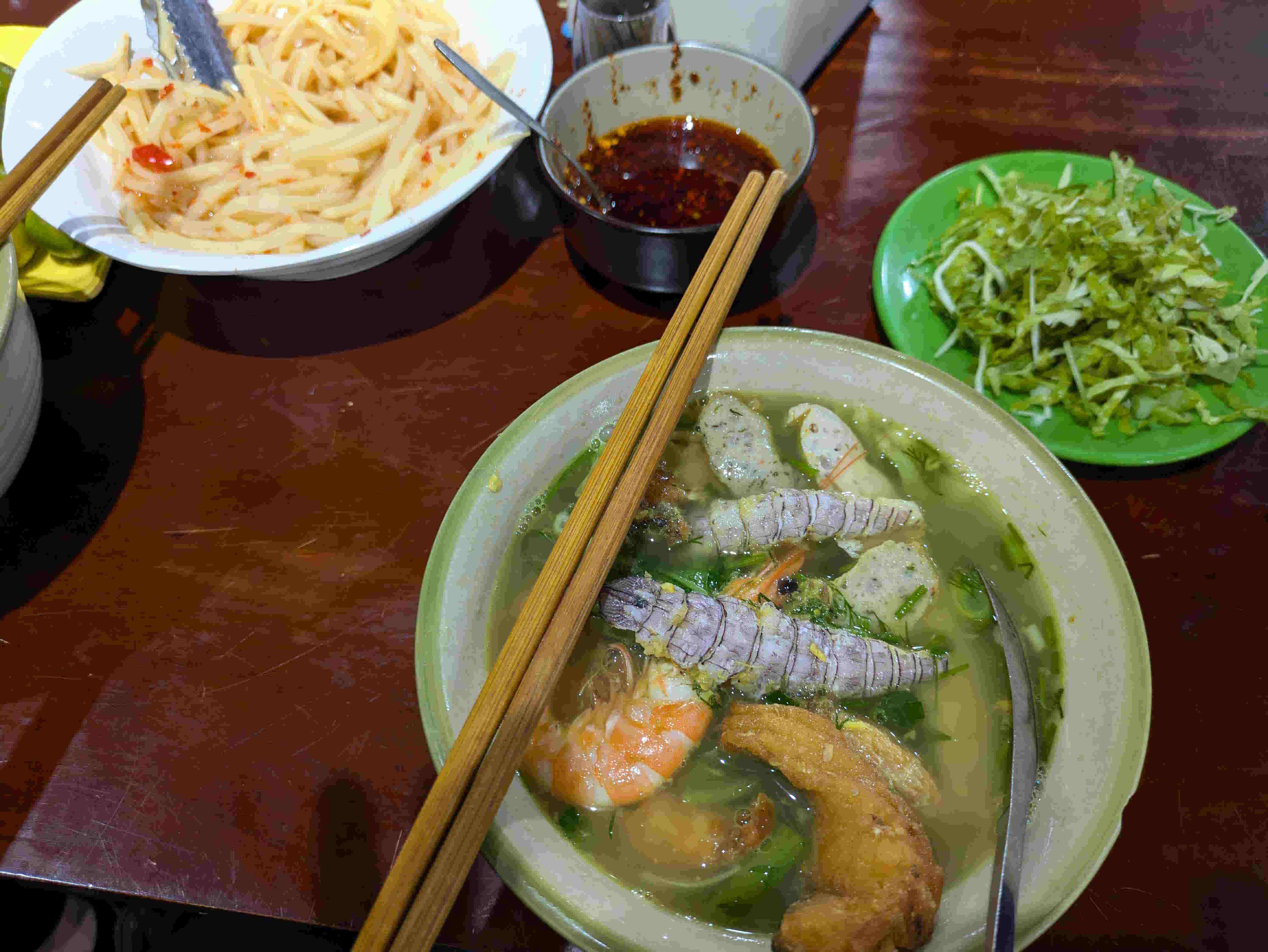 旅行中一、二を争う美味しさだった海鮮麺。出汁は海鮮中心であろう。海老、蝦蛄、蒲鉾のようなすり身が入っていた。好みで、ラー油、酸味と辛味の細かく切って茹でたタケノコ、ハーブを入れる。