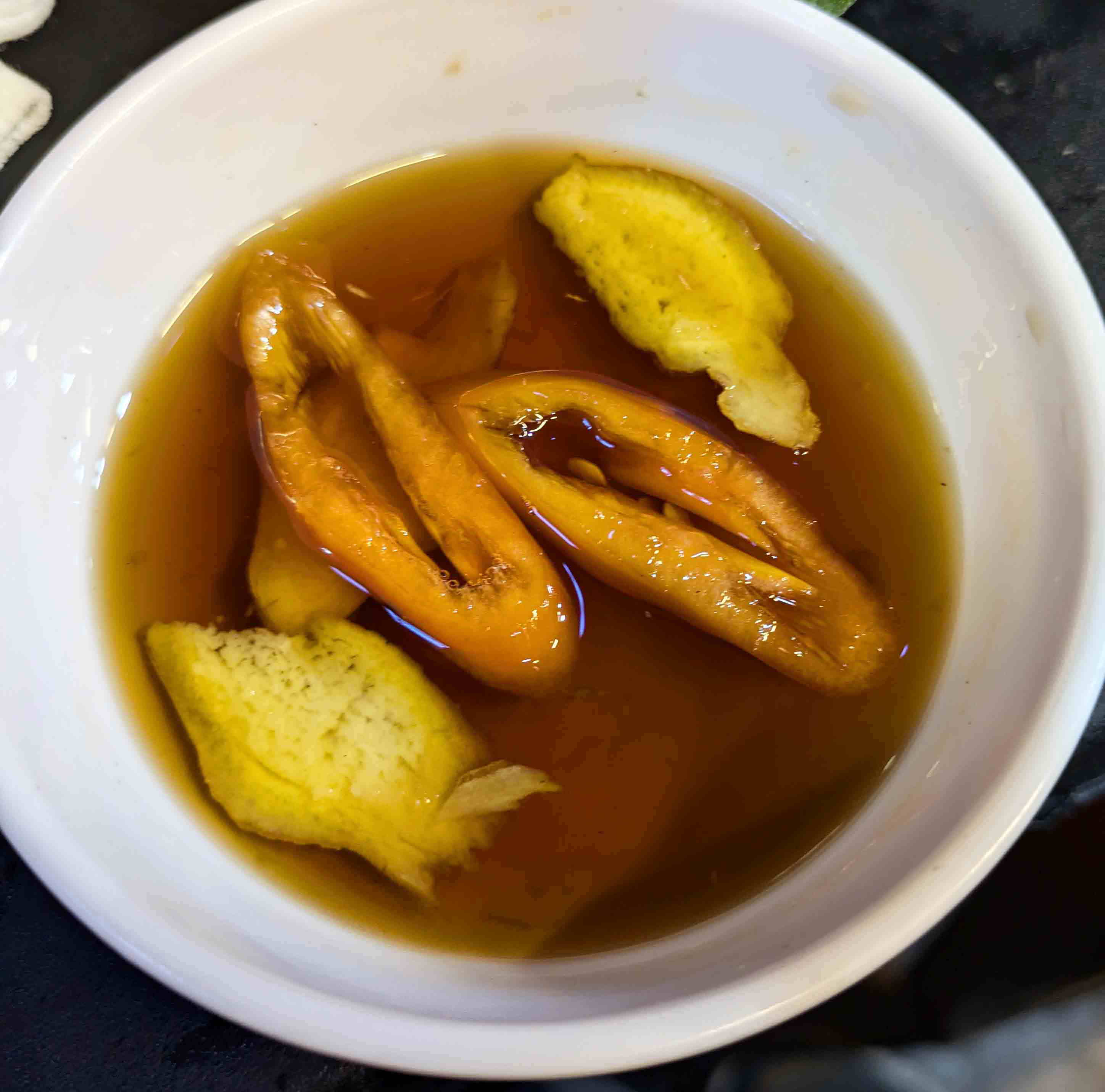 茹でた海老に付ける三つの「たれ」。下は先ほど紹介したヌックマム。真ん中はベトナム醤油(日本のものより旨味がない)。上は私が12月に初めて接して気に入った、Muối tiêu tắc(ムオイ・ティ・タック)という、塩味がまろやかな天日塩+胡椒+唐辛子+金柑絞り汁