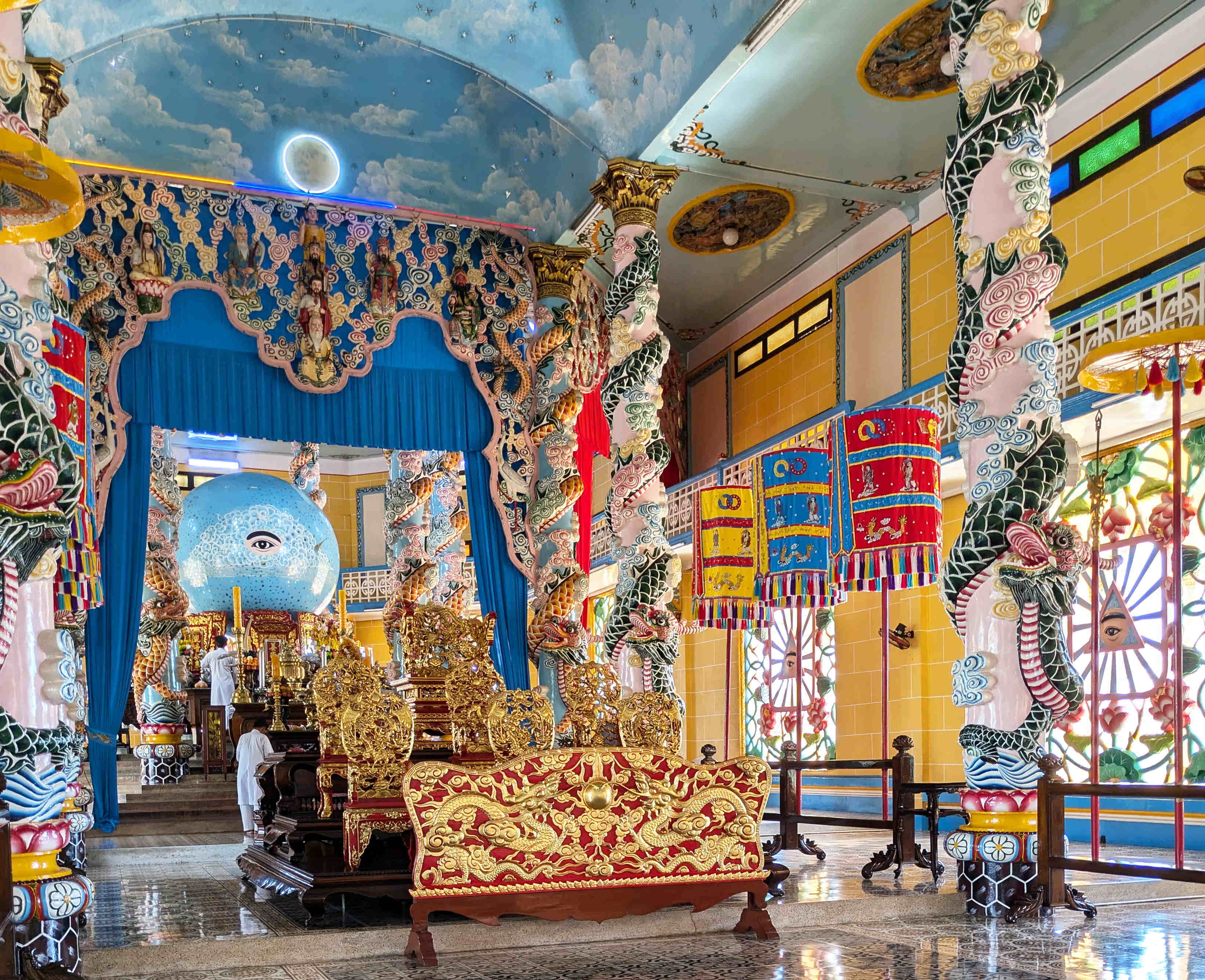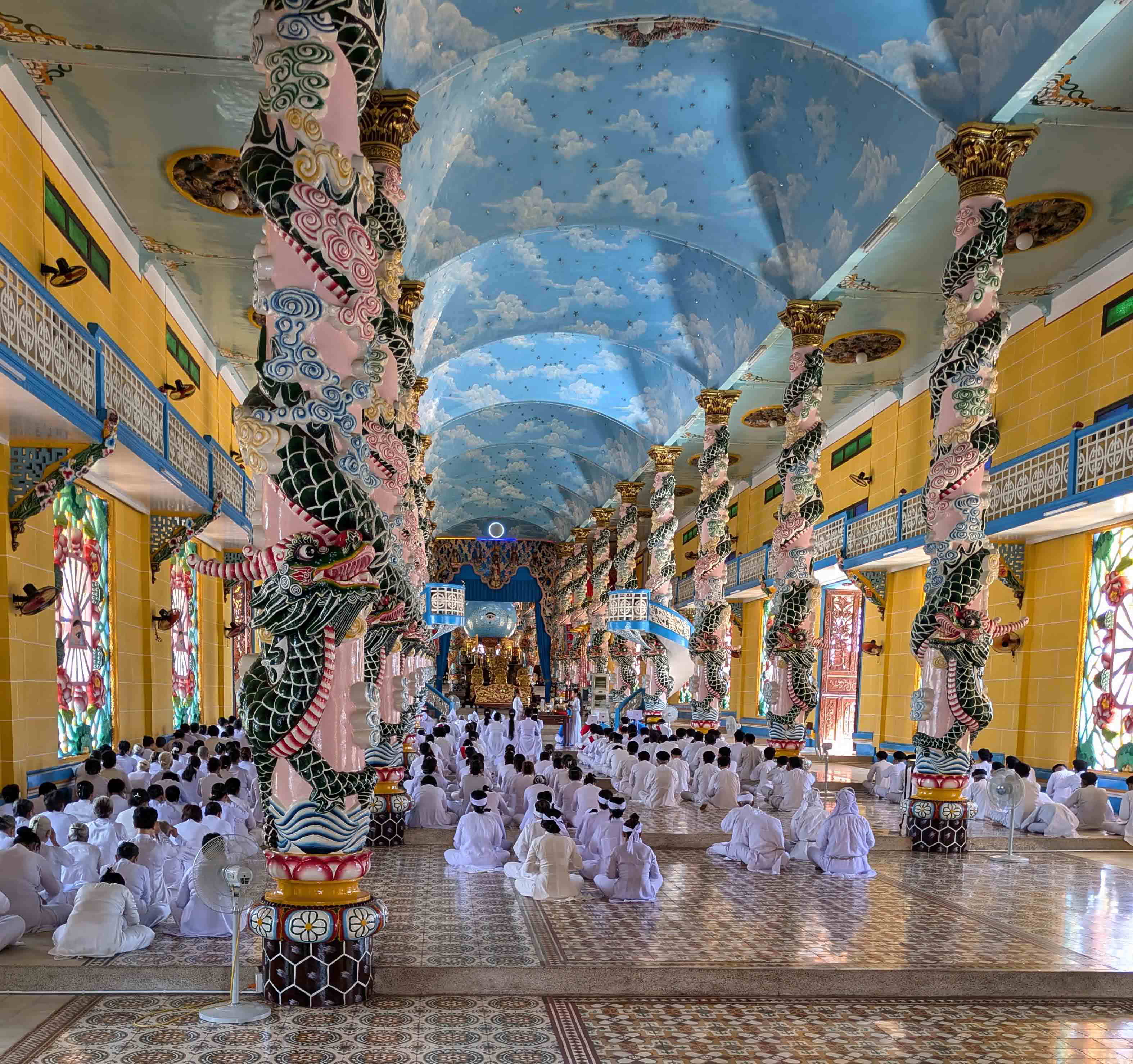 この本部がタイニンにある。私はこのような宗教にあまり興味は無いが、ここはよくクチトンネルとセットでツアーが組まれるので、好奇心から、クチの観光後、行って見ることにした。ちょうど行ったとき、信者たちが礼拝し終わるところで、その場面を撮らせてもらったり、皆が退出した後、その「天眼」も撮影させてくれるなど、写真撮影に寛容だった。
