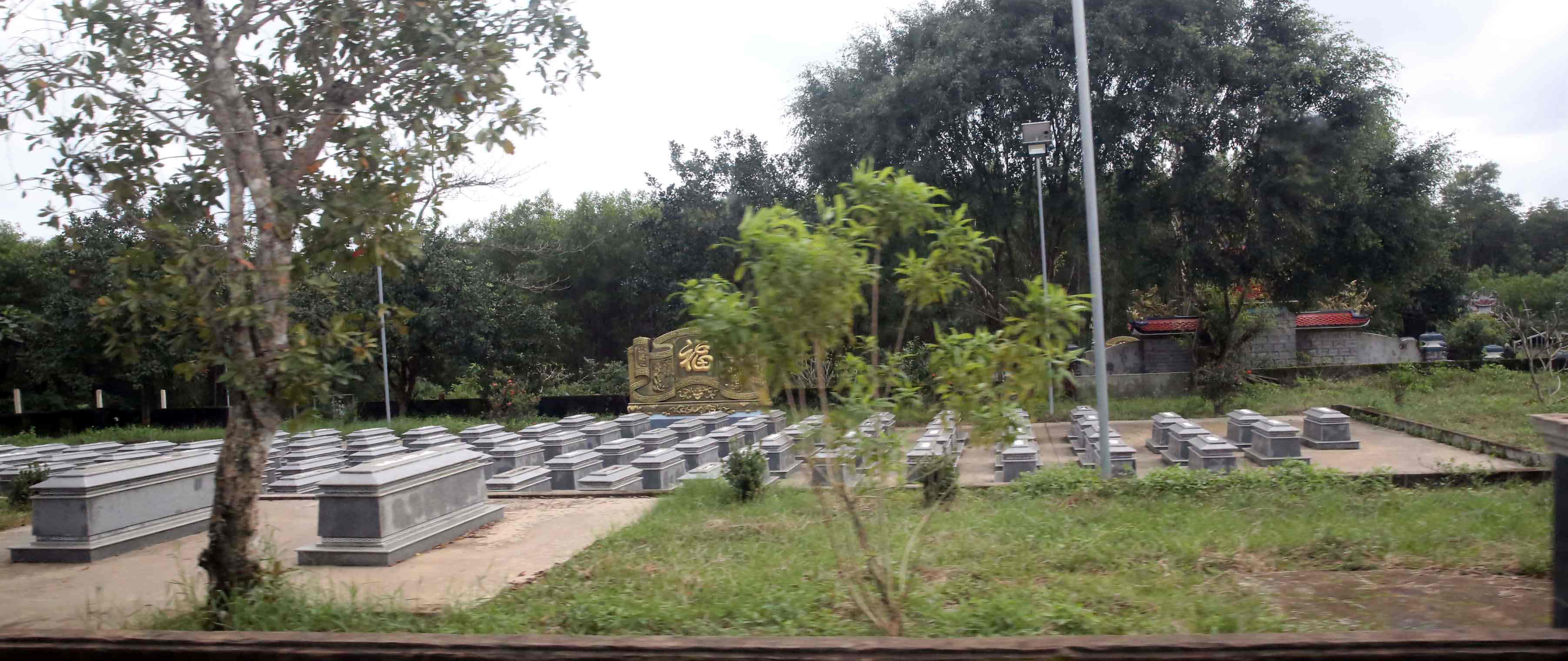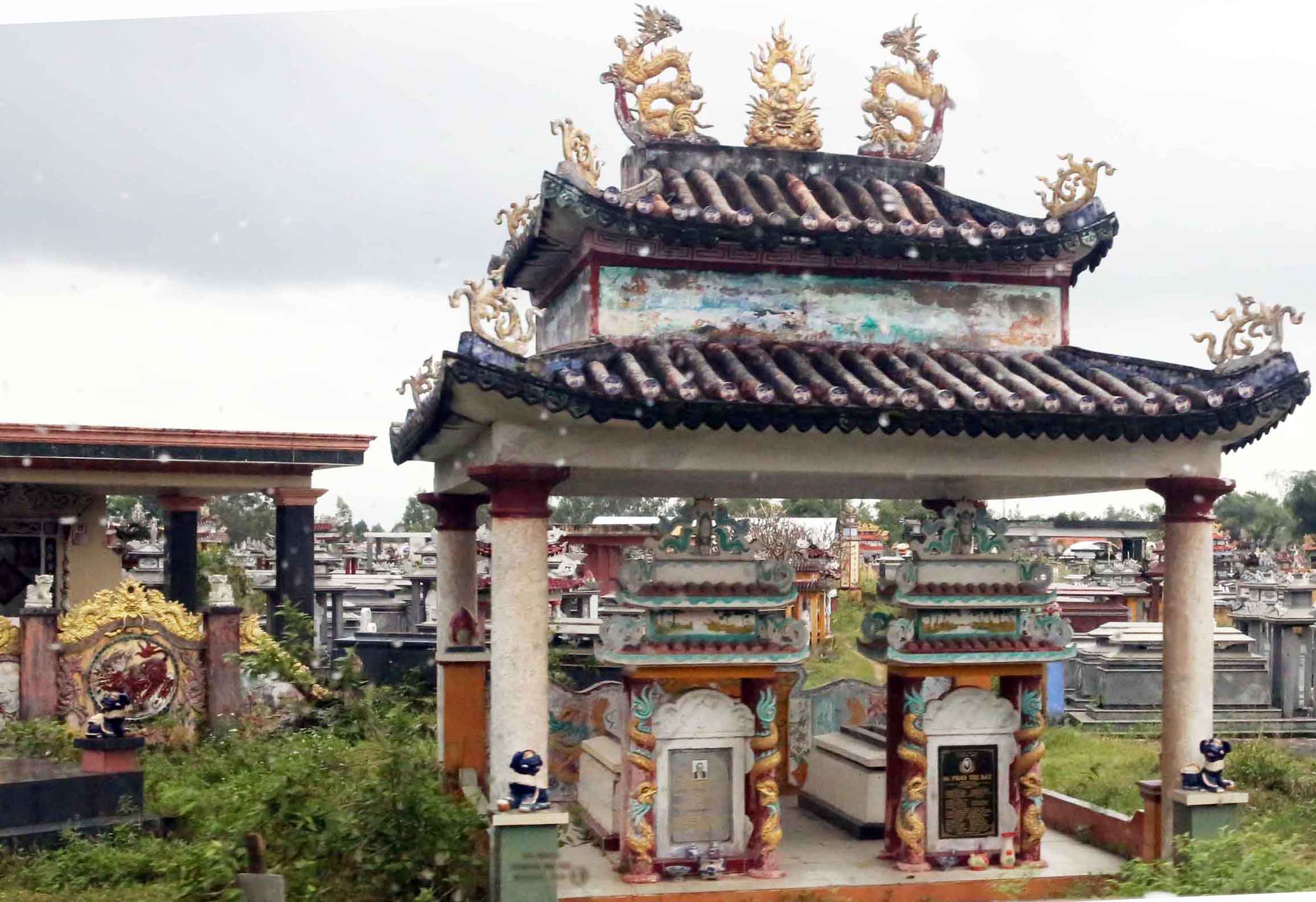 龍や鳳凰を装飾した門や建物を建てた墓。手前右のものしか墓標が見当たらないが、一族の墓だということを示しているのだろうか?