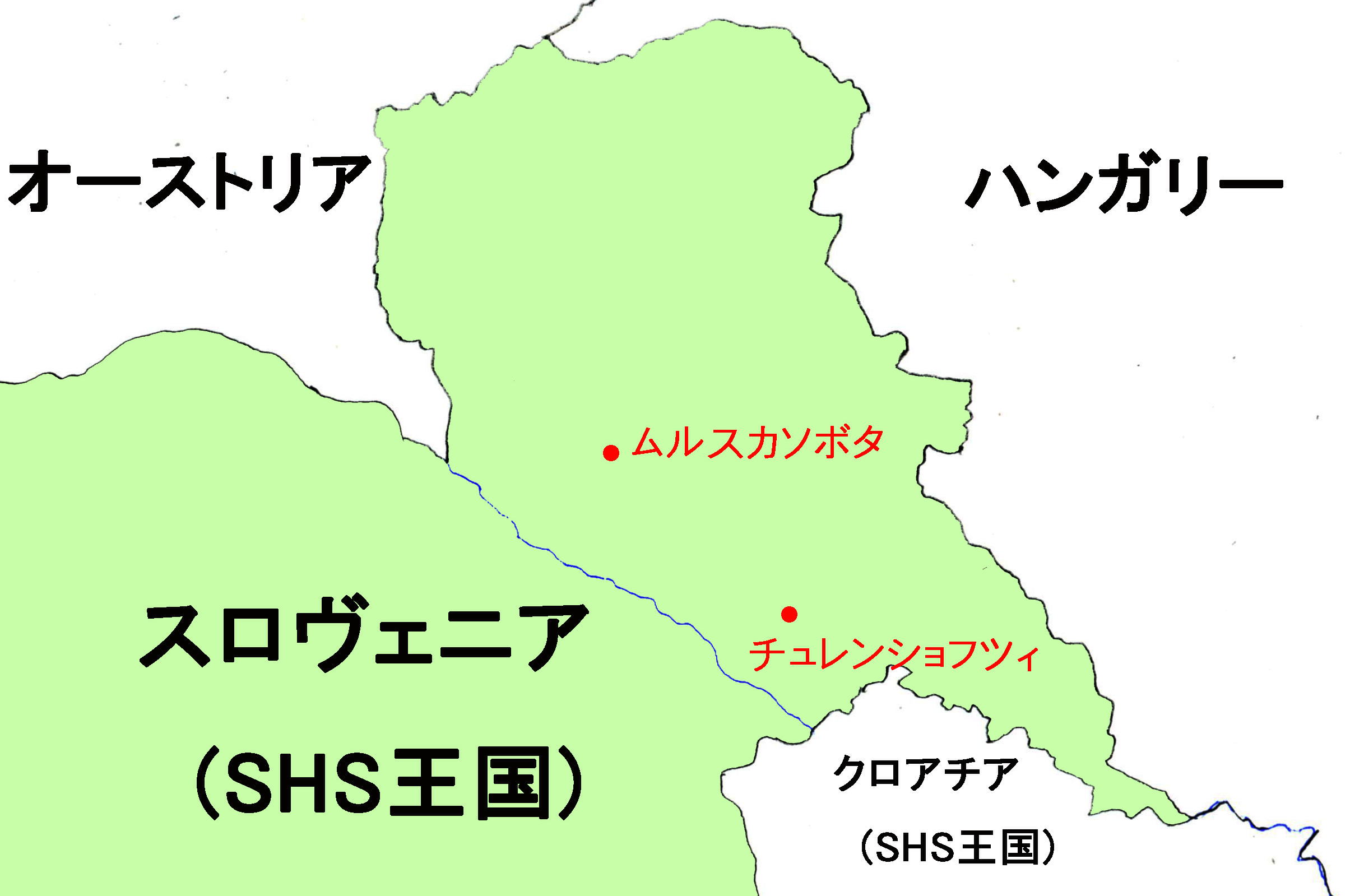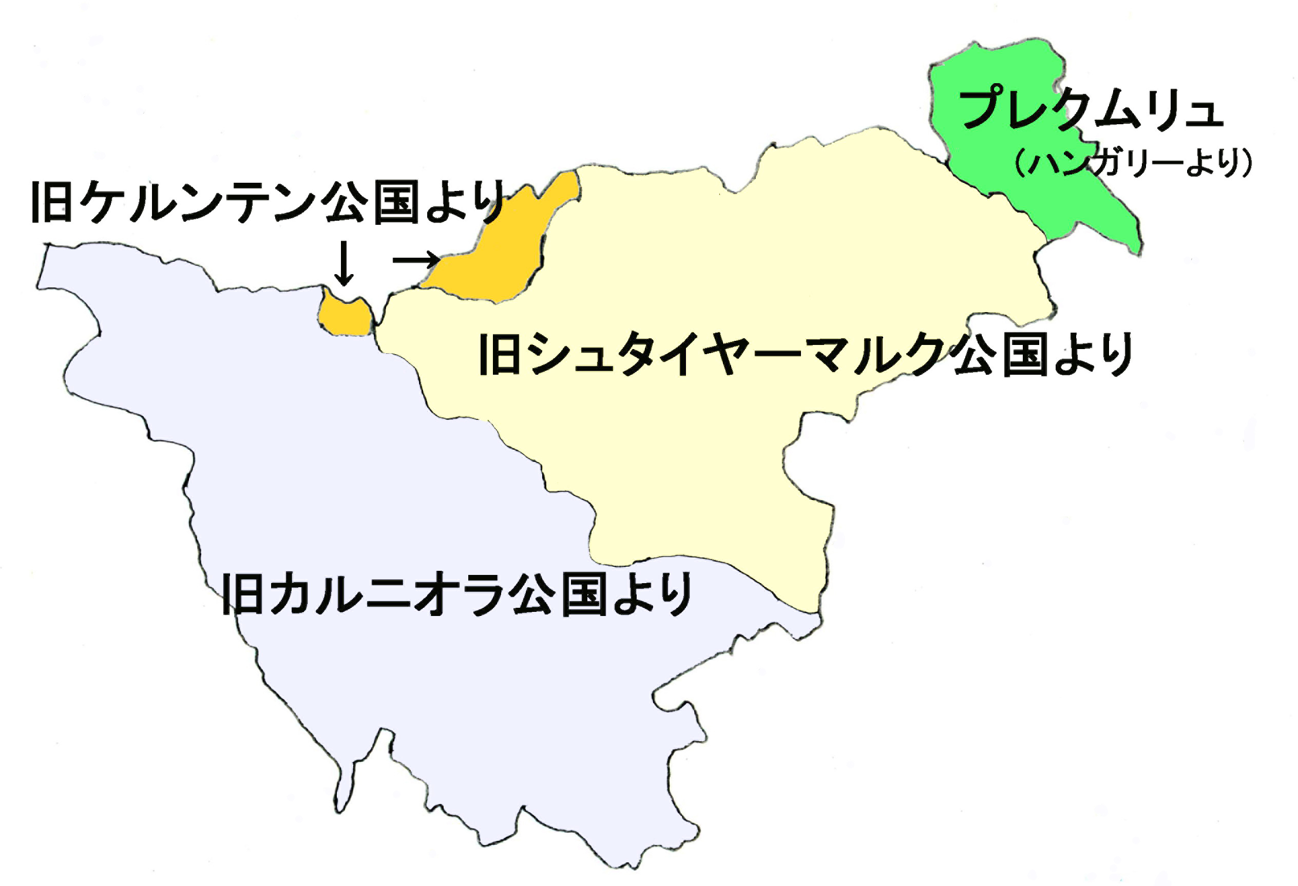 後述するように、スロヴェニアは1918年、セルビア人・クロアチア人・スロヴェニア人王国の一員となったが、スロヴェニア自身の新たな領域を次の地図で示す。旧オーストリア帝国からは、三つの公国からそれぞれの領土の一部を、そして旧ハンガリー帝国からも一部を、スロヴェニア人居住地域として割譲された。西の境界は1920年11月ラパロ条約でイタリアとの間で確定した。大戦後のスロヴェニアの領域