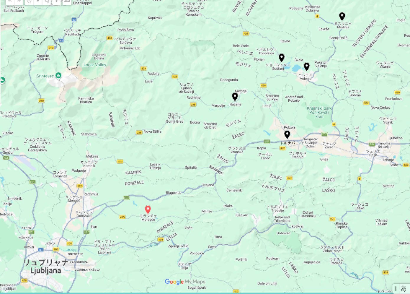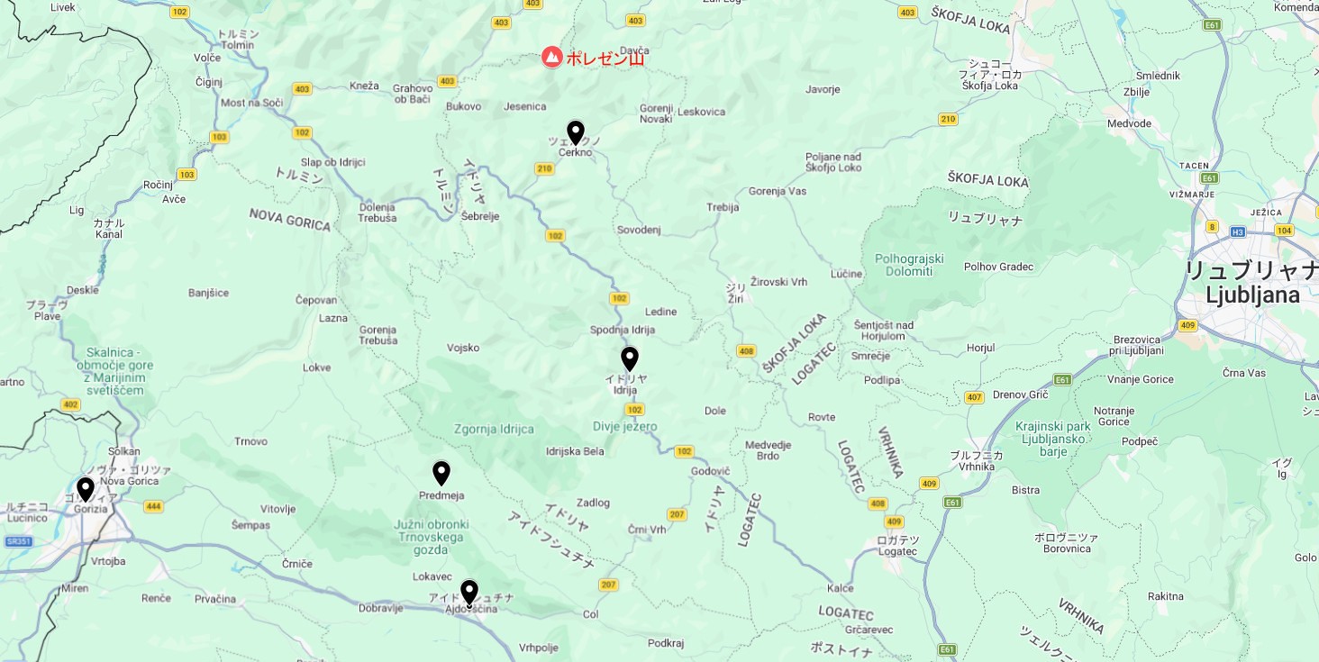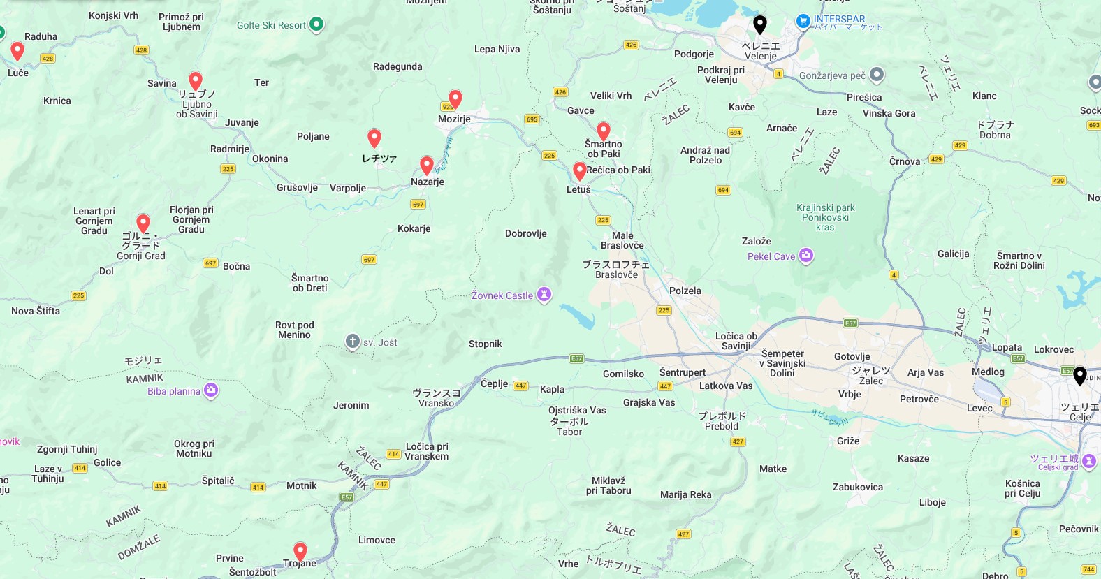 1944年、ゴレンスカ、シュタイエルスカのパルチザンの攻勢地概念図。赤印は解放地域。黒印はドイツ軍部隊や施設を攻撃したところ。Google Mapsより