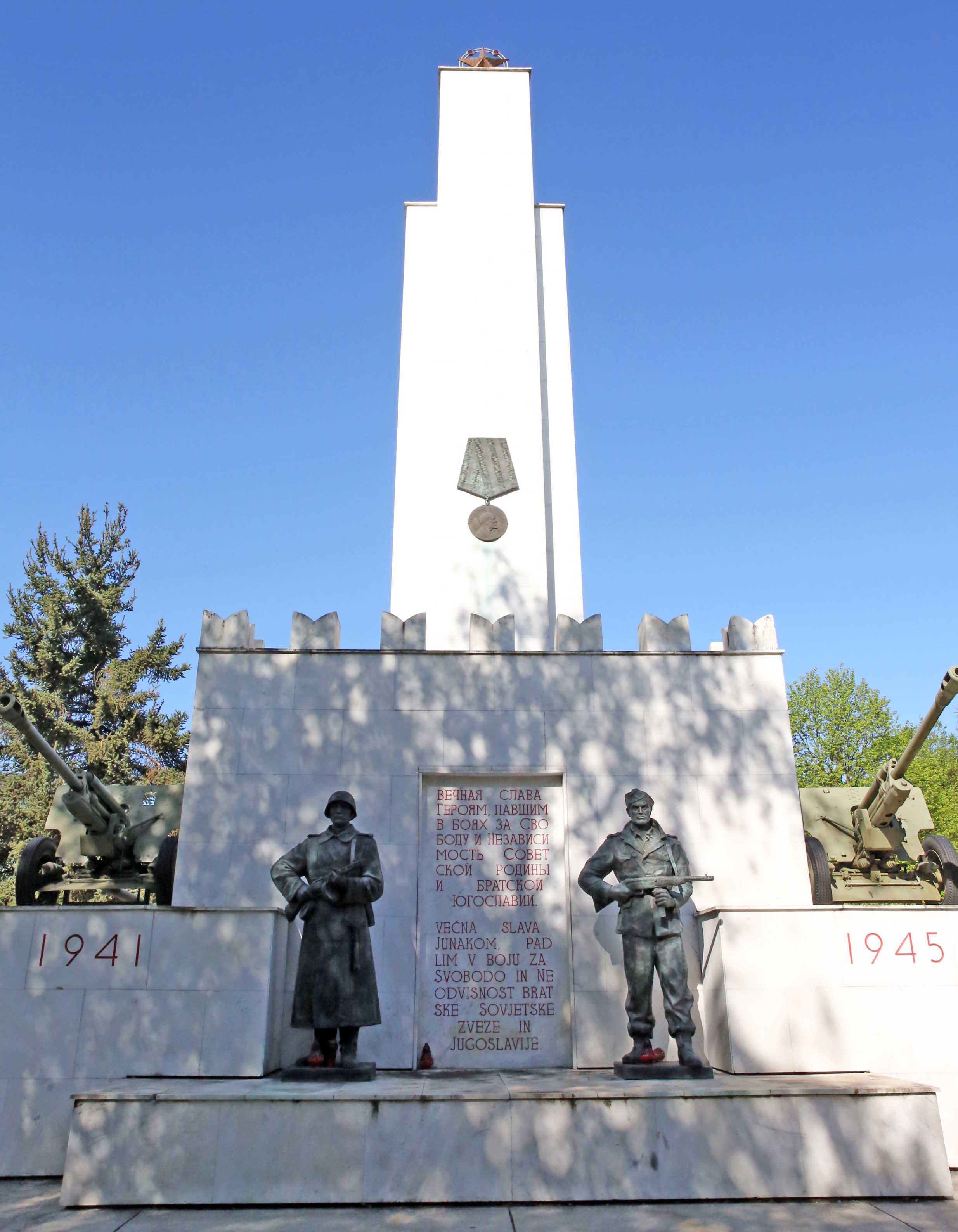 2025年4月筆者撮影の、プレクムリェのムルスカソボタ市中心部の「勝利の記念碑」。赤軍の勲章をバックに、ソ連兵とスロヴェニアパルチザン兵が並ぶ。戦後、ソ連とユーゴスラビアは関係が悪化するが、ソ連がこの地域を解放したことは史実なのでずっと建てられていると思われる。真ん中の、ロシア語とスロヴェニア語の碑文は共に「兄弟なるソ連邦とユーゴスラビアの自由と独立のための戦いで倒れた英雄たちに、永遠の栄光を」となっている。