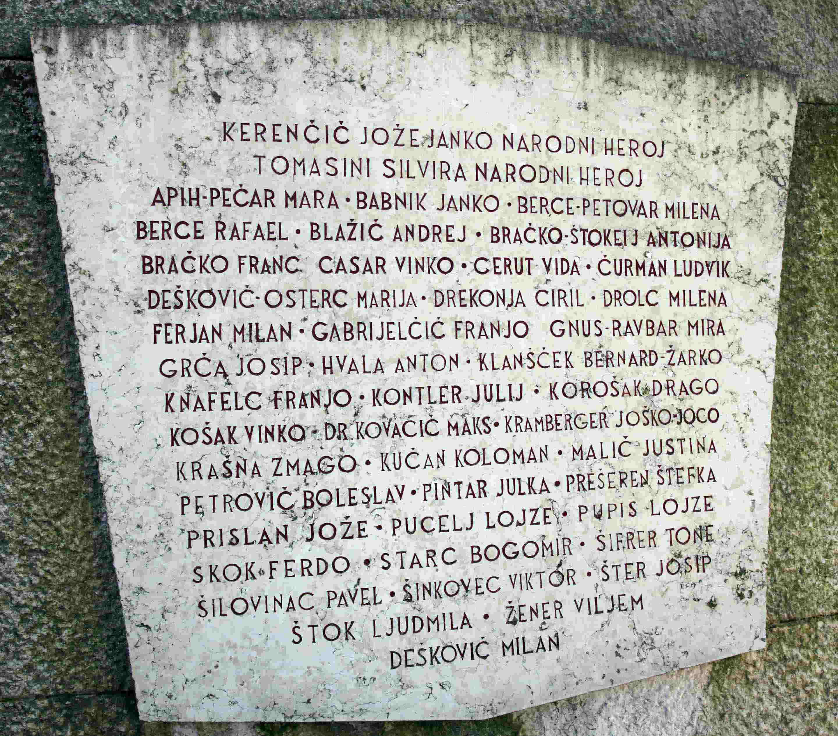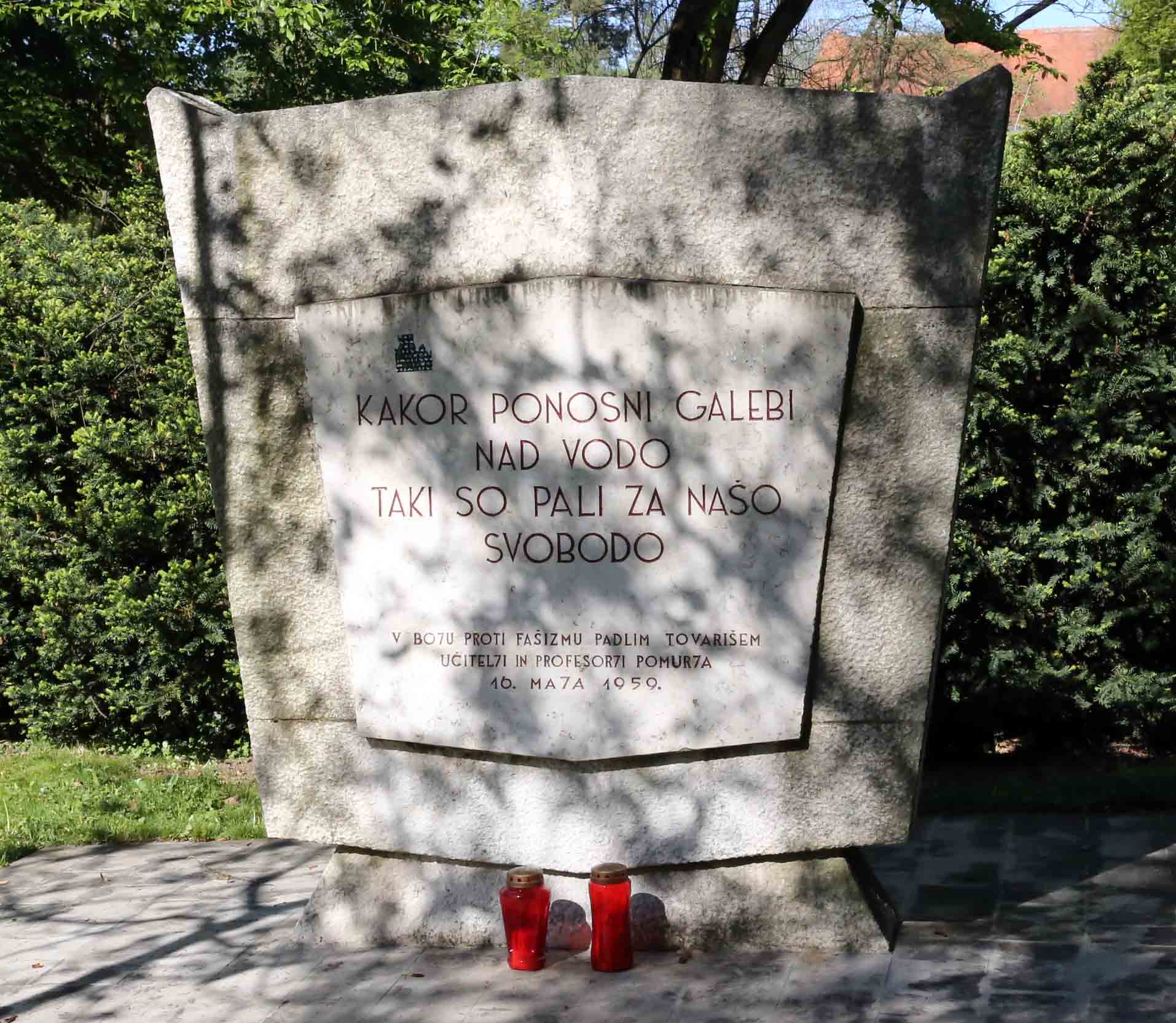 勝利の記念碑の近くの公園には、占領期に迫害され命を落とした教育者たちを追悼する「ポムルイェ地方(ムル川沿岸地方の意味)の教師・教授の反ファシズム抵抗碑」(左)と、ムルスカ・ソボタおよび周辺地域でファシズムに抵抗し、戦い、あるいは犠牲となったパルチザンや活動家の名前を刻んだ名簿碑(右)が建てられている。最上段には「国民英雄(Narodni heroj)」の称号を持つケレンチチ・ヨジェ・ヤンコとトマシニ・シルヴィラの名が記され、その下に多くの地域の戦士・協力者の名が続く。