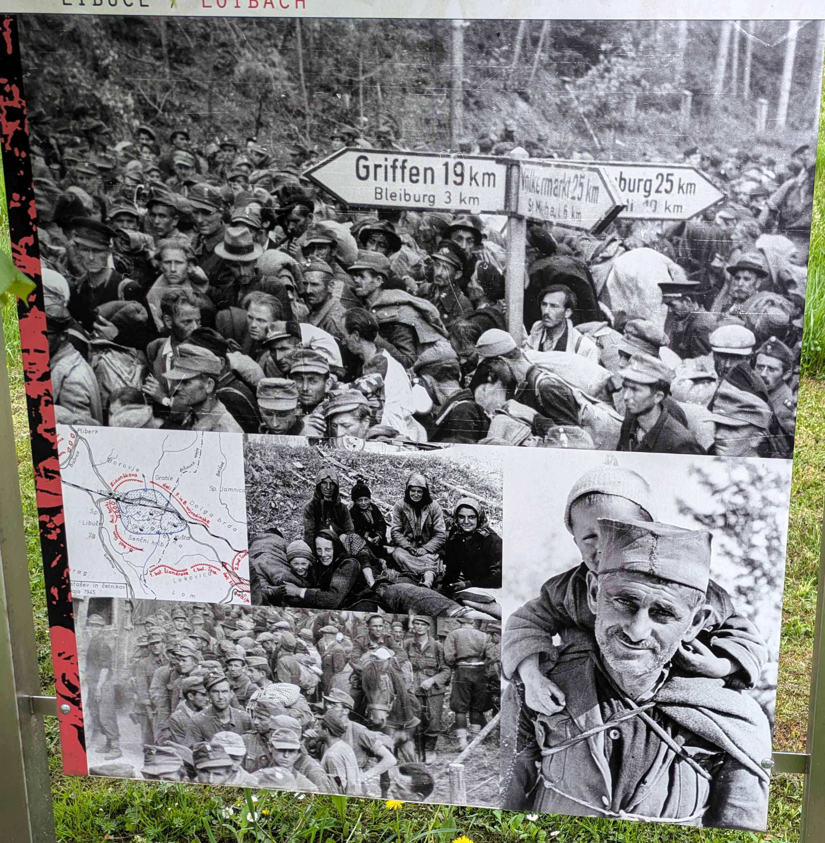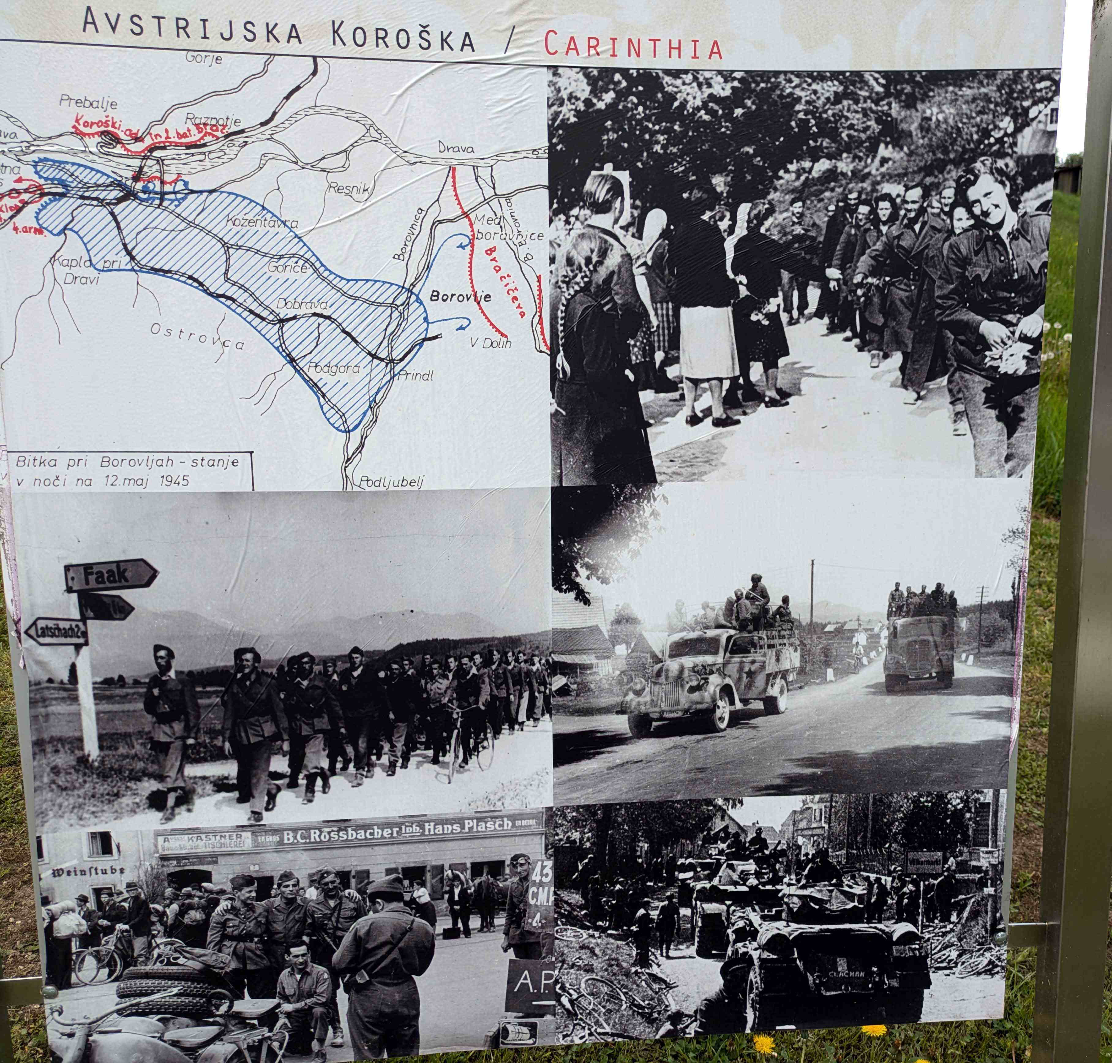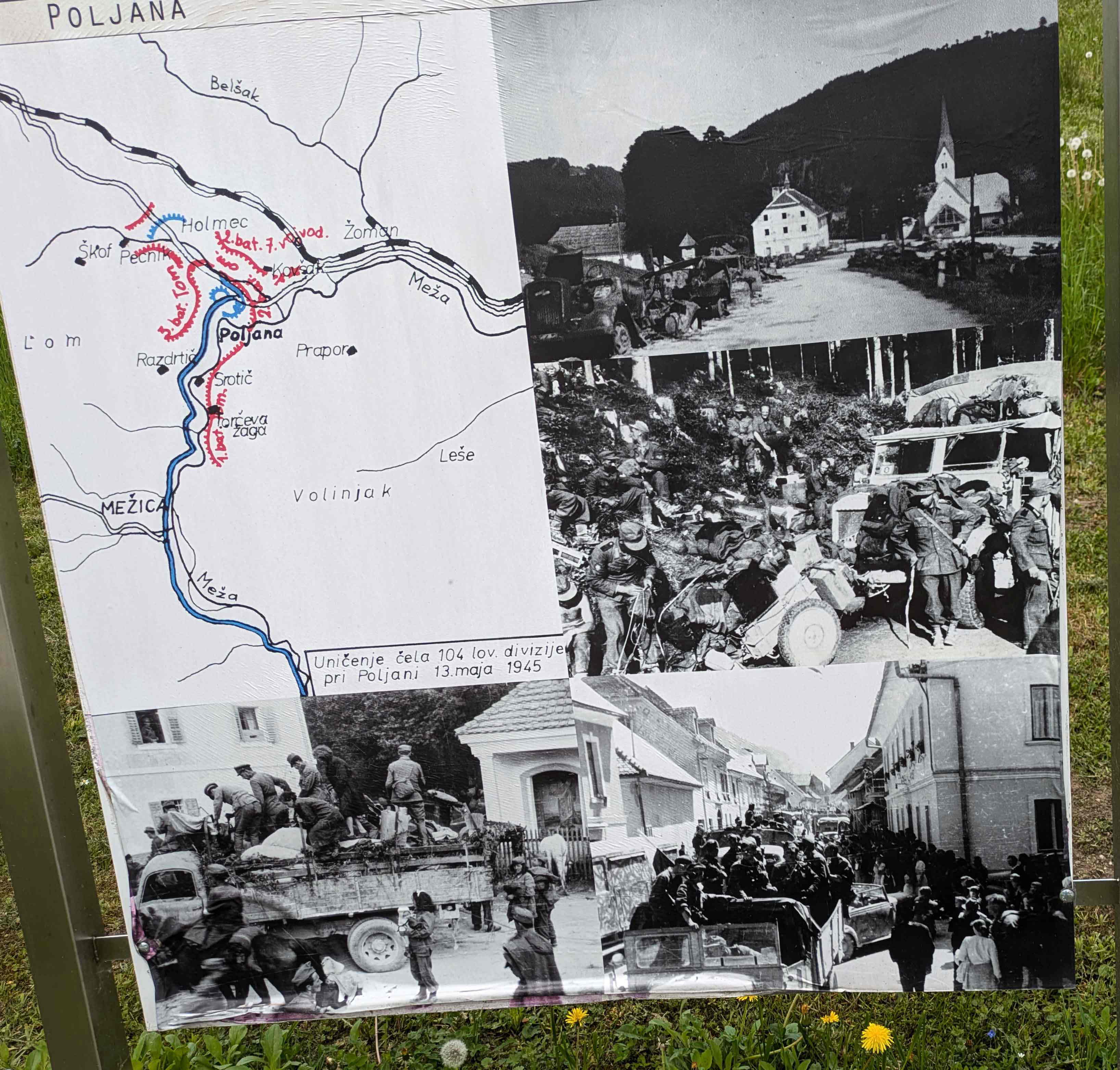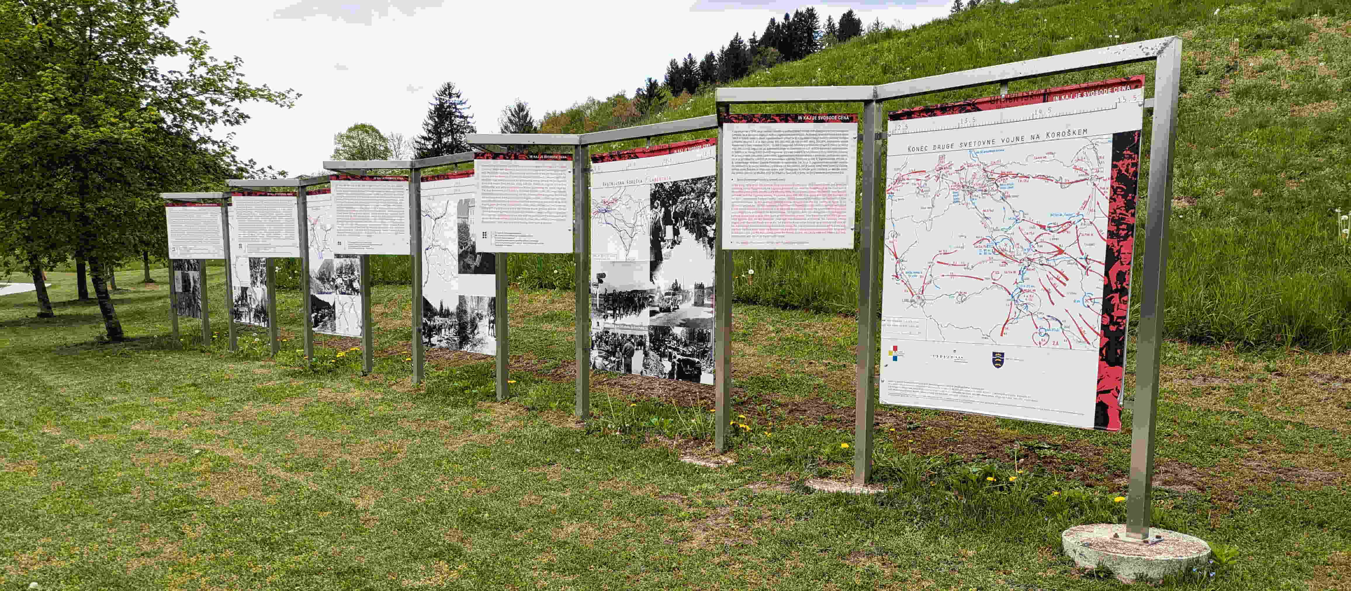 このスロヴェニアでの戦いは1945年5月15日にコロシュカのPoljanaポリャナで終わるが、2025年時点で、その整備された公園には最後の戦局と関連の写真を示す屋外展示が下のようになされている。展示は、2010年5月、出来事の65周年を記念してカリンシア地方博物館によって設置された。企画担当はBrigita Rajšterブリギタ・ライシュテルさん。展示は2021年に改訂された。展示の作者はMaljan Linasiマリャン・リナシ(博士)となっている。ここからの記述はこの屋外展示を基にするる