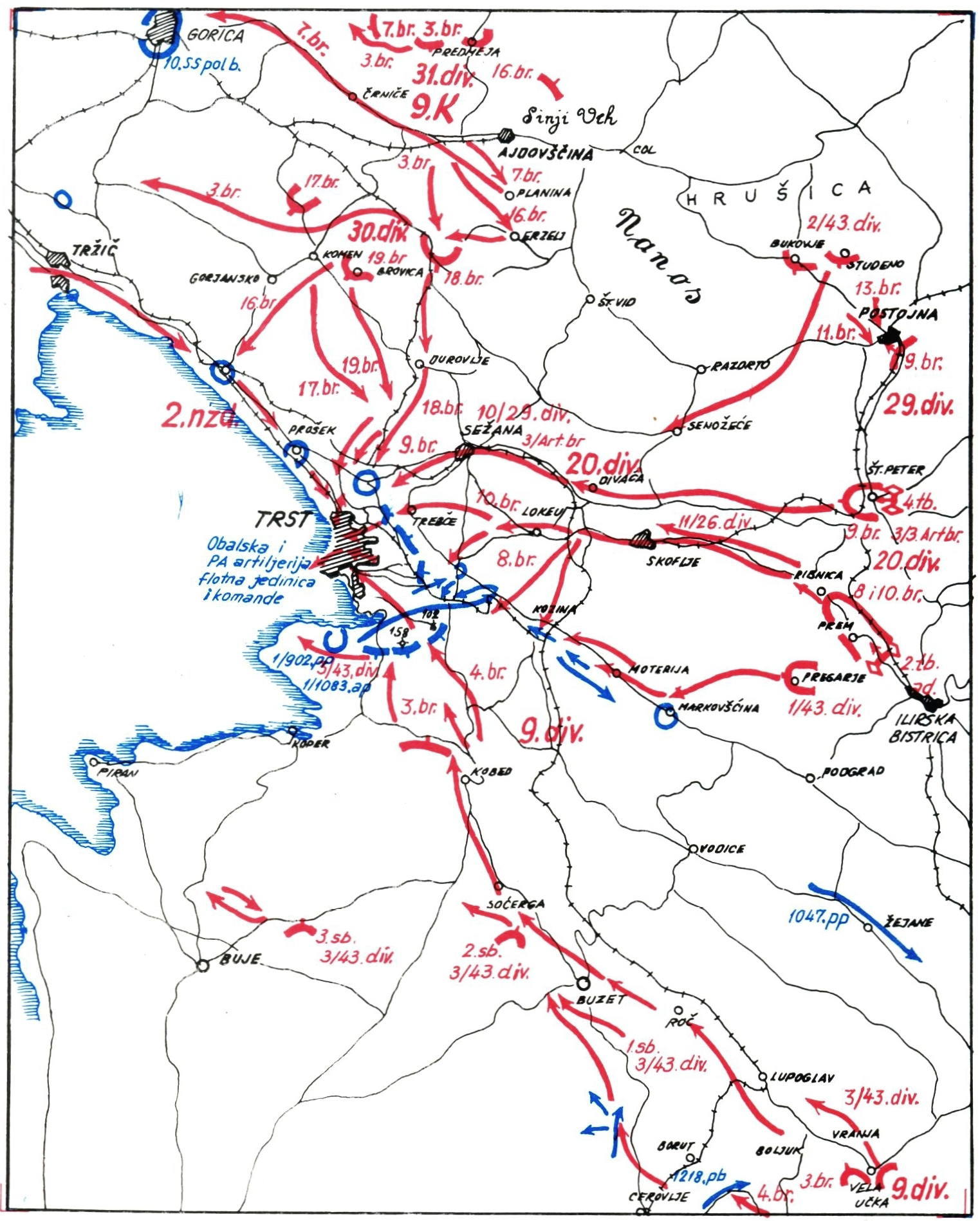 1945年4月29日夜、第9軍団の一部隊は、トリエステ市街地に突入し、5月1日の朝までに鉄道駅と港に到達した。市内ではすでにスロベニア人とイタリア人による蜂起が始まっており、トリエステは事実上、解放軍の手中に入った。南側から第4軍の部隊も市街地に入り、蜂起勢力と連携して主要地点を掌握した。同時期、ゴリツィア、ポストイナなども解放され、第一次世界大戦後にイタリア領とされたスロヴェニア人居住地域は、ほぼ完全に自由となった。5月2日、ニュージーランド第2師団(連合軍)は、すでに解放されていたトリエステに到着した。市内の残存ドイツ軍は同日中に掃討され、3日には北方の最後の拠点が陥落し、3,000名以上の敵兵が降伏した。ユーゴスラビア軍は、残ったリエカのドイツ大軍の攻撃に集中した。このドイツ軍は、リエカからの海上脱出は連合軍とパルチザンに制海権を把握されていたため不可能だったので、とにかく北へ逃れようと、同5月3日から「ハリネズミ形」防御(全方位防御➂)の形でIlirska Bistricaイリルスカ・ビストリツァまでの20km以上を北上した。 しかし、山と第4軍主力部隊に囲まれて、5月7日、ついにそこで16,000人が降伏した。
