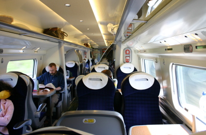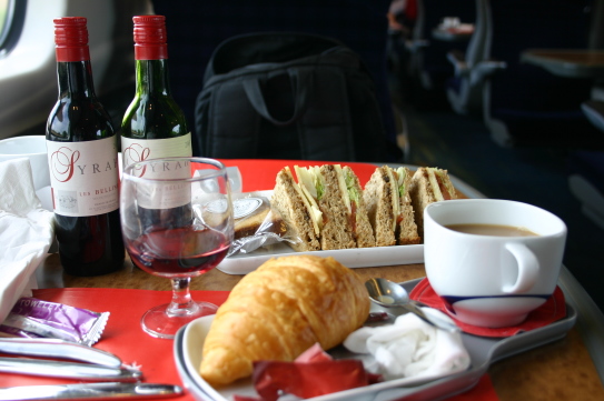 パスには一等車乗り放題のものと二等車用とがあるが、2005年8月は4日分のパスで1万円分高い一等車用を使った。私が利用した、湖水地方オクセンホルムからロンドンへの約4時間弱の車内では次のような無料サービスがなされた。ちょうど私が乗ったのは昼時だったので、このようなものだったが、朝なら豪華イングリツシュ・ブレックファスト、夜ならちょっと重めな食事が出る。何回もコーヒーやティーの飲み物サービスが来た。夕方別の方面に乗ったときは夕刊が配布された。席にはテーブルが付いている。日本のもののような、ちゃちな折りたたみテーブルとは違う。