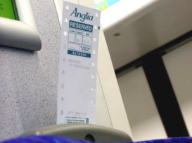 左は一等車内の様子。右は予約がある席の表示。日本人の感覚だと予約しないといけないと思ってしまうが、私の夏8月と春3月のイギリス旅行の体験からは、予約してなくてもまず座れる。全体的にも予約席は少ないように感じるし、気が付いたらその車両に自分しか乗っていなかった、なんていうこともあった。