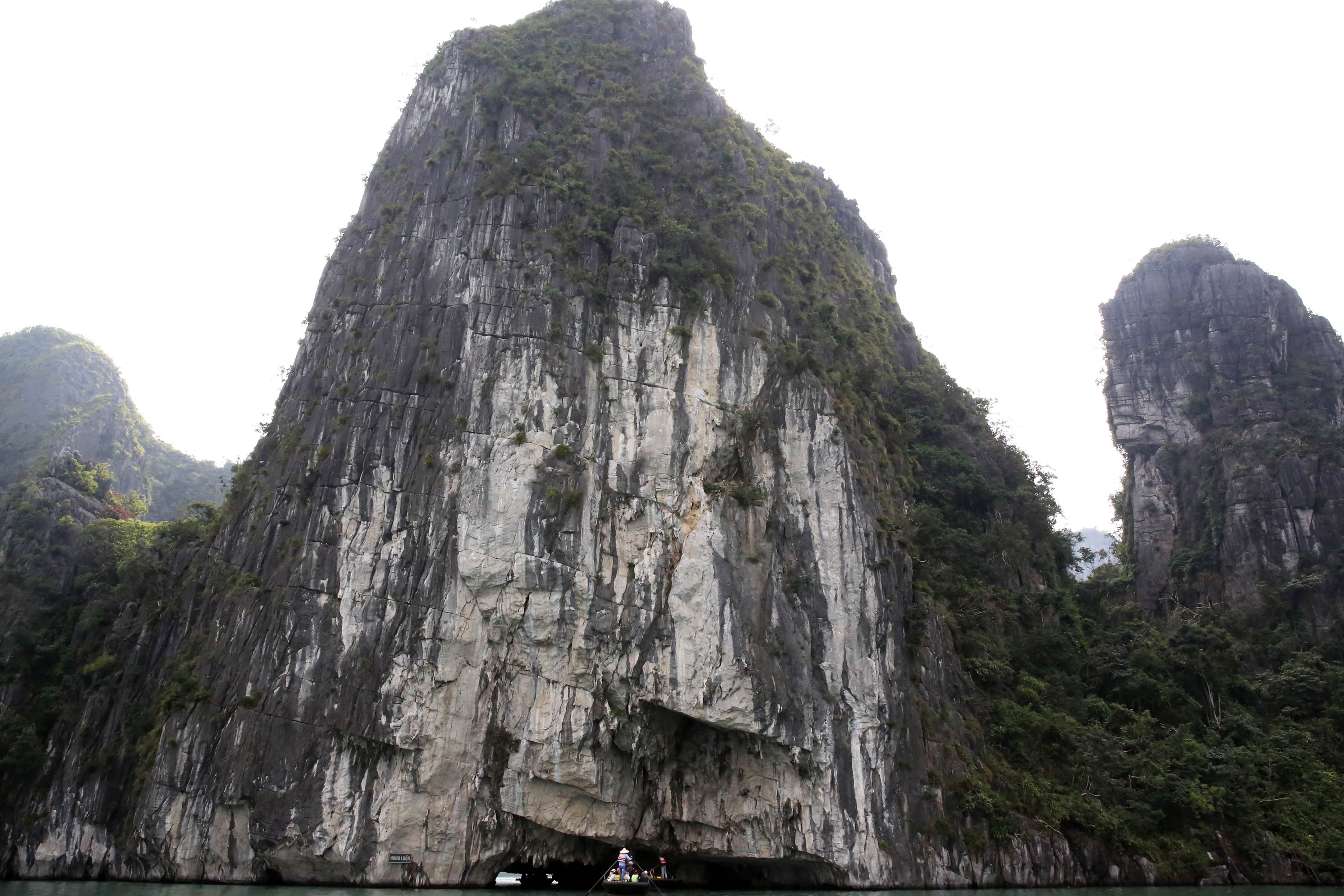 最初の見学スポット、Luon Caveが近づいてきた。ボートに乗り替え、あの島の下の狭い隙間をくぐっていくのである。