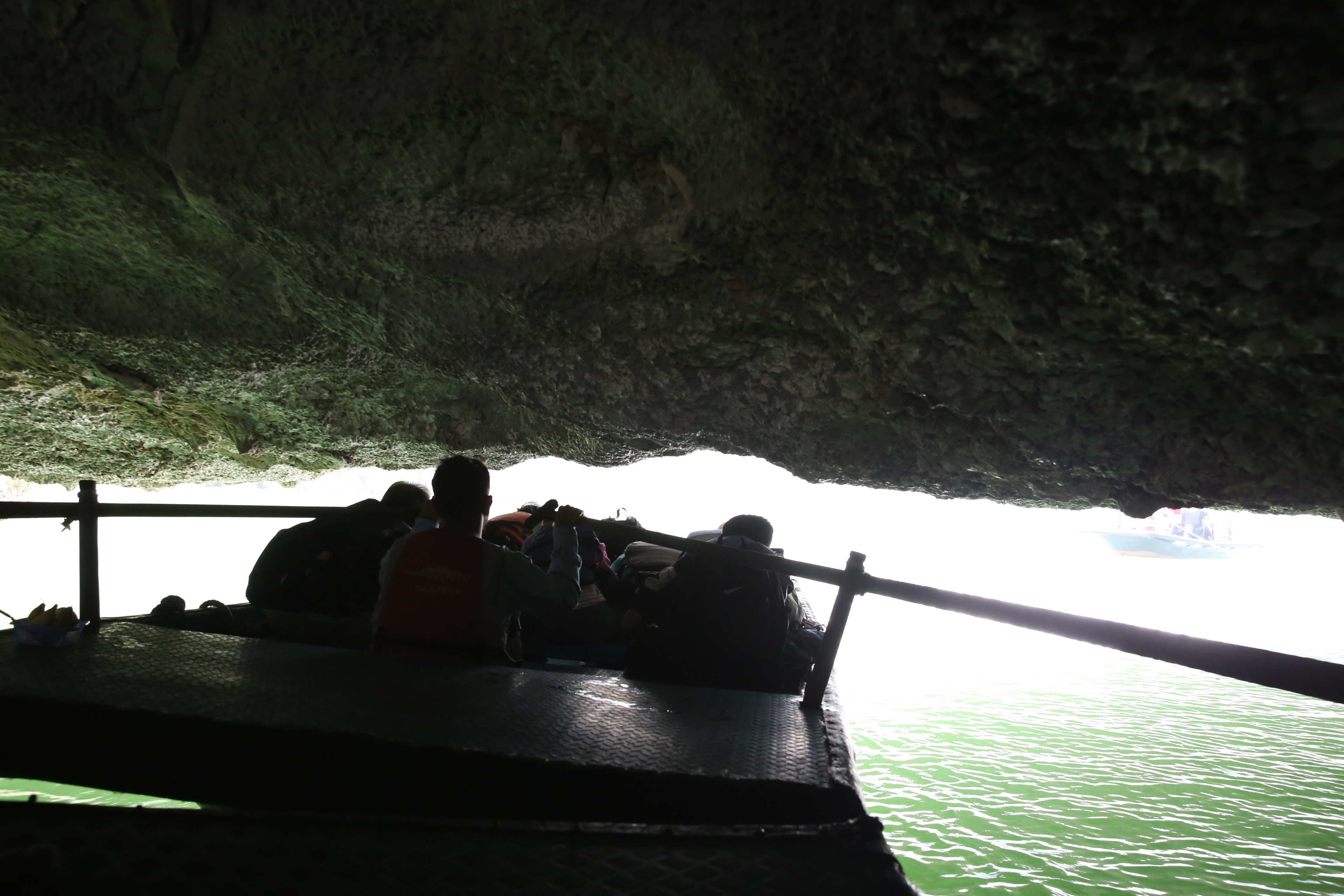 島の下をくぐる体験はめったにできないので、つい撮影に夢中になっていると、次の写真を撮った直後に、頭の右の前の方を上にぶつけて、いきなり痛みが走った。今思うに、痛かったが、触ってみると傷ができたらしいところからは出血していなくて、痛みもしだいに和らいでいった。運が良かったと言わざるを得ない、この文を読んで、ハロン湾のこのようなクルーズに参加する方、とにかく気を付けて下さい。