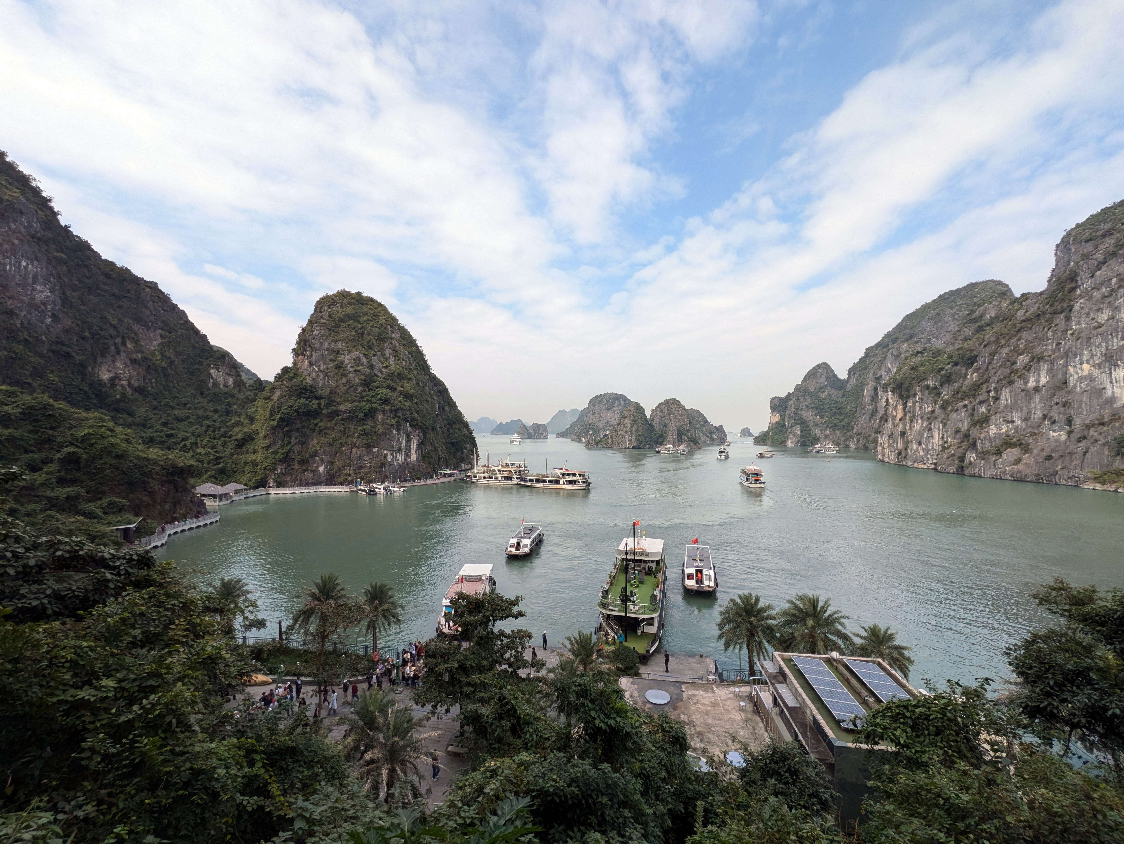 次に向かったのは、Sung Sol Cave3である。全員さきほどのボートから戻ってまた乗ったクルーズ船から降ろされ、いきなりかなり長い階段を上らされた。ただ、この上から見た景色は、雲が晴れて日が照ってきたこともあり、私にとってはこの日一番の絶景であった。欲を言えば、ほかのクルーズ船が無い方が純粋に景色を楽しめるのだが、やむを得ない。