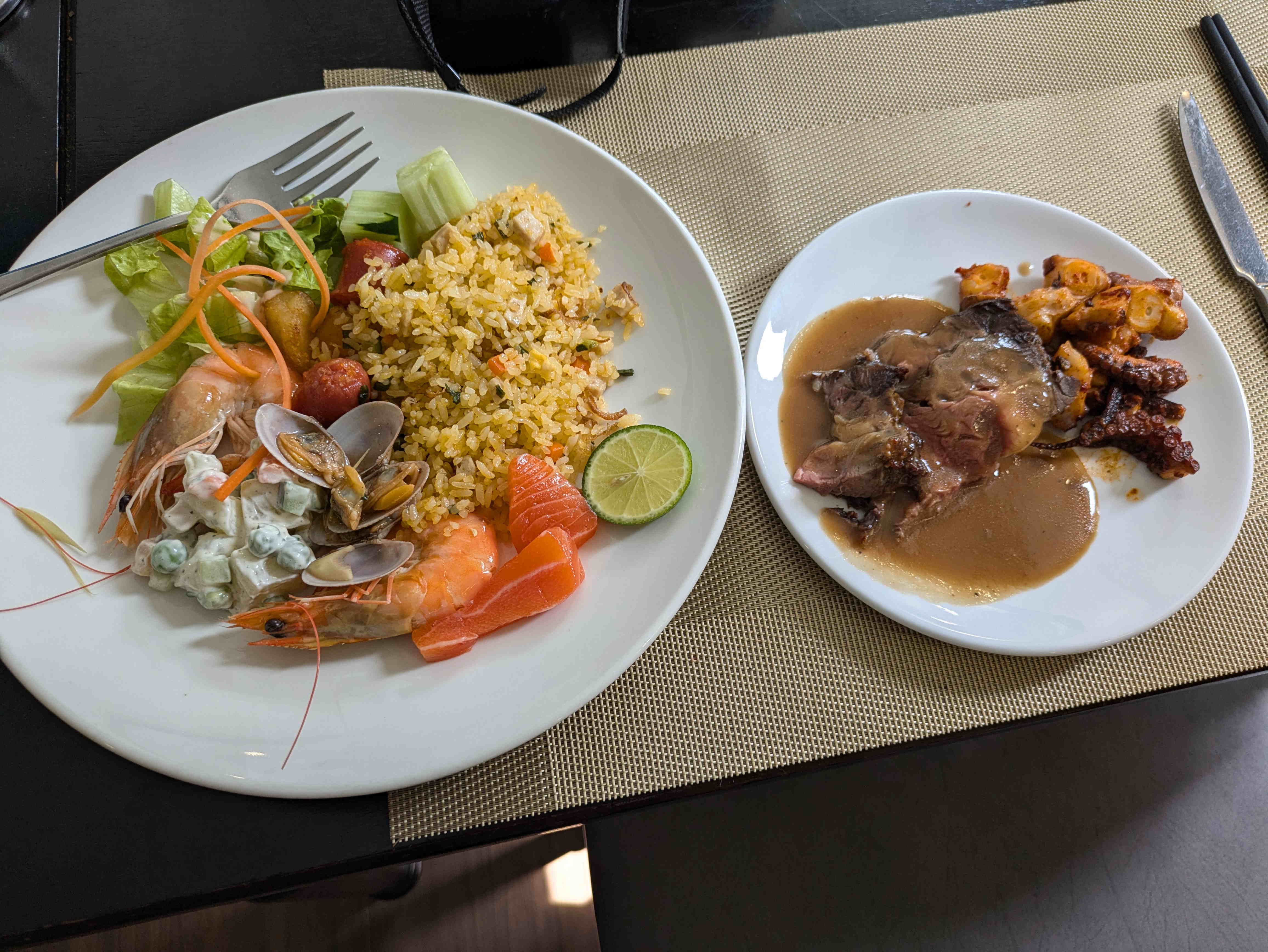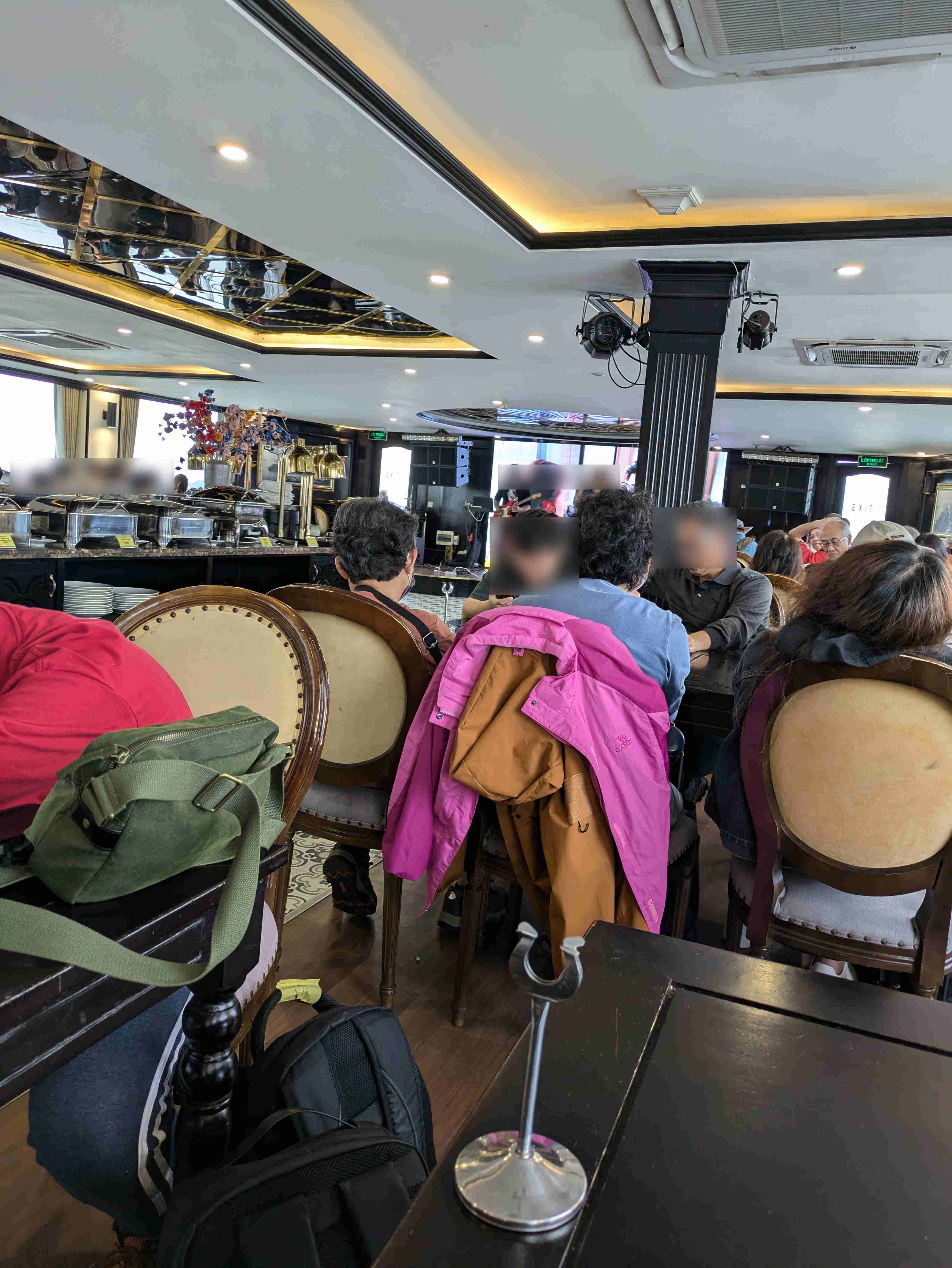 私にとっては「苦行」に近かった鍾乳洞巡りが終わり、船に戻ると、バイキングランチの時間となった。これは手放しでもう嬉しい! 私が付けたベトナム人日本語ガイドの指示に沿って、名前入りで指定された座席を確認した後、みんなが並んでいるから美味しいんだろう、と解釈した、ローストビーフと蛸の煮物らしきもののところに行って、まずお皿1枚を満たす。あとは、おもむくまま、あちこち行って次のように自分でランチプレートを作った。バイキングというのは何かウキウキさせてくれる。私もサーモンを少し取ったが、他にも数種類生の刺身が出されていた。やはり、本来、生ものを食べない中国人が、日本の味を憶えて食べるようになったらしい。まあ、全体の味は不味くは無かったが、見た目ほどは・・・というところであった。