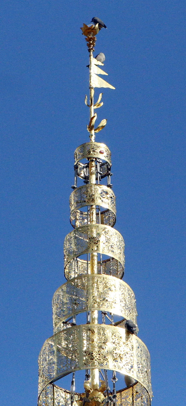 塔はラーン・ナー式。塔の周りにはお堂や仏像がたくさん置かれているが、塔の基本は模型のように四隅にブッダのための天蓋(てんがい。長い柄の絹の傘)が付いている形。ガイドの話だと塔の頂上にある蓮の花を模したところ(これだと鳥が止まっているが.)に仏舎利があるという。