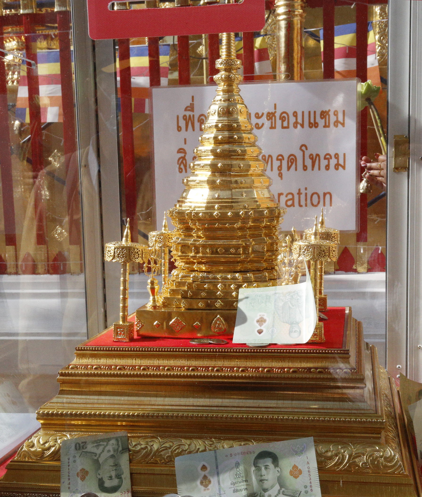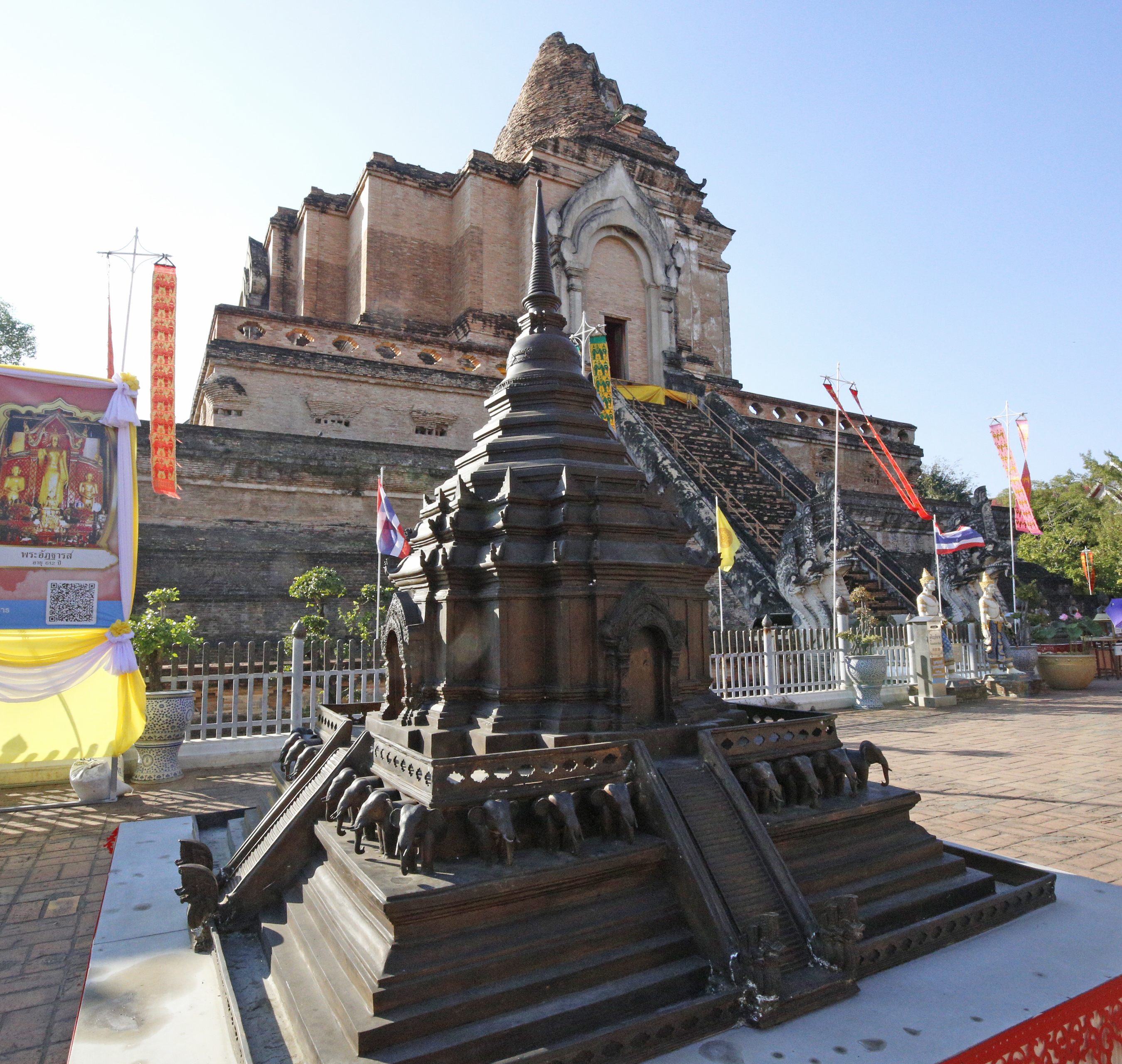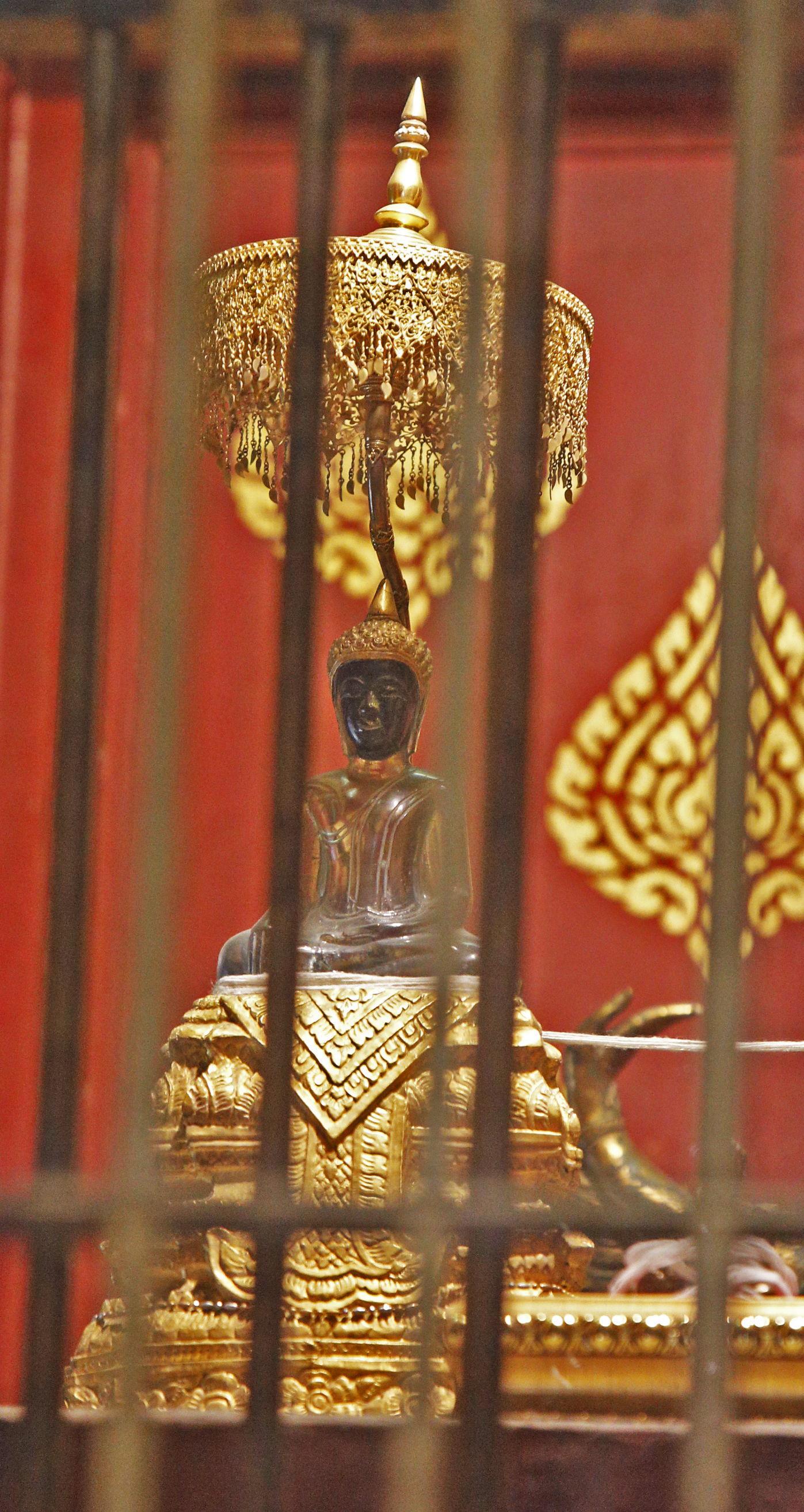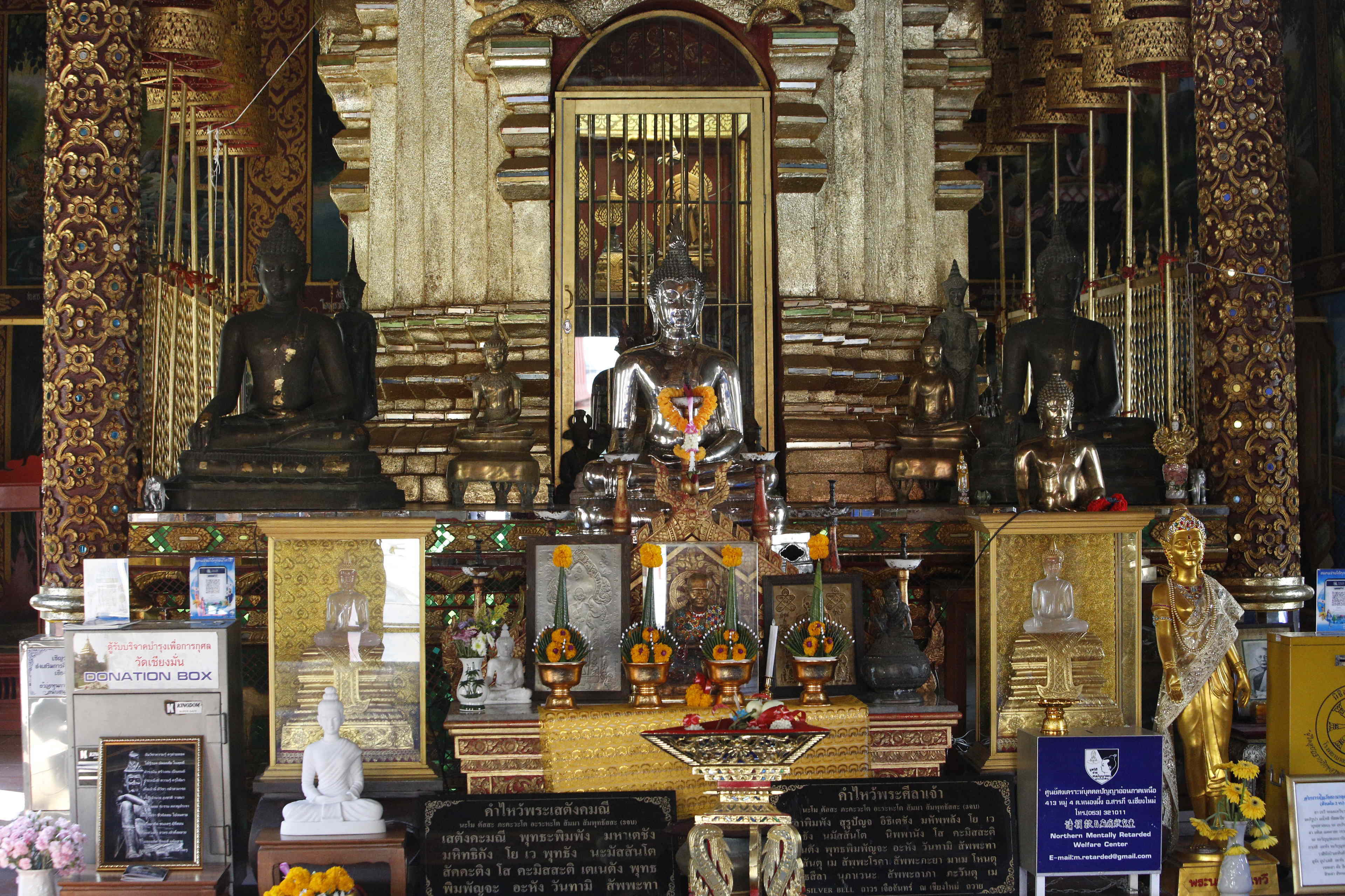 向かって左にあるのは、10cmの高さしかないが水晶の仏坐像「プラ・シ・タンタマニ」で、メーン・ライ王がハリプンチャイ王国を征服したとき、ランプーンから持ってきた。右は「プラ・スィラ」という30cmの大理石の立像。「伝承によれば、8世紀頃スリランカかインドで造られた」「二体の仏像は『雨を降らせ、町を火災から守る霊力がある』とされている」(『旅名人ブックス32 タイ/ラオス歴史紀行』p103-104)