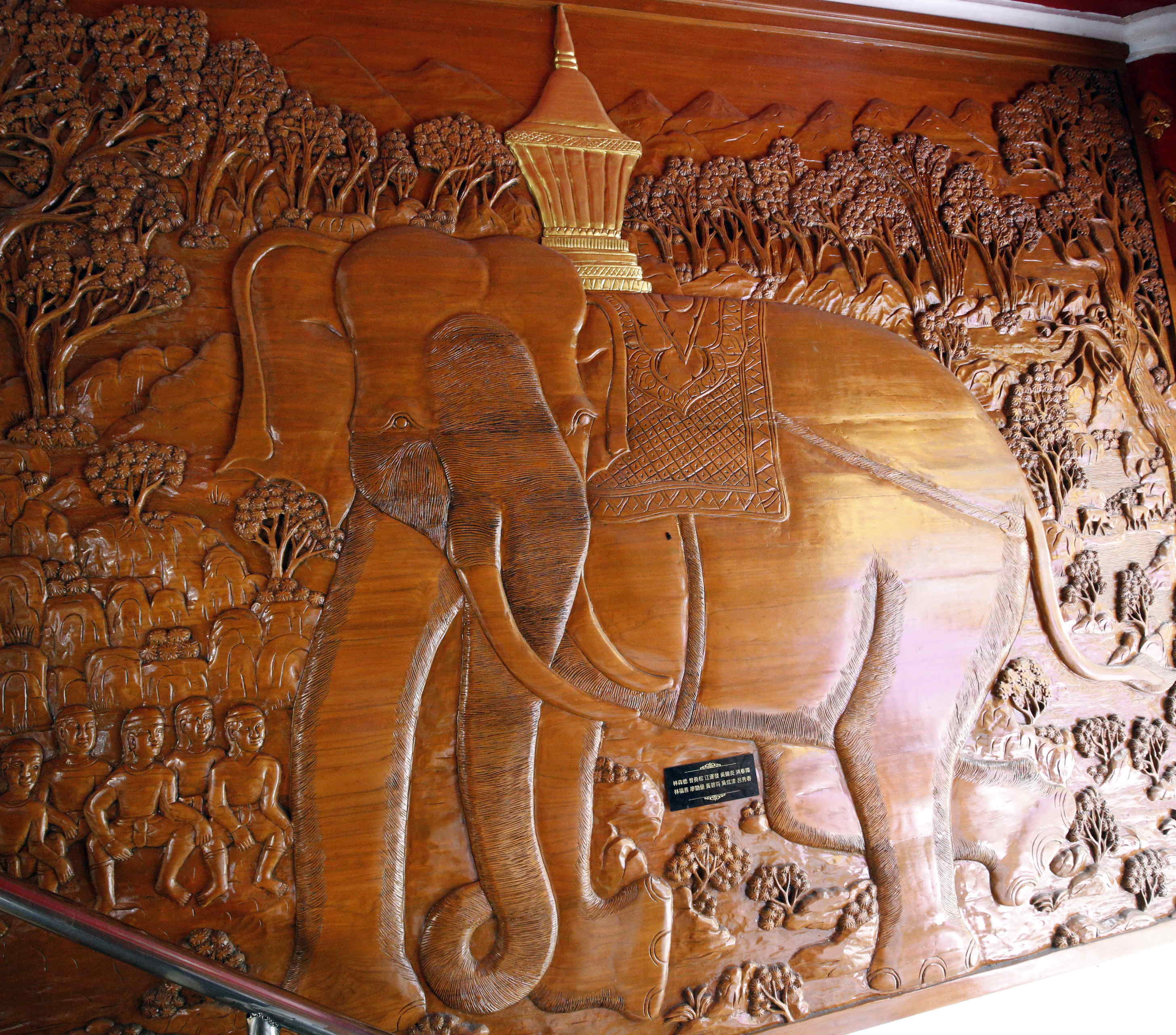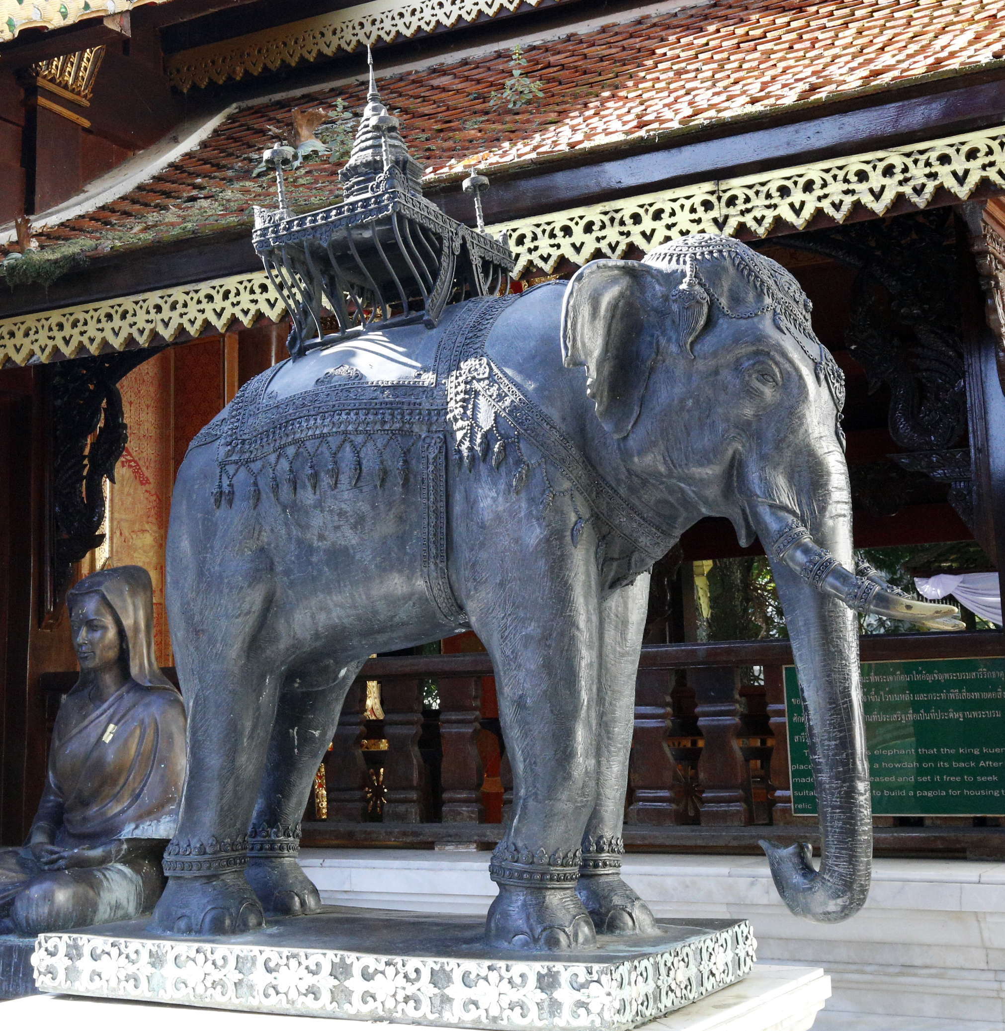 境内には、建立に関わる象のエピソードをモチーフにした木彫りレリーフや像がある。google mapで調べると、この寺はチェンマイ西門から自動車で約40分、16. 2kmの距離である。ただし、標高1,080m。果たして象は登ったのか?