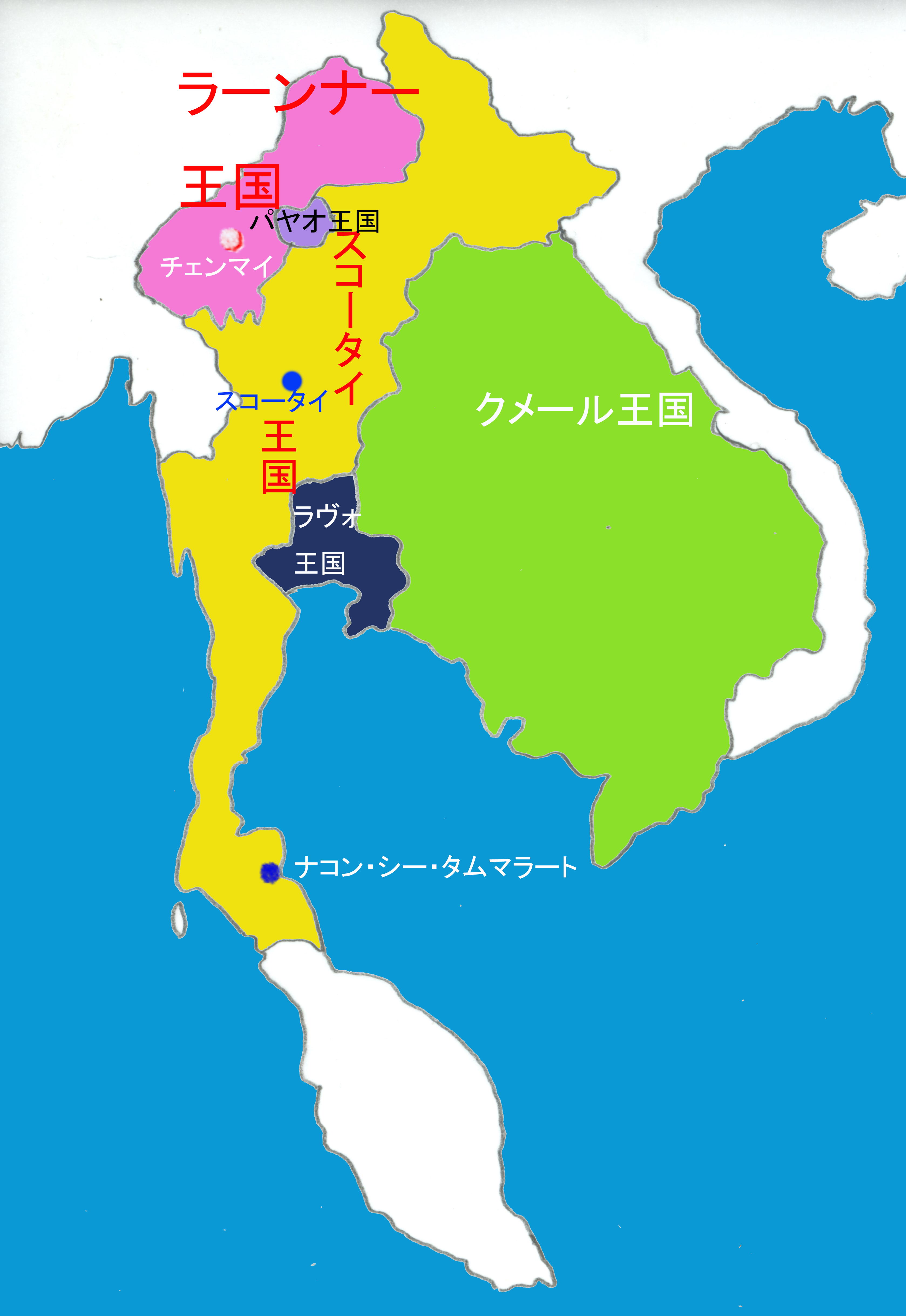 「クーナー王は『王の地位を宗教より上に置く』ためにスコータイから・・長老スマナ・・を招き、・・従来からの・・僧侶だった者全員に対して、再得度を命じた。その数は8,400人にのぼったという。」(『旅名人ブックス 32 タイ/ラオス歴史紀行』p107)こうして、ラーン・ナー王朝もスコータイ王朝と同様、スリランカ上座部仏教を国教としたのであった。