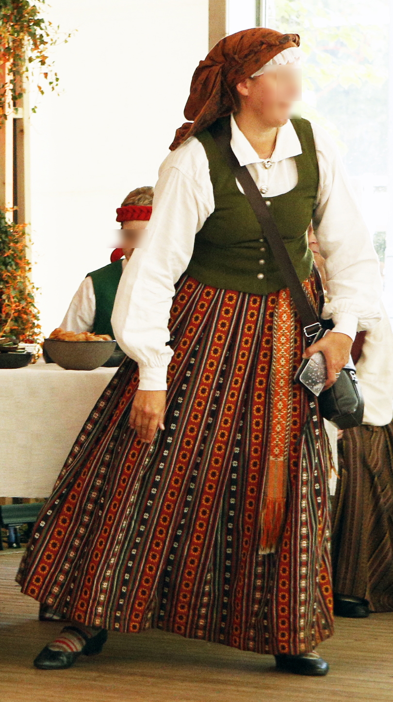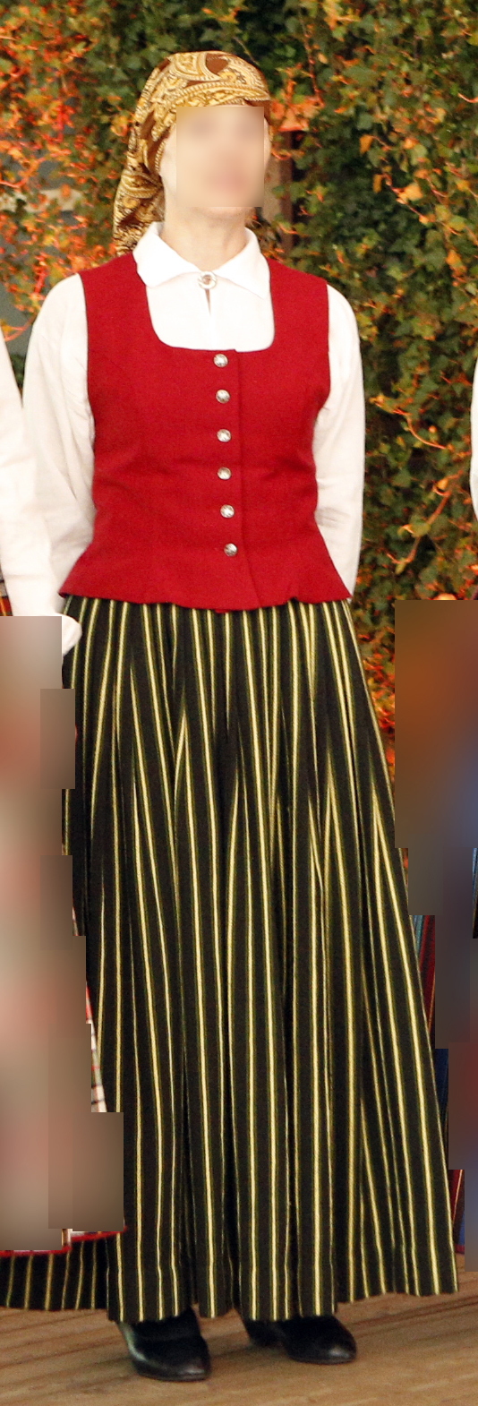 スカートはたっぷりとしたギャザーで、白(オフホワイトか?)の無地の毛織物または麻織物で赤い装飾が裾にある。ジャケットはスカートと同じ色で、胸の前に合わせる部分にも赤い装飾がある。既婚女性はリネン生地の頭巾を頭に付け、未婚女性の頭には、赤い布地にガラスやビーズの刺繍の施された王冠型のvainag(ヴァイナグ)。