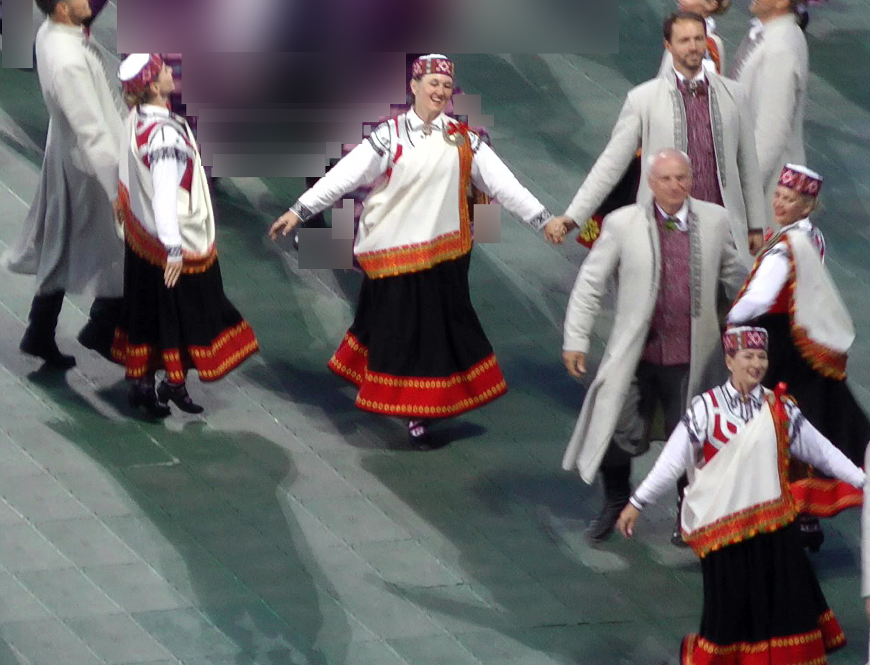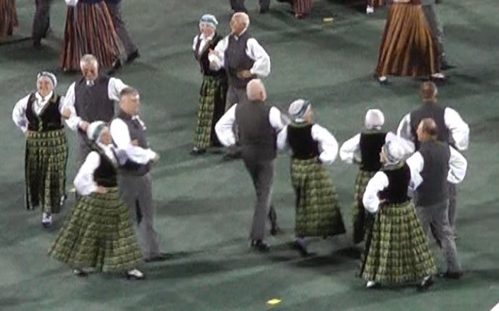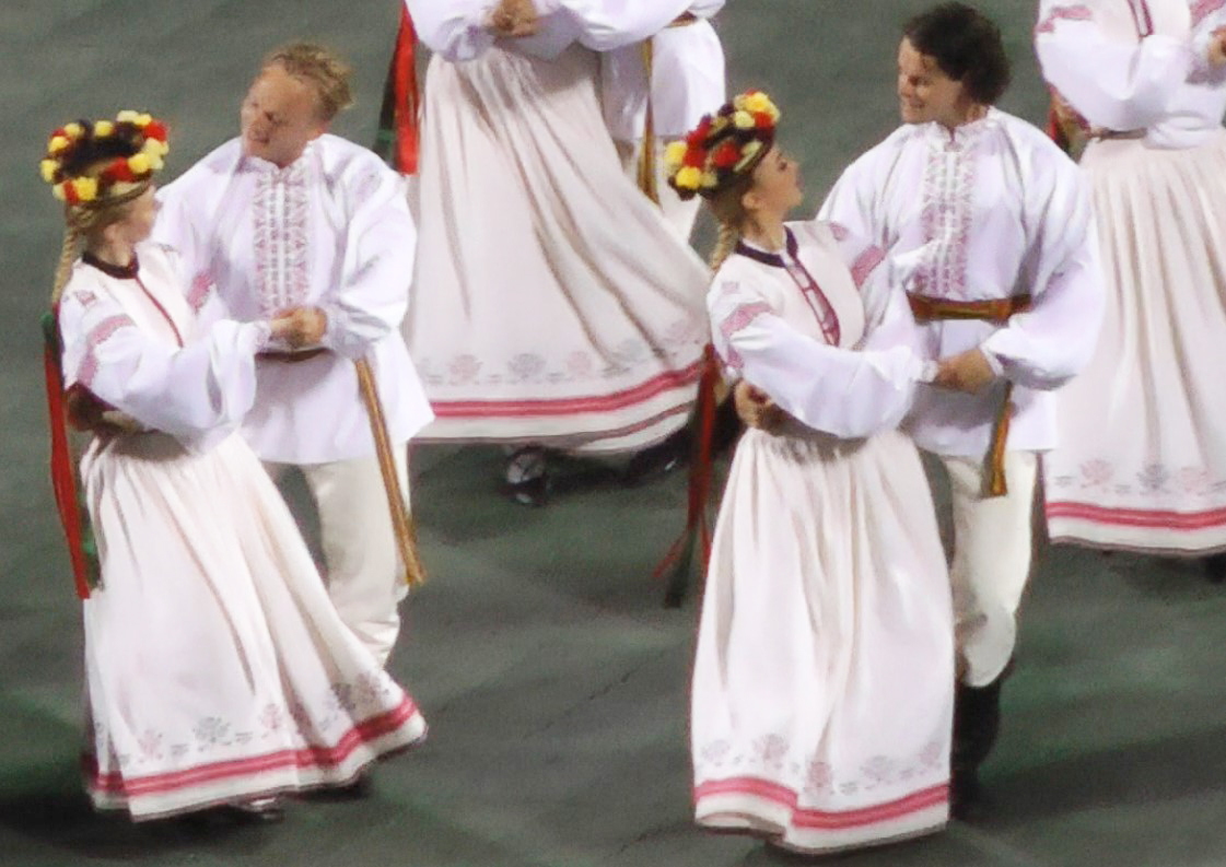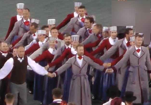 今回は私なりにある程度「予習」をしていったので、いくつかについてはすぐどこのものかわかった。また、リガの民族衣装専門店「SENĀS KLĒTS」(セナー・クラーツ)を通して購入したMaruta Grasmaneさんの民族衣装写真入りの著『LATVIEŠU TAUTAS TĒRPI・RAKSTI・IZŠŪŠANA』(ラトビアの民族衣装・工芸品・刺繍)もあるし、多くの関連サイトも知っているので、エストニアのような苦労はしないだろうと高を括っていた。しかし、一番の苦労の種があった。それはこの2つの祭典では一眼レフ、そして当然望遠レンズの持ち込みが禁止されたことであった。これは地域特定の決め手となるスカートのストライプの色合いや被り物の細かなデザインが写真に綺麗に収まらないということになった。また、エストニアのときは、「歌の祭典」の日に会場に行くコーラスグループの街頭パレードがあり、地域名を入れていたプラカードが多く掲げられ、大いに助かったのであったが、ラトビアの場合、パレードは1週間前にもう終わっていた。そして、エストニアのときも同様だったが、民族衣装の写真集やサイトの写真と私の撮った写真の民族衣装がなかなか一致しないものが多い、というのも困ったことだった。調べているうちに分ったことだが、中には、最近衣装を新しくしたものや、この祭典に参加するためにわざわざ自分たちで衣装を創作したものまであったのである。