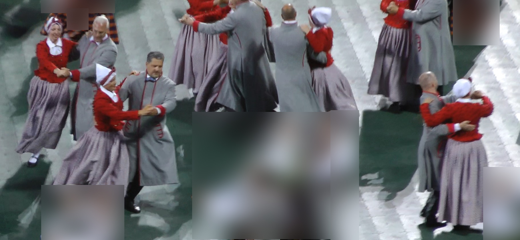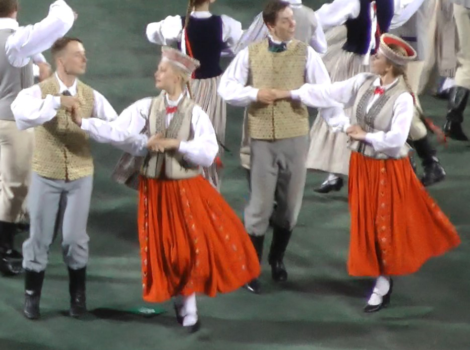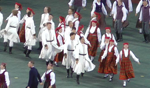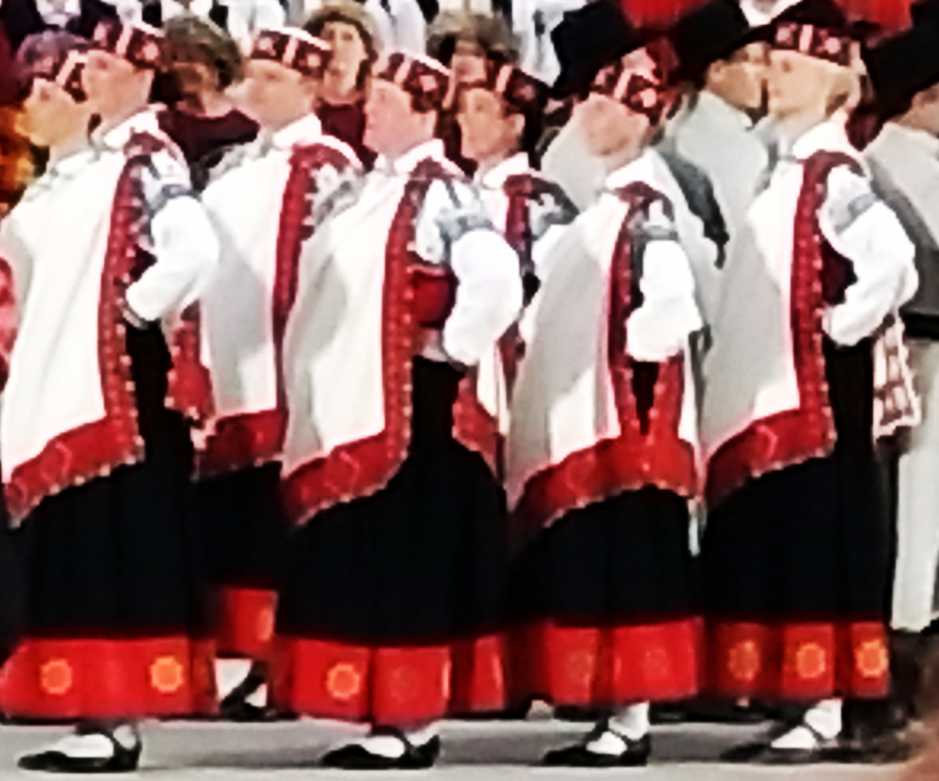 女性の赤い上着をよく見ると黒い突起物の装飾が多数付いている。これがリガの民族衣装の特徴。写真は踊りの祭典より。