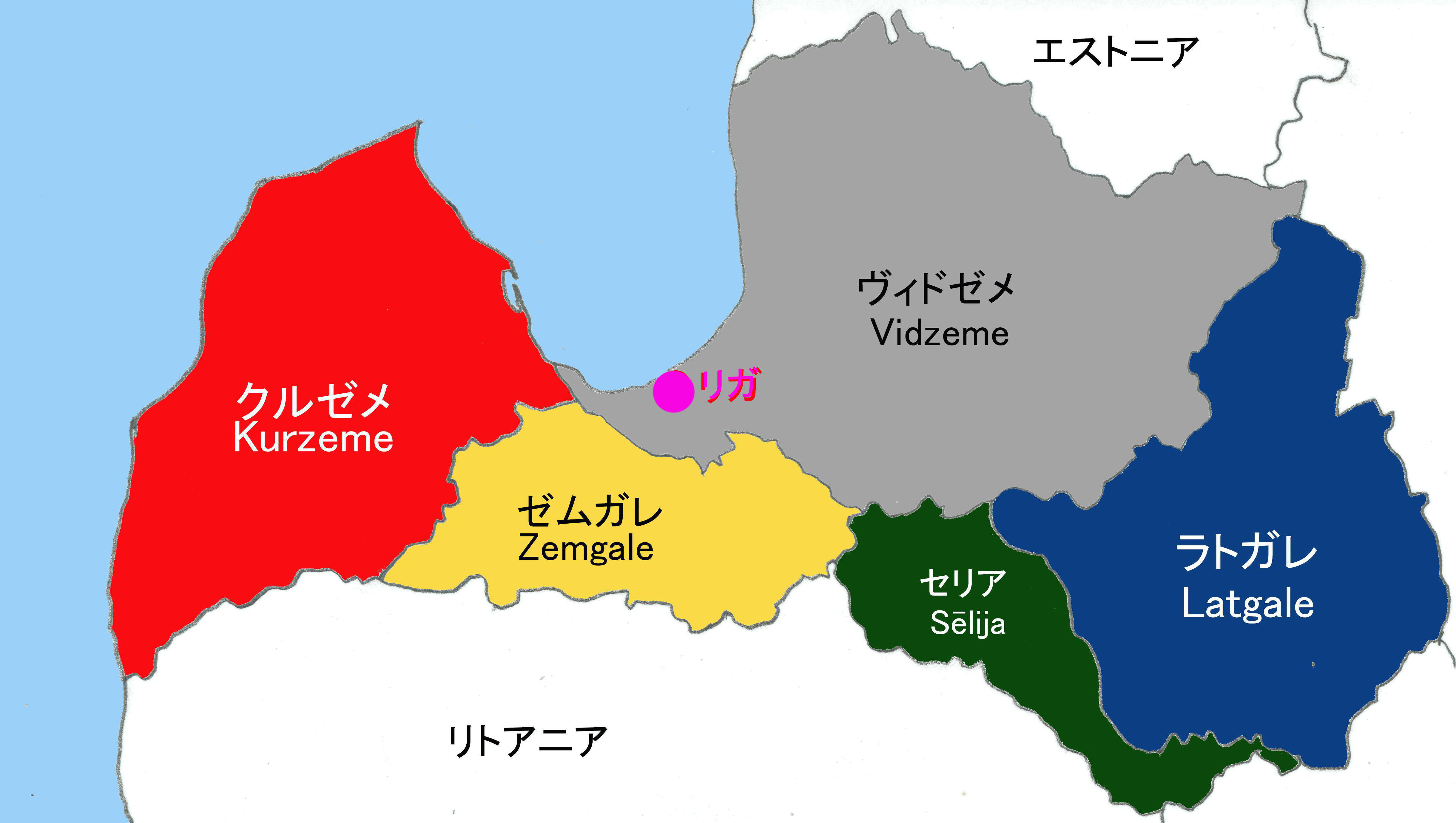 ラトヴィアには、伝統的に「歴史的文化的地域」という地域区分が根付いている。それは下の地図にあるように、Kurzemeクルゼメ、Zemgaleゼムガレ、Sēlija セリア、 Latgaleラトガレ、Vidzemeヴィドゼメ、そして首都のRīga リガである。