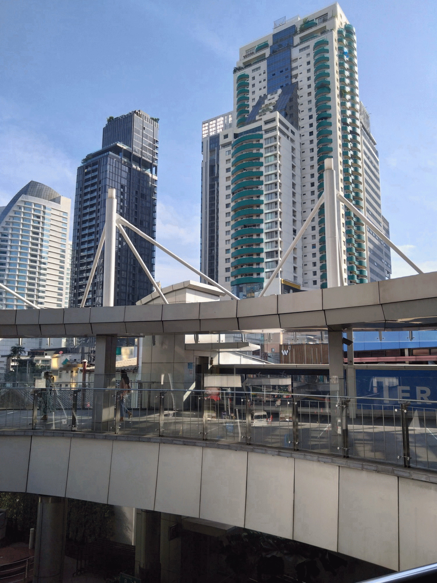 ASOK駅から見えた高層ビル群。右は車の走る道路を渡ろうとする人。