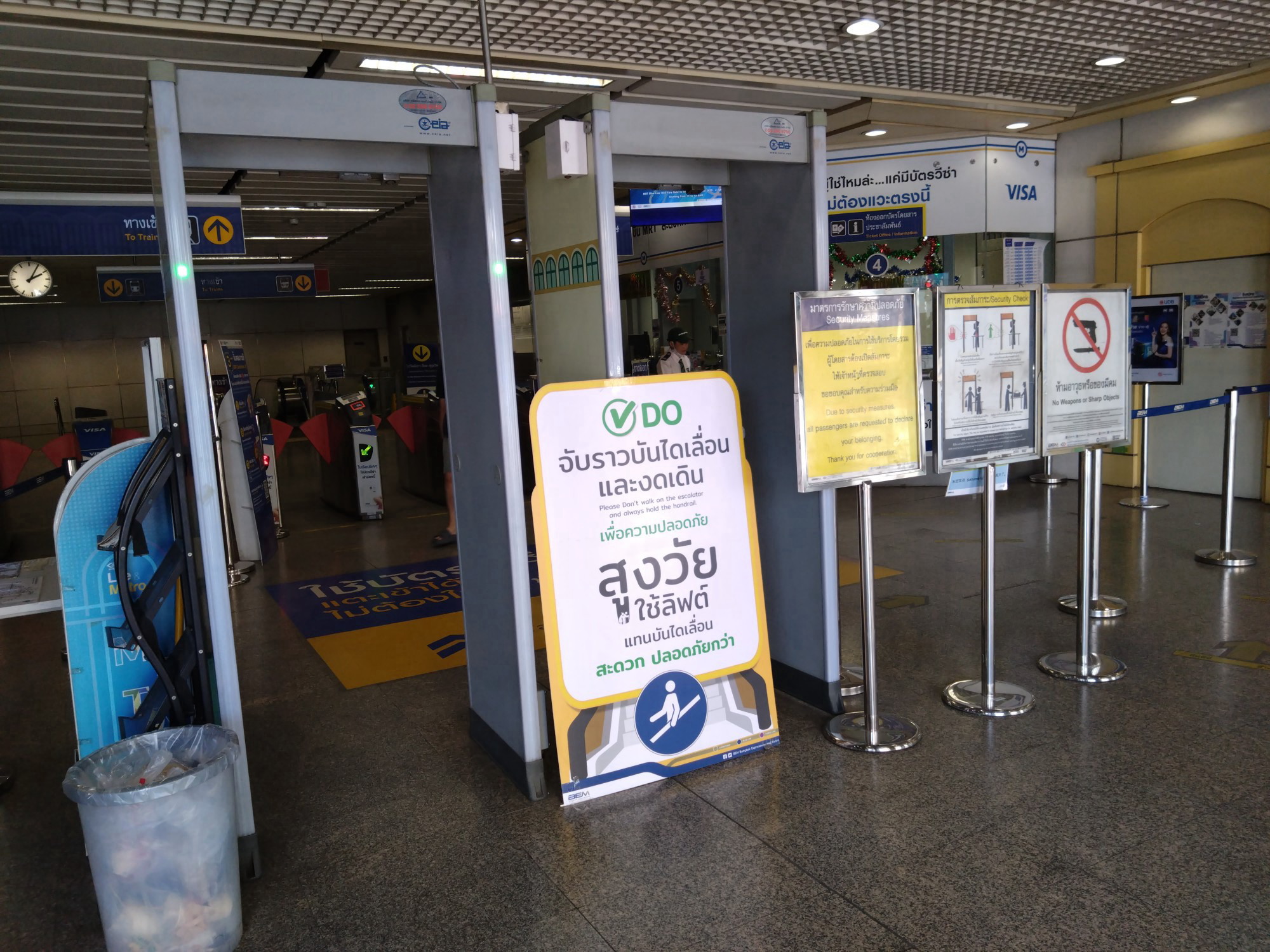 左は券売機。画面のどこか空いているところをタッチすればこの画面が出る。降りたい駅を路線図でタッチすれば自動的に金額が表示される。右上画面タッチで英語への切り替えも。地下鉄駅入口にある「セキュリティチェック」。ここを通らないと切符を買っても自動改札に行けない。