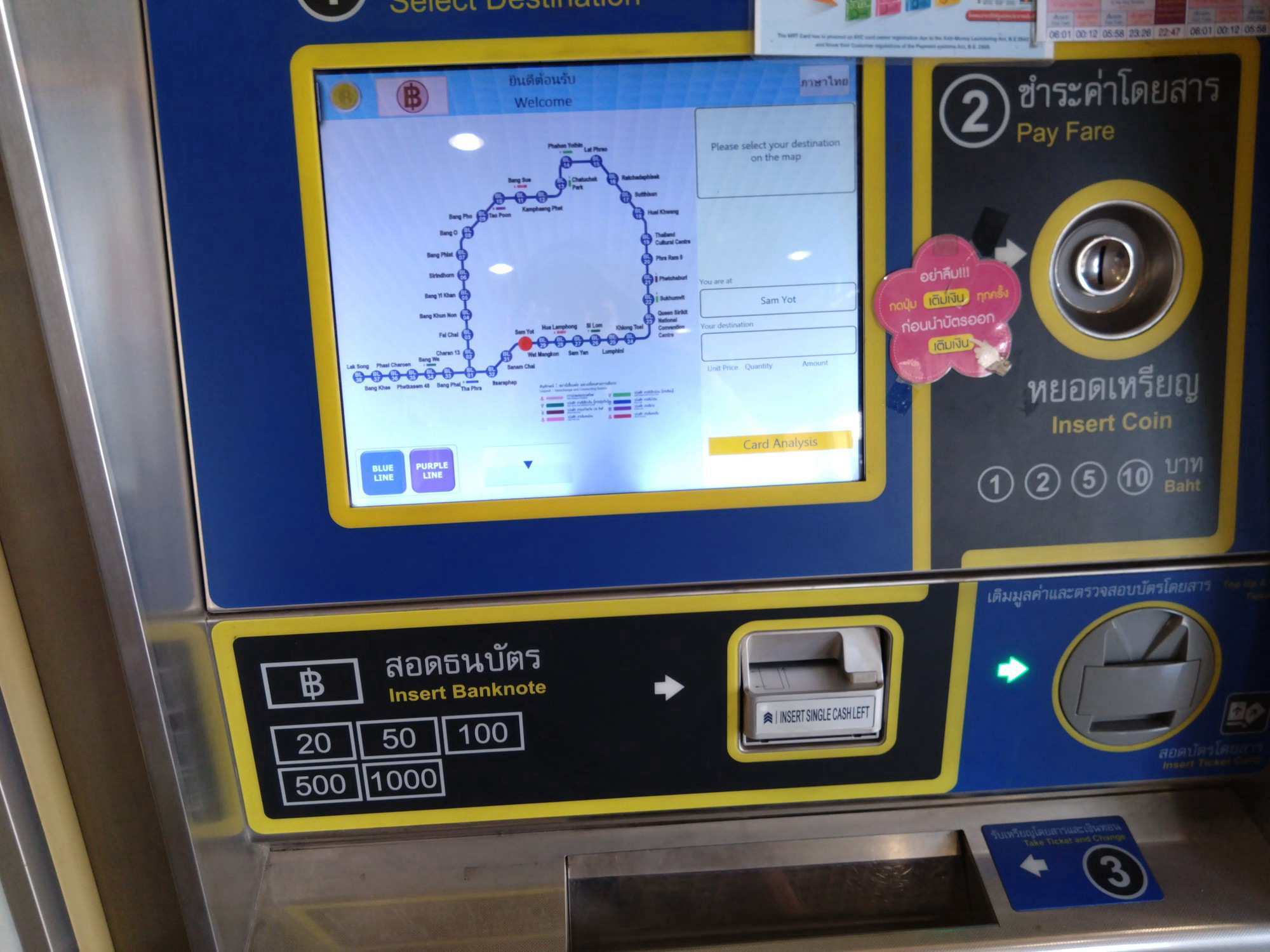 あとほとんどのお寺や博物館で仏像の撮影は自由です。ただし、『地球の歩き方』にあるように、立ったまま撮るのはいいけれど、仏像より高い位置からの撮影は止めた方がいいです。それからお坊さんの托鉢の様子を撮りたくて朝6時半ころピッサヌロークの街に出たらうまく巡り合えました。ちょっと遠くから撮りましたが、お坊さんからも喜捨されていた方からもクレームはありませんでした。ただし、これはお坊さんの聖なる修行の場面なので本当は止めた方がいいかも。ガイドは「構わない」と言っていましたが。⑥トイレ私はバンコク以外はほとんど個人ガイドを付けていたので、場所に困ることはありませんでした。お寺には必ずあります。また、ガソリンスタンドにもあります。バンコクでは、ラタナコーシン展示館、国立博物館、ムアンボーラン、ワットプラケオに行ったのでトイレはありましたし、地下鉄や高架鉄道の乗り換え駅ASOKの地下にも表示が出ていてありました。ただし、確かめたわけではありませんが、『地球の歩き方』を見るとトイレが無い駅も多いとのことなので気を付けた方がいいです。これらのトイレは皆「個室」は洋式トイレで水洗です。「タイ式」のものは見ませんでした。トイレットペーパーも付いています。ただし、「紙は流すな」の注意書きがほとんど、用済みの紙は脇の箱に入れるようにしなければならないのですが、日本人の身に付いた習性でつい便器に落としてしまいます。でも水が詰まって大騒ぎになったことはありませんでした。日本のコンビニで売っている「流せるティッシュ」を必ず多めに持って行った方が無難です。なお、チェンマイで泊ったチャラナンバー6ホテルには、私にとって海外初のお尻洗浄・乾燥機が付いていました!! そのかわり三国国境トライアングルでは、自力でそばにおいてあるバケツから水を柄杓で汲んで流すものでした。⑦バンコク市内の電車利用は意外と簡単初めはおっかなびっくりで1人で初めて利用しましたが、1回やってみると以外に簡単でした。券売機に表示される路線図の駅で降りたいところをタッチすれば金額が表記されるので、お金を入れればいいです。ネットの中には「コインのみしか使えず、お札は使えない。」、という記述のサイトが見られますがそれは古い情報です。お札も使えるし、ちゃんとお釣りも出てきます。地下鉄MRTはトークン(プラスチックのコイン型のもの)、高架鉄道BTSはカード式の切符が出てきます。自動改札はトークンはタッチするところがわかるからタッチし、カード式は入れる場所があるから入れれば(直後の取り忘れに注意)自動改札は通れます。地下鉄と高架鉄道とは普通はそれらを繋ぐ通しの切符は買えないのでそのつど乗り替えるときに切符を買わねばなりません。ただし、これも『地球の歩き方』に載ってないことでしたが、地下鉄は自動改札まで行く前にセキュリティチェックを通らねばなりません。私は空港と同じに考え、バッグとスマホは脇に置いて通りましたが、うっかりスマホを取り忘れたことに気付かず、ホームにいたら、親切な駅員さんが届けに来てくれて事なきを得ました。しかし、別のところで、大きなリュックを担いでいる人やスマホを手にしている人がそのまま通るのを見たので、「全身武装」のまま通ってみましたが、全くひっかかりませんでした。探知検度が弱いのか、牽制球なのかもしれません。到着駅から出るとき、普通のトークンまたはカード式切符は自動改札の回収するところに入れれば出られます。他人の様子を見ていれば、どうすればいいかすぐにわかります。