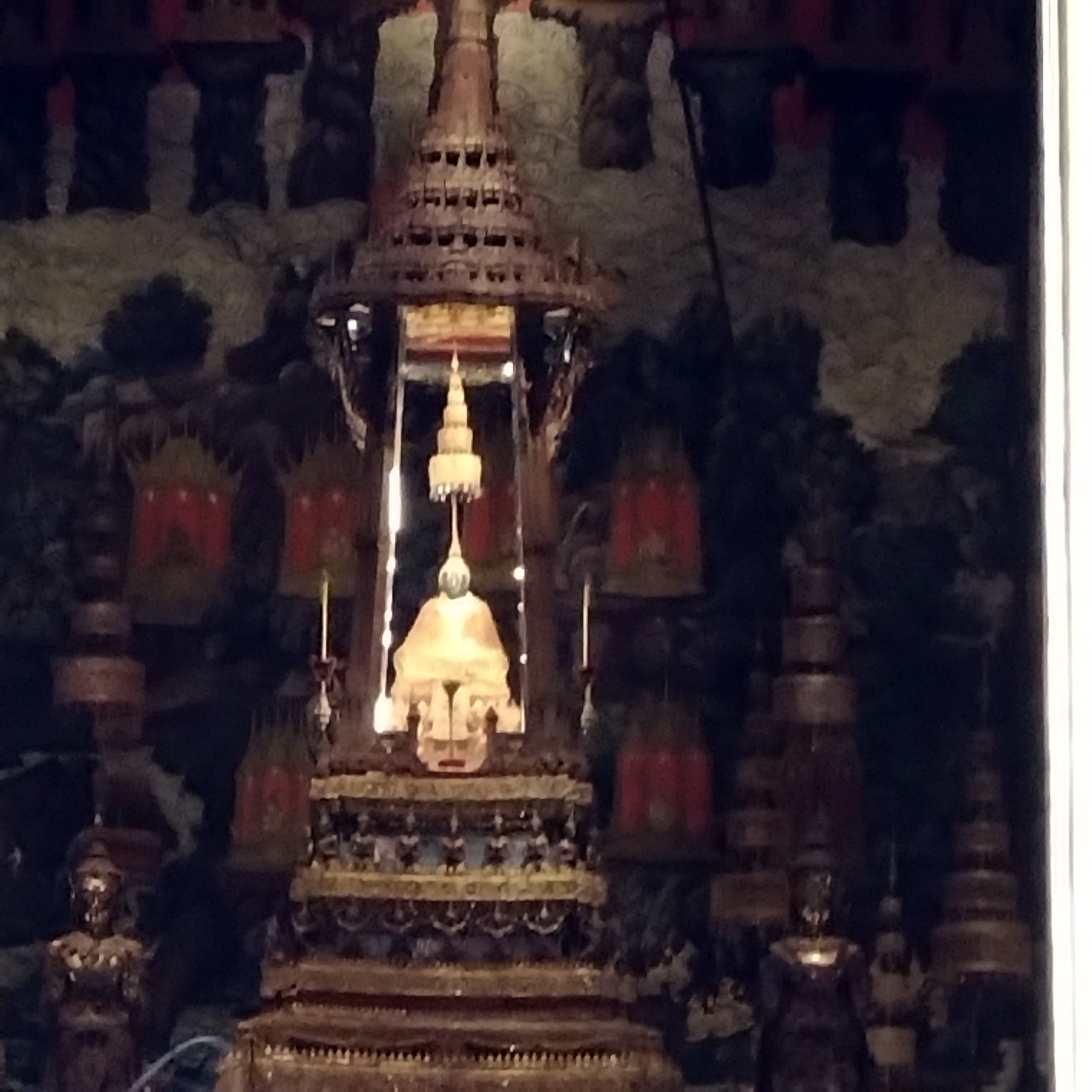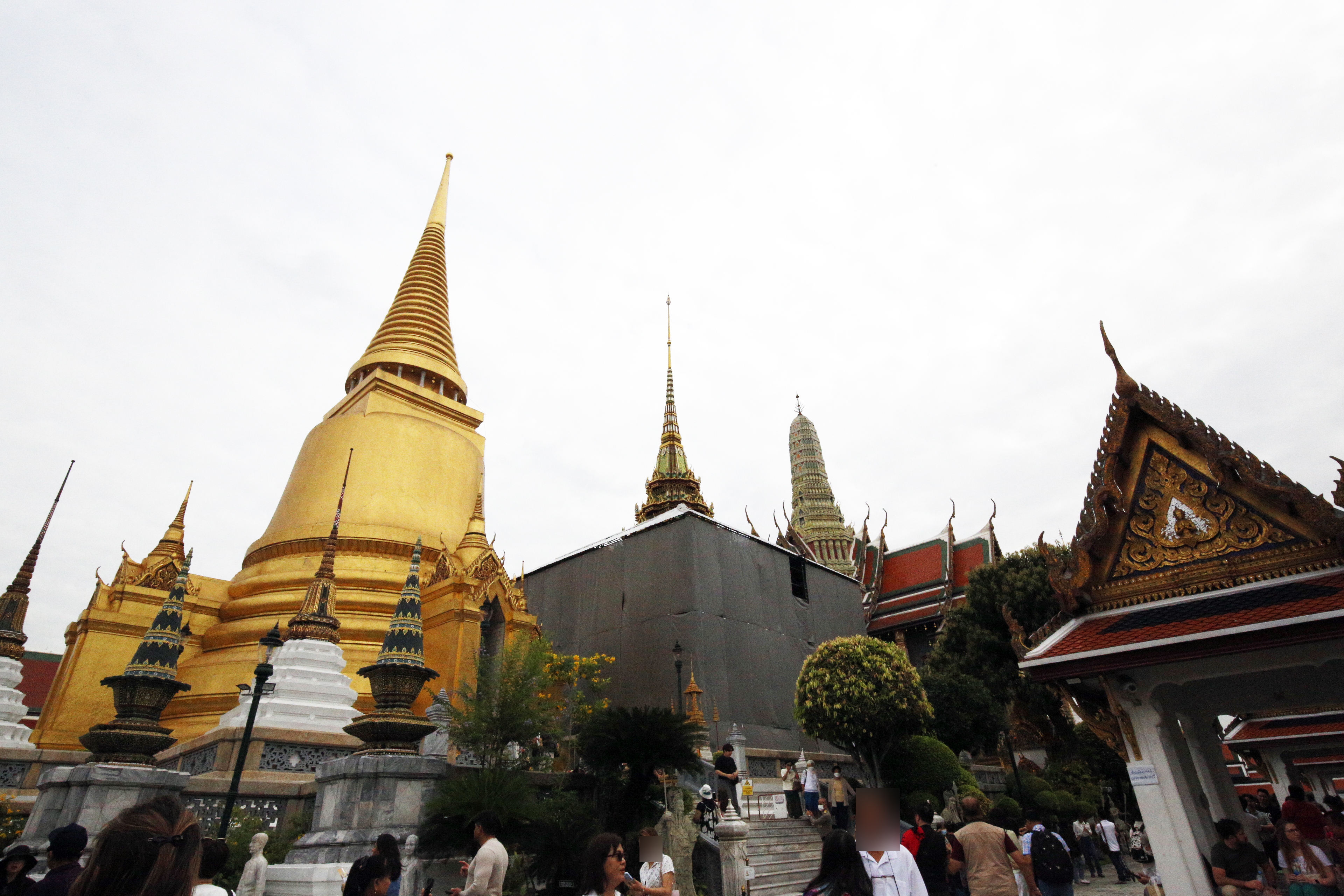 初めて行く人はたぶんここに行く人が多いと思いますが、残念ながらプラ・モンドップが修理中で覆いがかぶさり、定番の3つの塔が並ぶ綺麗な姿の写真は撮れません。それから男性は脛が露出しているズボンはダメ、半袖シャツはOK。女性はノースリーブ、膝上が見えるスカートはダメです。でも、出会った人の中に、アフリカ系と思われる女性で、縄のれんみたいなスカートを穿いていてちらちらと膝上まで見えている方がいましたが、いったいどういう基準なのか、と失礼ながら心の中で笑ってしまいました(見ようと思って見たわけではありません! 誰にでも見えています)。あと本尊エメラルド仏の安置されている布薩堂には靴を脱いであがりますが、大勢がいて靴を置く棚もたくさんあるので、後で困らないよう、靴を置いた棚の番号(棚の上に貼ってありますが、その棚が番号順になっていないのでこれも要注意)と寺の建物との位置関係・場所をしっかり覚えておくこと。私は番号1番はおぼえていたけど、その場所がわからなくなり10分近くも探し回って焦りました。エメラルド仏はお堂内部では係員が何回も何回も「No photo!」と言っていたのに、皆外に出てから、空いていた正面の扉の外からスマホのズームで写真を撮りまくっていましたが、これには何のお咎めも無しでした。私も撮りました。ワット全体の入口に「交換ズームレンズ禁止」の注意があったので、200ミリ望遠レンズを重い思いをして担いできたものの、さすがに出せませんでしたが、スマホズームでも薄暗い中のエメラルド仏は撮れますからこの注意は意味が無いです。だれが見てもわかる望遠レンズへの牽制球です。