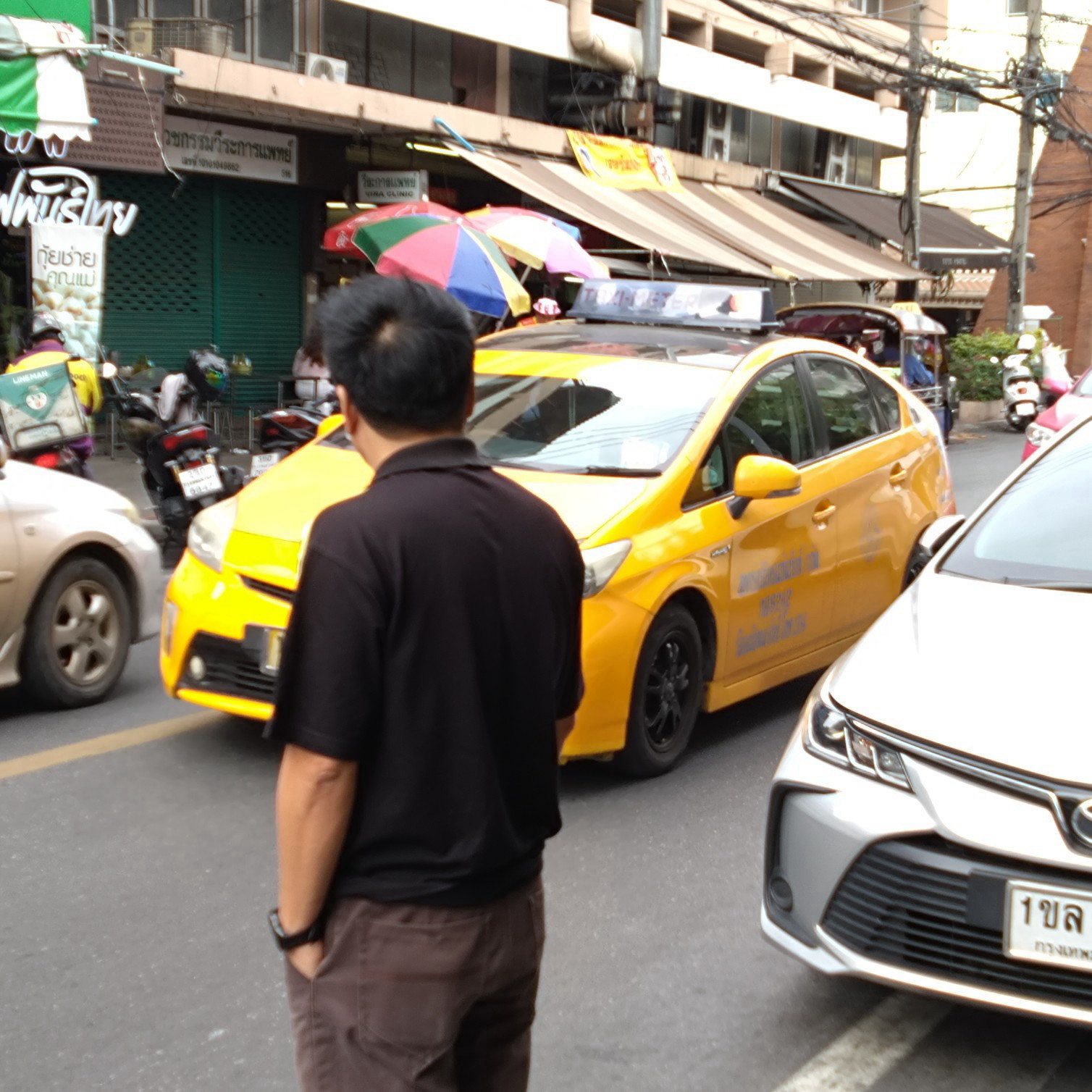 もし、あなたが、「日本より経済的に遅れた国だ」というイメージ、「窓のほとんどないソンテオ、トゥクトゥクが走っている国」「屋台が雑然と並ぶ町」のイメージで行ったらバンコクの空港からの道路で、立ち並ぶ高層ビル、タワーマンションが連続する光景に驚くでしょう。東京の新宿西口ビル群、六本木、東京駅近辺、湾岸がどこまでも広がっている感じ。ひょっとしたら東京より多いかも。それから自動車の多さ。またバイクも。イメージでは道路は自動車8にバイクが2でしょうか? 経済的概観は完全に先進国と言っていいかもしれません。だけれど、現地ガイドが言っていましたが「車優先」とのこと。信号そのものが日本に比べれば少ないし、特に歩行者用信号は極めて少ないです。歩行者用信号はすぐ赤に変わります。横断歩道の明示も少ないです。歩道橋は1回も見ませんでした。それでもとにかく歩行者用信号を見つけて渡るのが一番。どうしても見つからなければ、お勧めしたくないけど、地元の人がやるみたいに、車の間をぬって道路を横切るしかありません。必ず地元の人と一緒にやってください。彼らは日常茶飯事で慣れていますから。地方にいくほど歩行者用信号は少なくなります。これらの点ではタイはまだ「発展途上国」。自転車に乗っている人はほぼ皆無。自転車はこれでは危なくてとても乗れないでしょう。海外に行く人は、当然スリや置き引き、声を掛けて来る人に注意、はおわかりだと思いますが、私は一眼レフカメラを首からふらさげ、交換レンズ2本の入ったリュックを背負い、貴重品入れを肩から掛け、『地球の歩き方』の地図を手にして見ながら帽子を被ってうろうろ歩いていた、という典型的な日本人観光客の姿でしたが、幸い悪い人たちには遭わず、男性だからか、声もかけられませんでした。とにかく一番怖かったのは道路の横断でした。