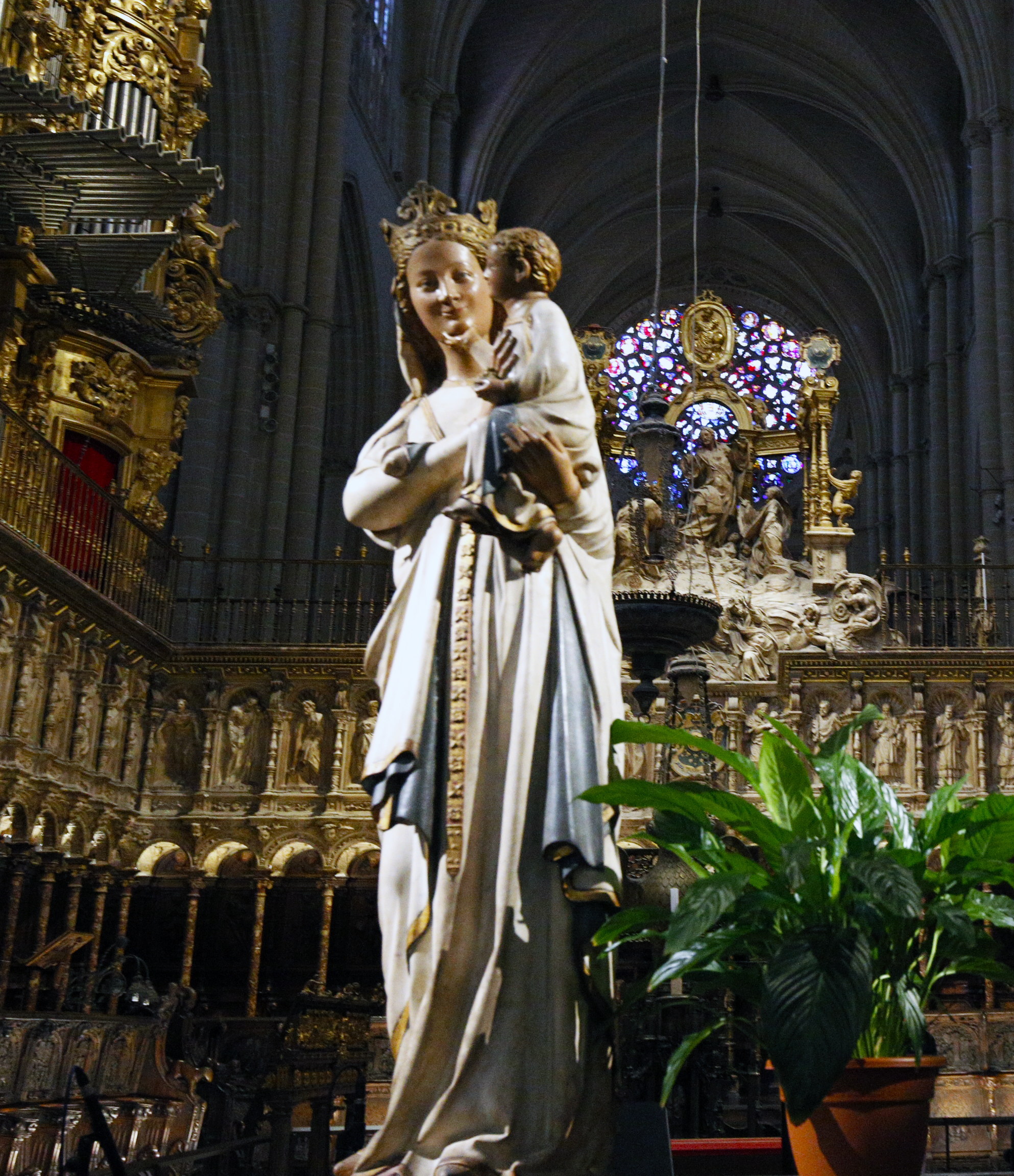 この入り口を入ってすぐのところに「白い聖母像」がある。礼拝用に作られたもので、白い石膏像にベージュの彩色がされていて、高さ153cmである。14世紀に作られたゴシック様式のもので、トレド市長、カスティーリャ王国の公証人であったゴンサロ・ルイス・デ・トレドによって、大聖堂に寄贈されたようだ。