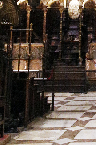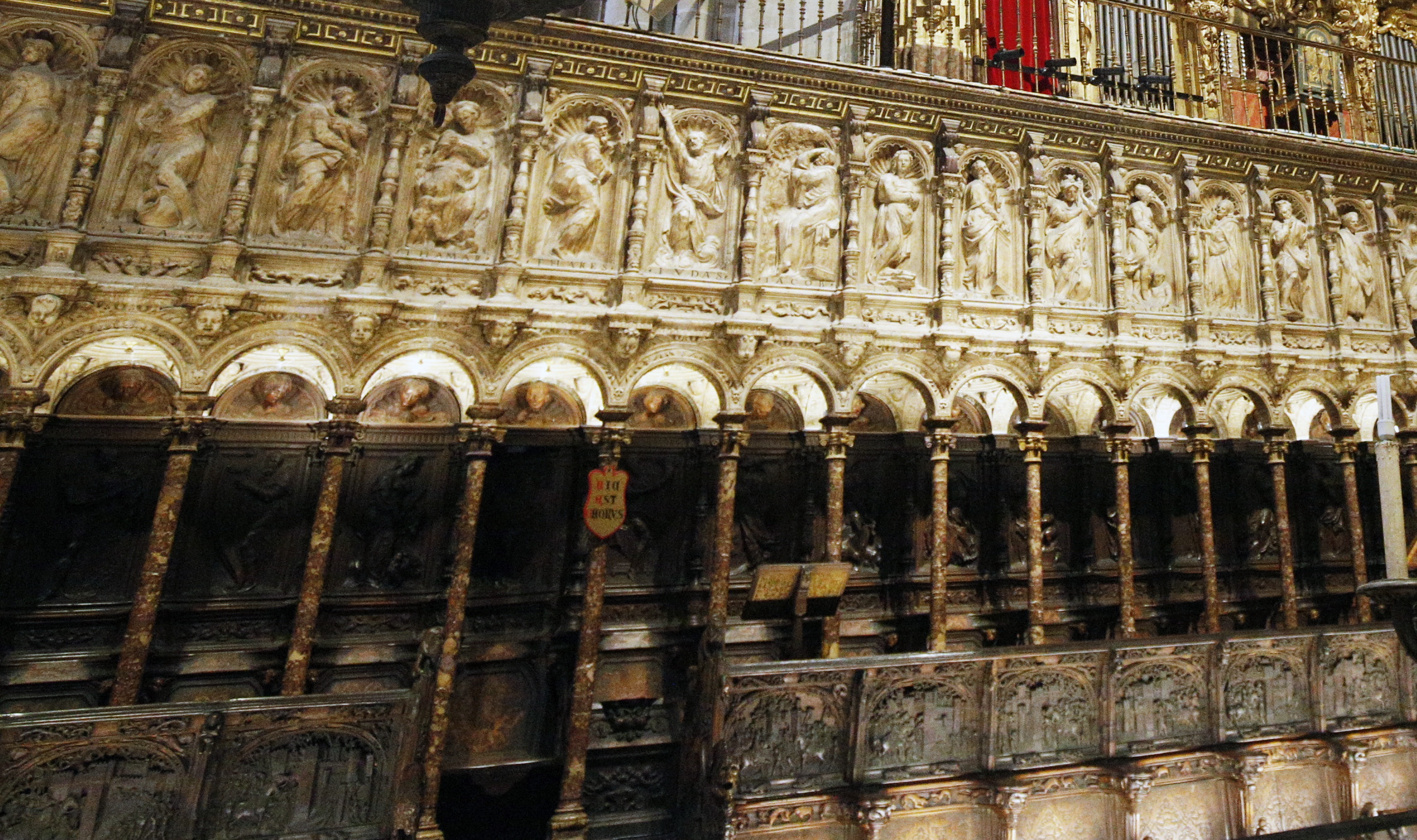 肝心の聖歌隊席であるが、どのネットの説明を見ても「上下二段の席になっている。下席はゴシック様式、上席はルネサンス様式」とある。下の席はすぐ誰でも分るところであるが、「上の席」がどこかははっきりと示されていないし、実際にこの聖歌隊が歌っている写真も見当たらない。私の撮った写真をつぶさに見て行ったところ、床からの階段があり。また座る席と思しきところが下の席の「グラナダ戦争」のレリーフのすぐ上に見られるので、その列柱のあるところの後が「上の席」だと思われる。違っていたら、わかる方、どうか教えてください。