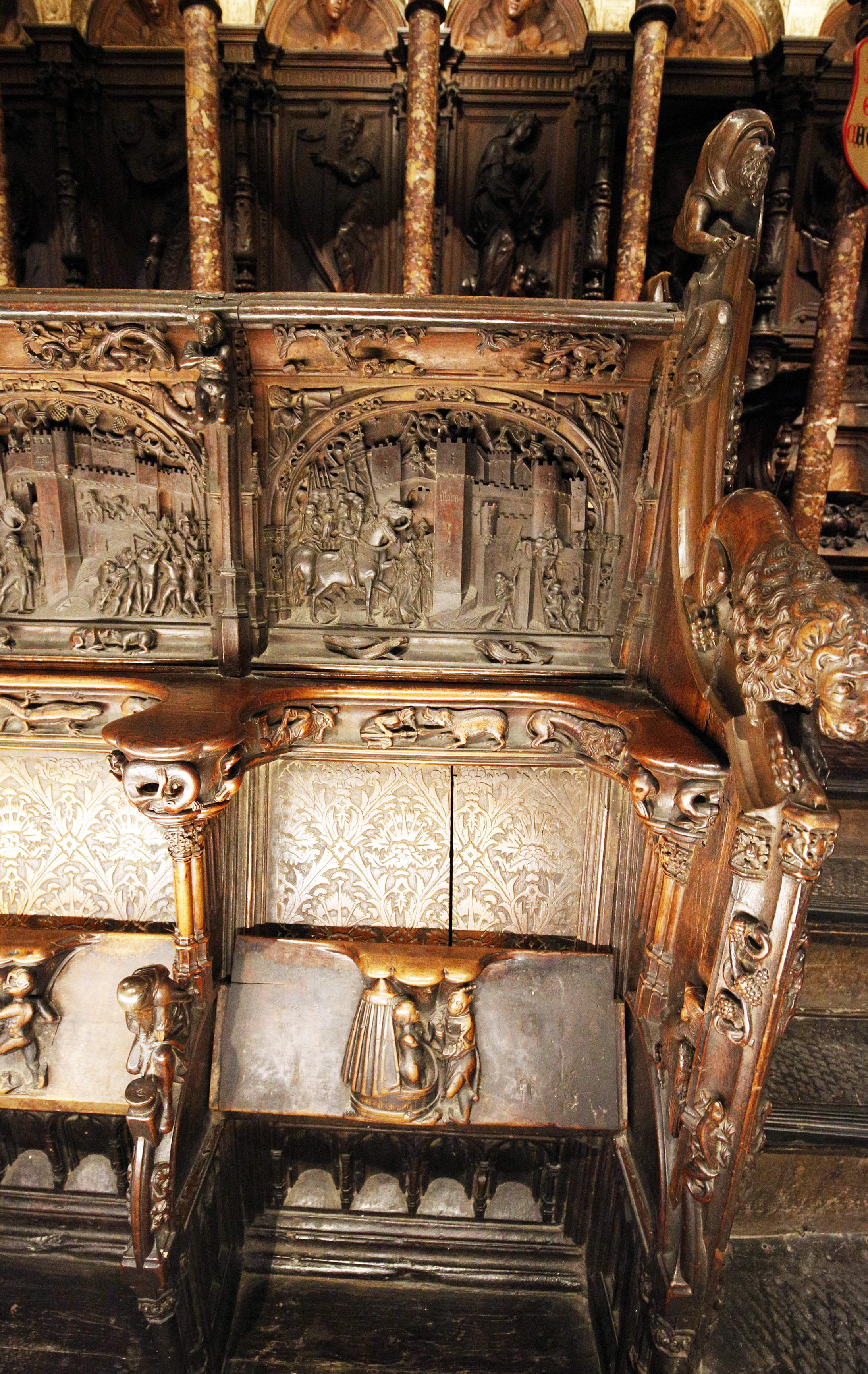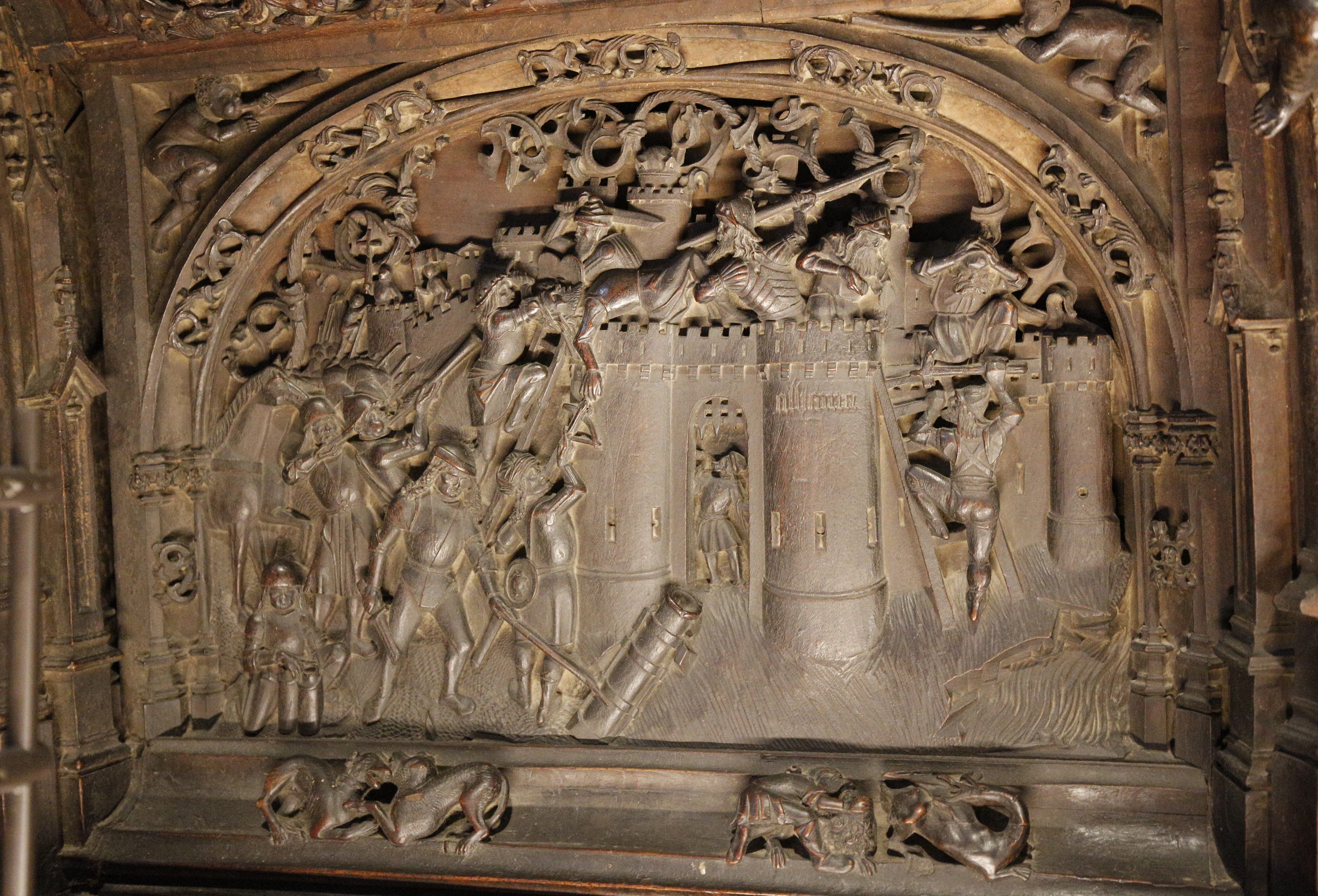 この「下の席」の背もたれのすぐ上に、「グラナダ戦争」(1482-92)の経過を示すレリーフがある。アラゴン王フェルナンド2世とカスティーリャ王イザベル1世の軍隊が、イベリア半島に最後まで残った、アルハンブラ宮殿を持つナスル朝グラナダ王国を破って、イスラムの半島支配を終わらせた戦いである。私は時間をかけて全部のこの写真を撮ったが、どれがどの場面なのかが分らなかったので、激しい戦闘シーンと、カトリック両王のシーンと思われるもののみ示そう。