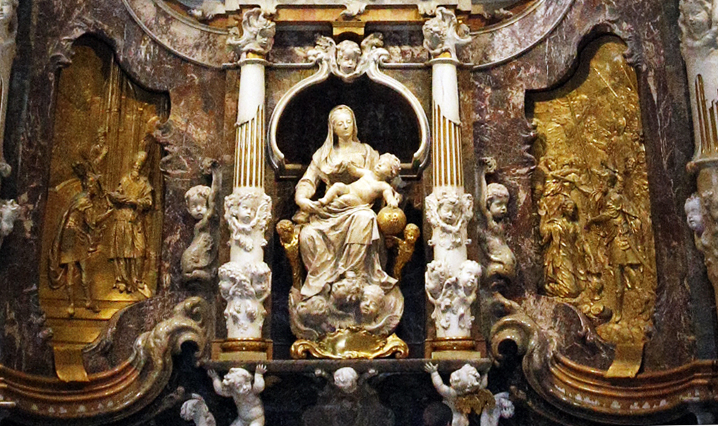 しかし、よく見ると左側のレリーフの人物は1人が兜を被り、もう1人が顎髭を生やしているので女性とは思えない。したがって、このWikipediaの説明での「左右」というのは聖母子像から見ての左右では無いだろうか? あるいはそもそもこのWikipediaの説明はここのレリーフのところでは無いのであろうか?