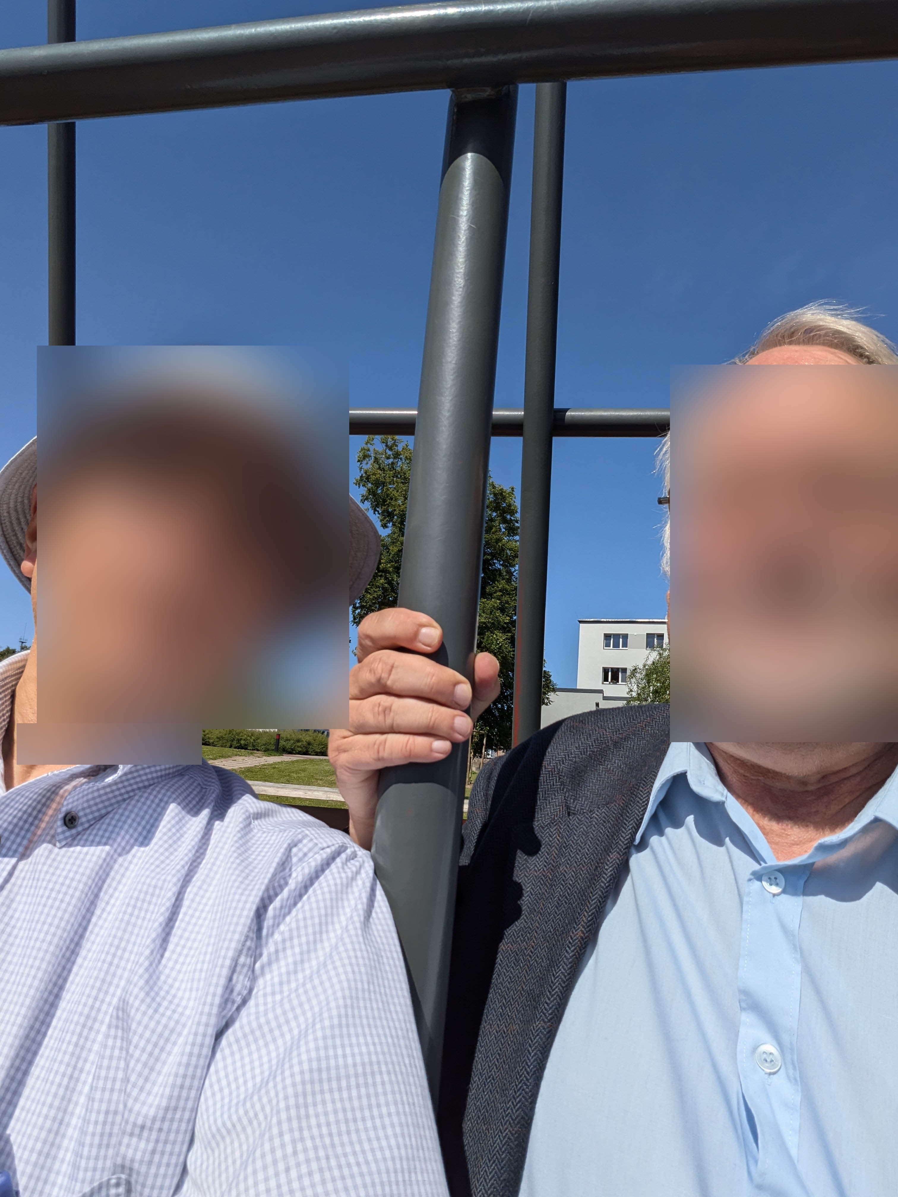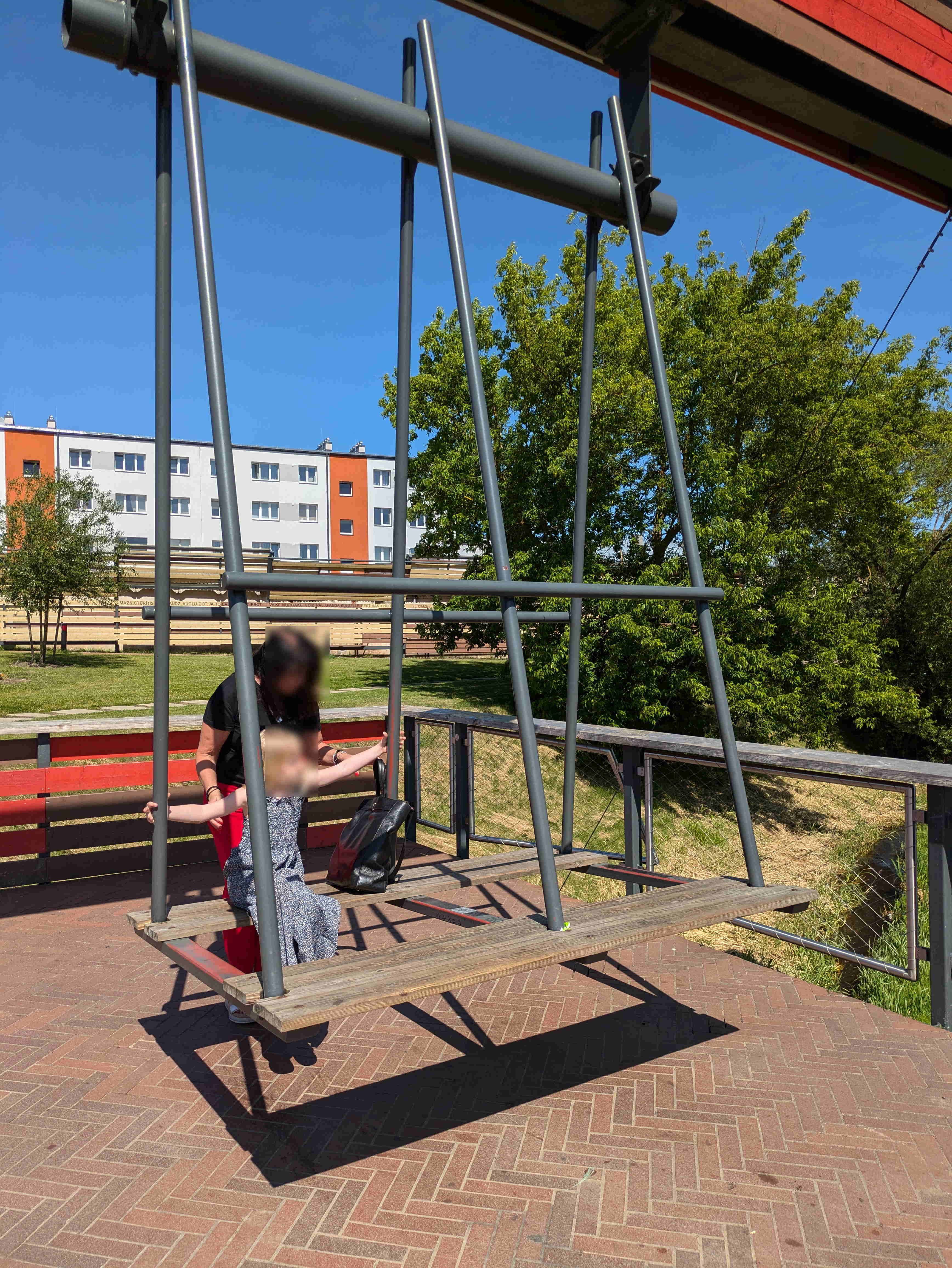 翌日、ヴァルガのタウンホールを見学した後、案内してくれたクートゥマ氏は、別の国境の場に案内してくれました。そして、その近くの国境の上には、なんとブランコが設置されていました。クートゥマ氏曰く、「コロナのとき、国境を自由に行き来できなくなったので、せめてこれに乗って国境を越える気分になろう、と設置された。」とのことです。童心に戻って、二人でブランコに乗りました。