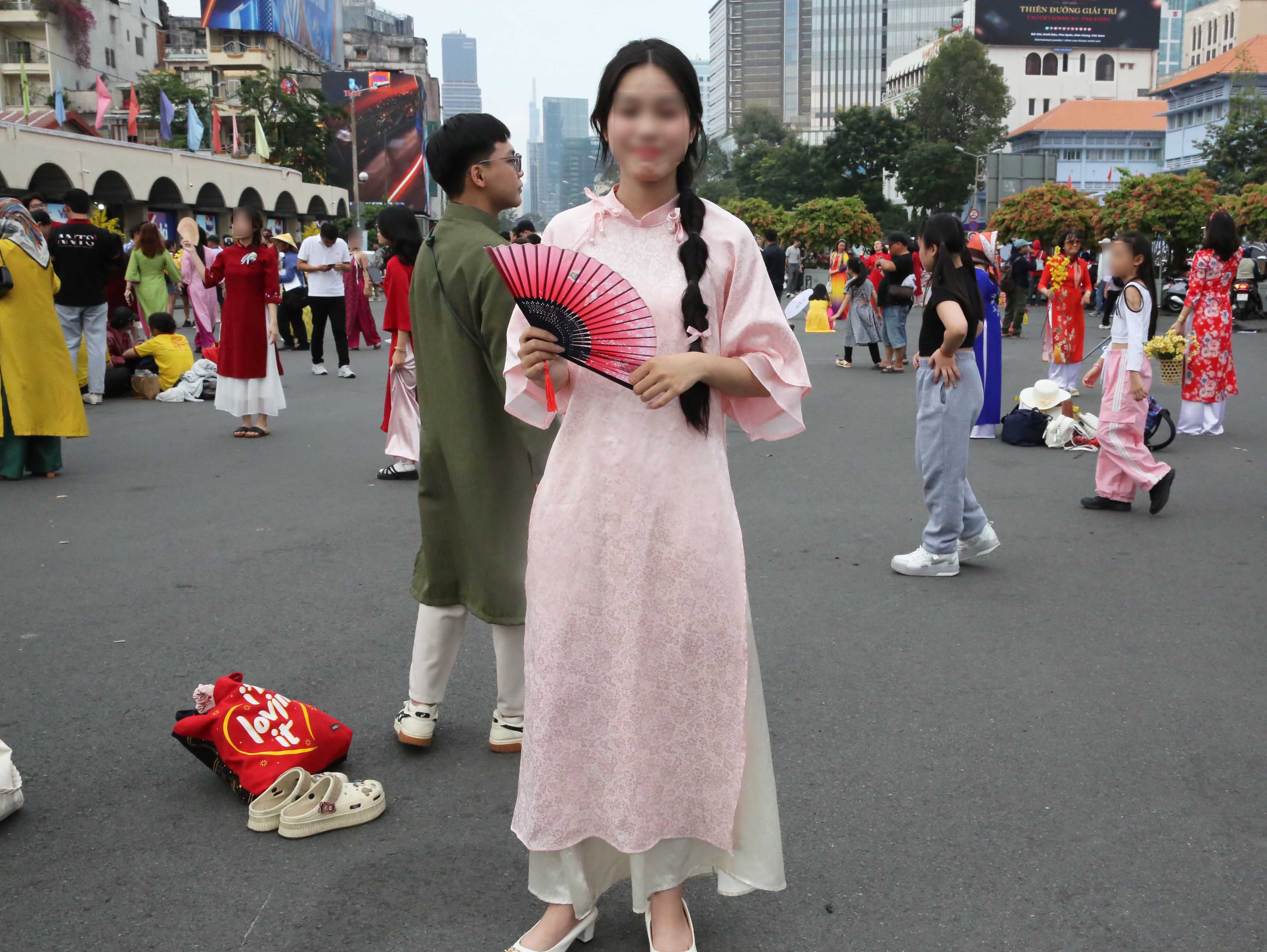 ホーチミンのベンタン市場前の広場にて。この若いお二人連れは、お願いしたら快く撮影に応じてくれた。ありがとうございました。回りも記念写真をアオザイで撮る人で溢れていた。