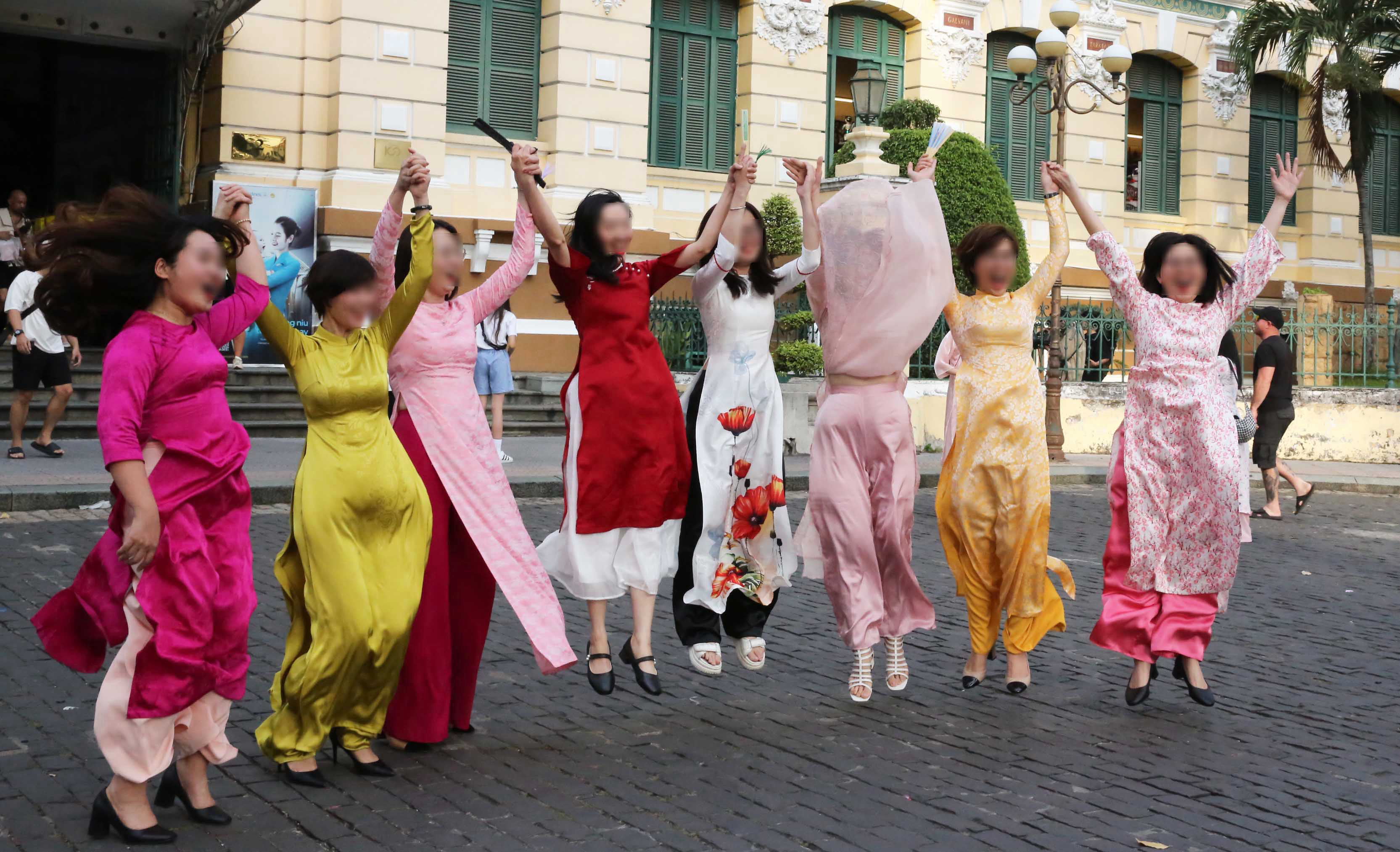 ホーチミンの郵便局前で。記念写真なのだろうが、誰かが「跳びあがってみよう!」と言い出してやったのかな?
