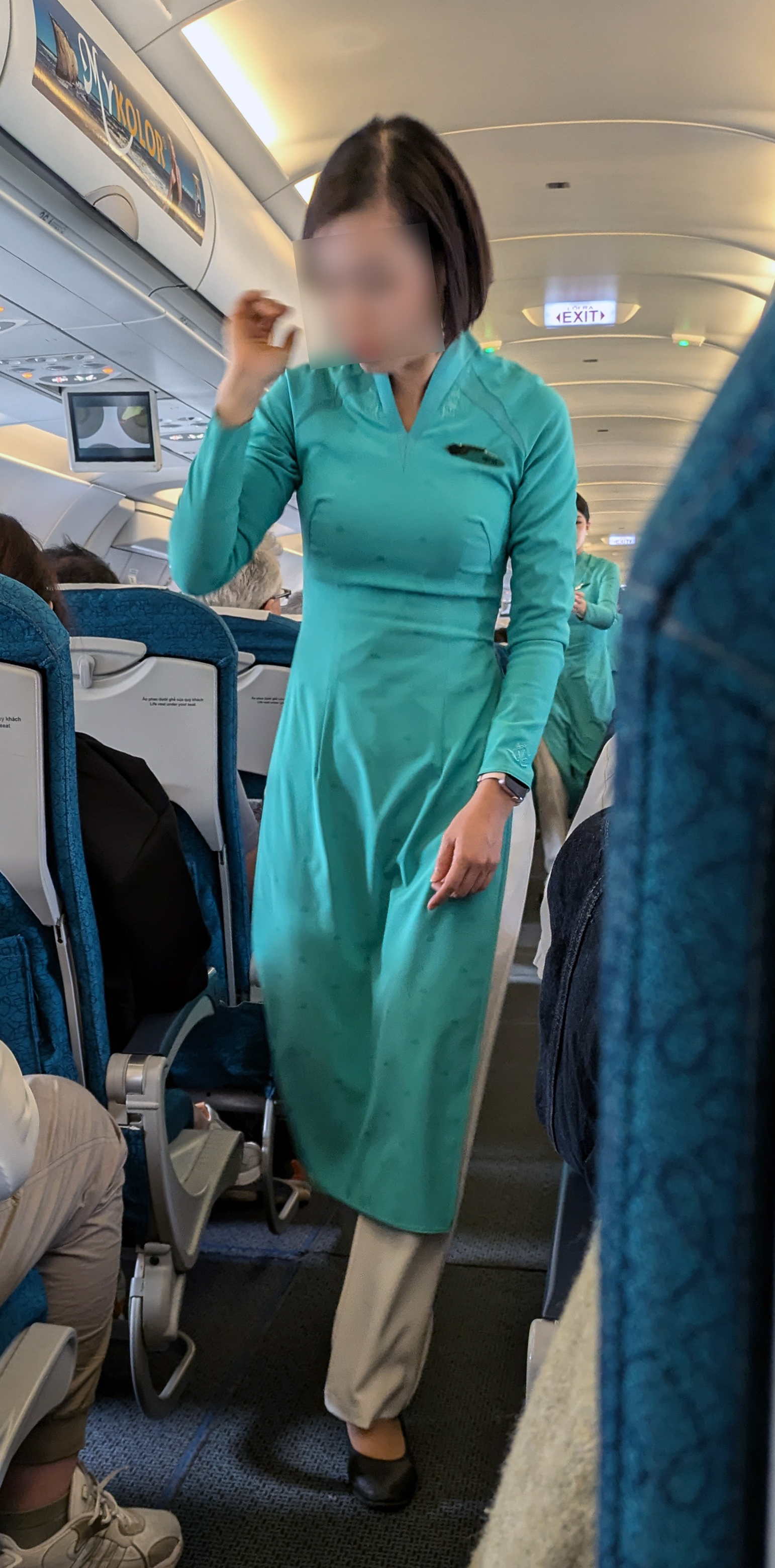 2025年のテト(旧正月)は1月29日からだったが、その準備のためなのか「フライイング」のためなのか、街中に次第に「晴れ着」の民族衣装、アオザイを着る女性が増えていき、男性もそれを着る人々がちらほら現れてきた。私はテトの様子を見るためにベトナムに行ったのではなかったが、1月半ばからのツアーのスケジュールだったため、「民族衣装鑑賞オタク」にはラッキーなたまらないときめきの日々であった。かつては年齢や既婚、未婚などで着るアオザイの色が決まっていたようだが、男女とも皆さんそれぞれ実にカラフルなアオザイをお召しになっていた。まず、ベトナム航空の機内の入口で、緑色が強めのターコイズブルー色のアオザイのCAがにこやかにほほ笑んで迎えてくれた。私の好みの色の1つでもあるその美しさに魅了されると同時に、もうベトナムに着いたような気分になった。なお、チーフCAと思われる方は山吹色のアオザイを身に着けていた。